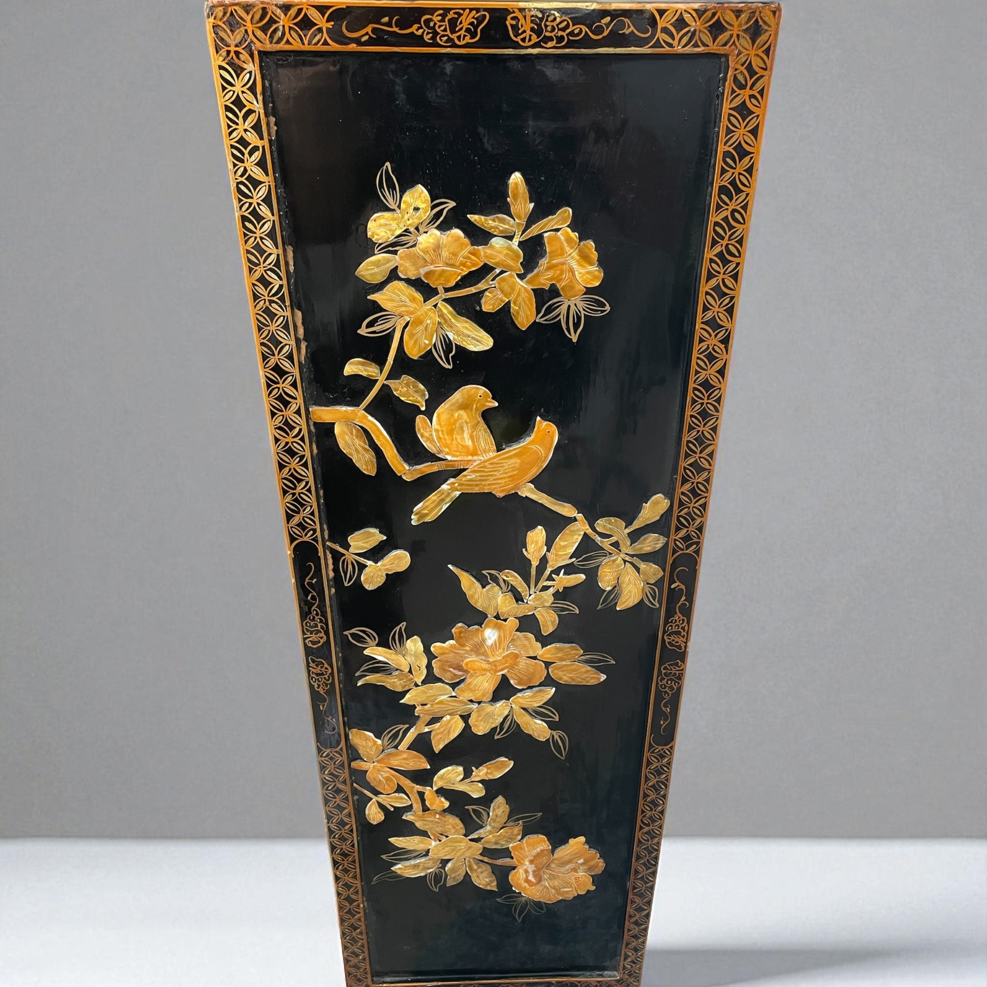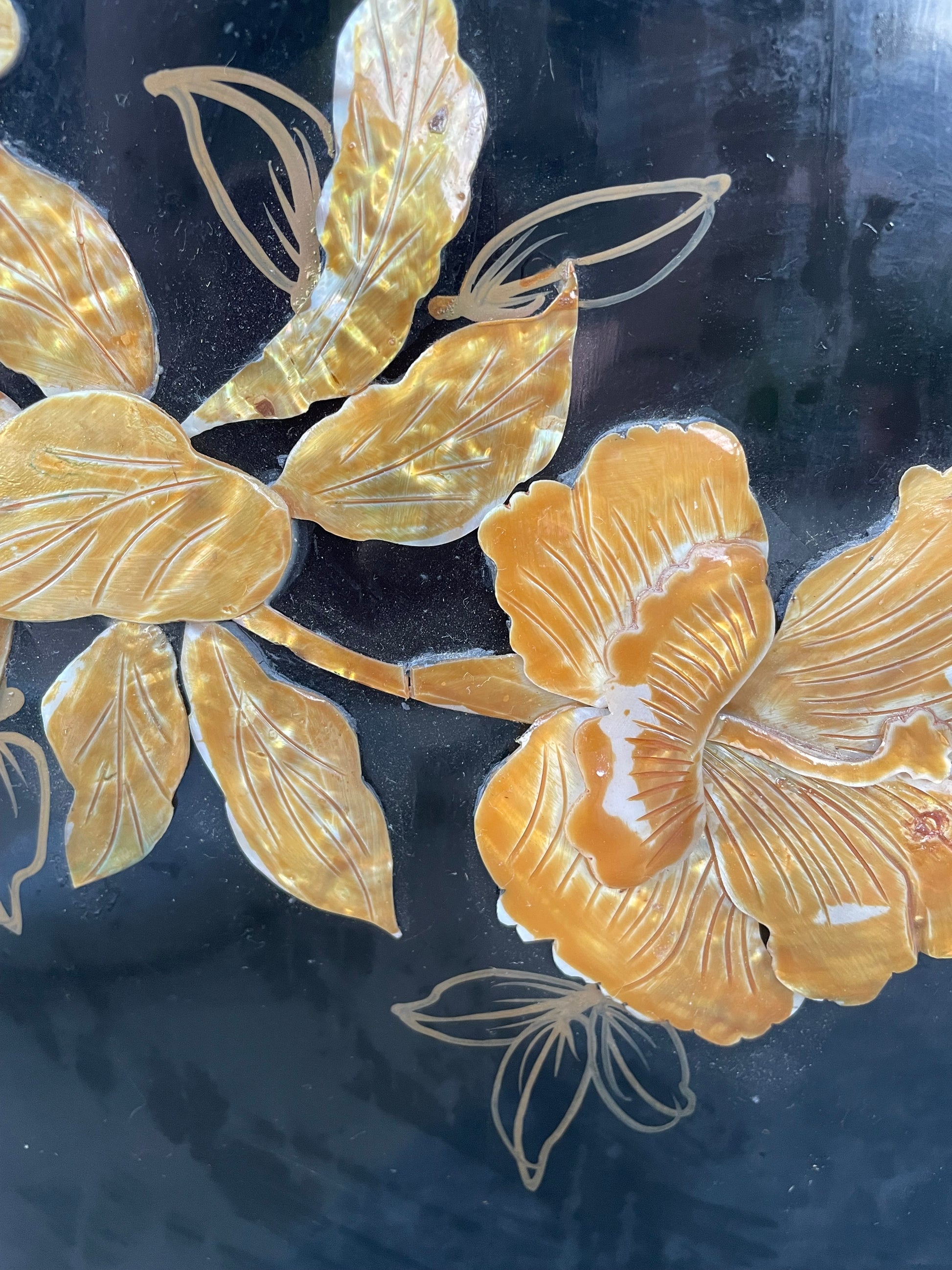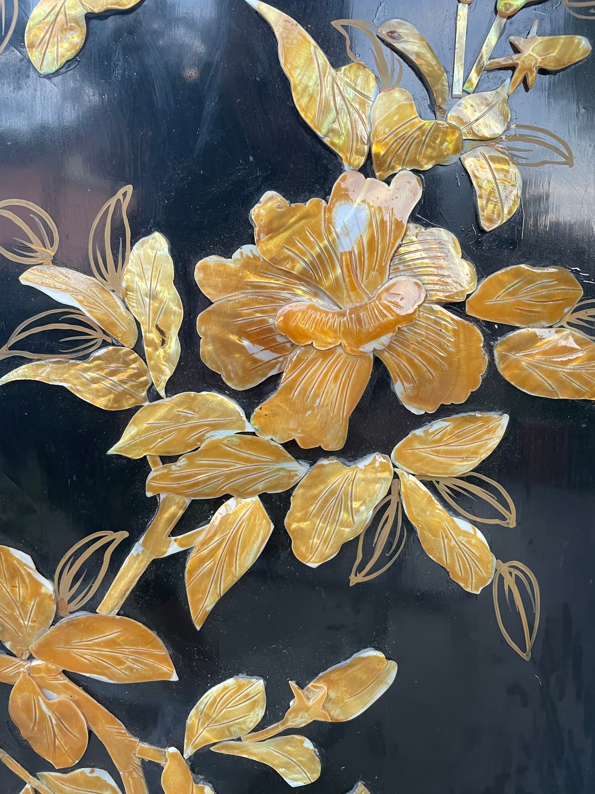 Due uccellini si cercano tra i rami fioriti, sulla superficie lucida e scura di questo pannello in legno laccato nero. I dettagli sono realizzati in madreperla, scolpita e poi dipinta in tonalità dorate, che giocano con la luce creando profondità e movimento. Un oggetto decorativo dall’effetto scenico garantito, capace di dominare la parete anche da solo. Realizzato con cura artigianale negli anni Sessanta, in area asiatica (Cina o Vietnam), questo pannello porta con sé un linguaggio simbolico caro a molte culture orientali: i fiori come auspicio di armonia e gli uccelli in coppia come metafora di amore duraturo e serenità domestica. Nel tempo ha vissuto — e porta qualche piccola testimonianza della sua storia: