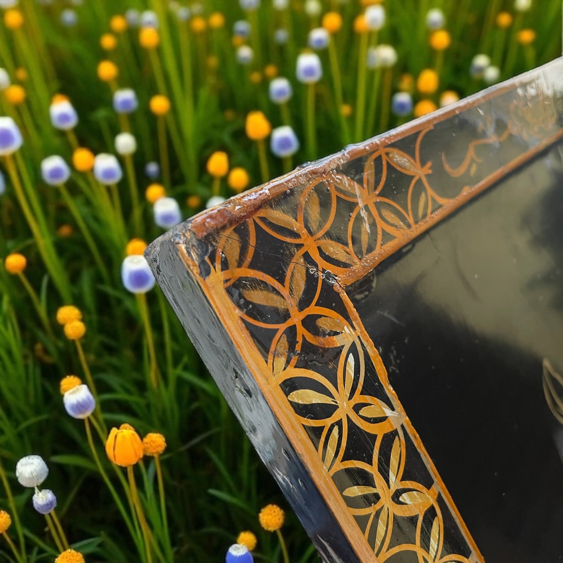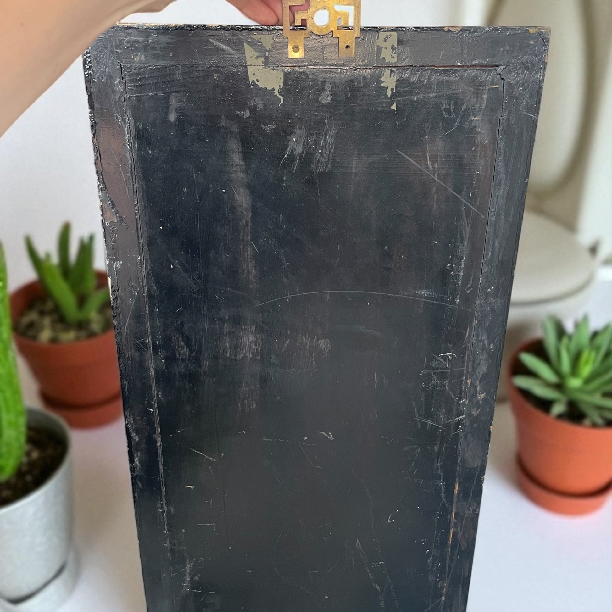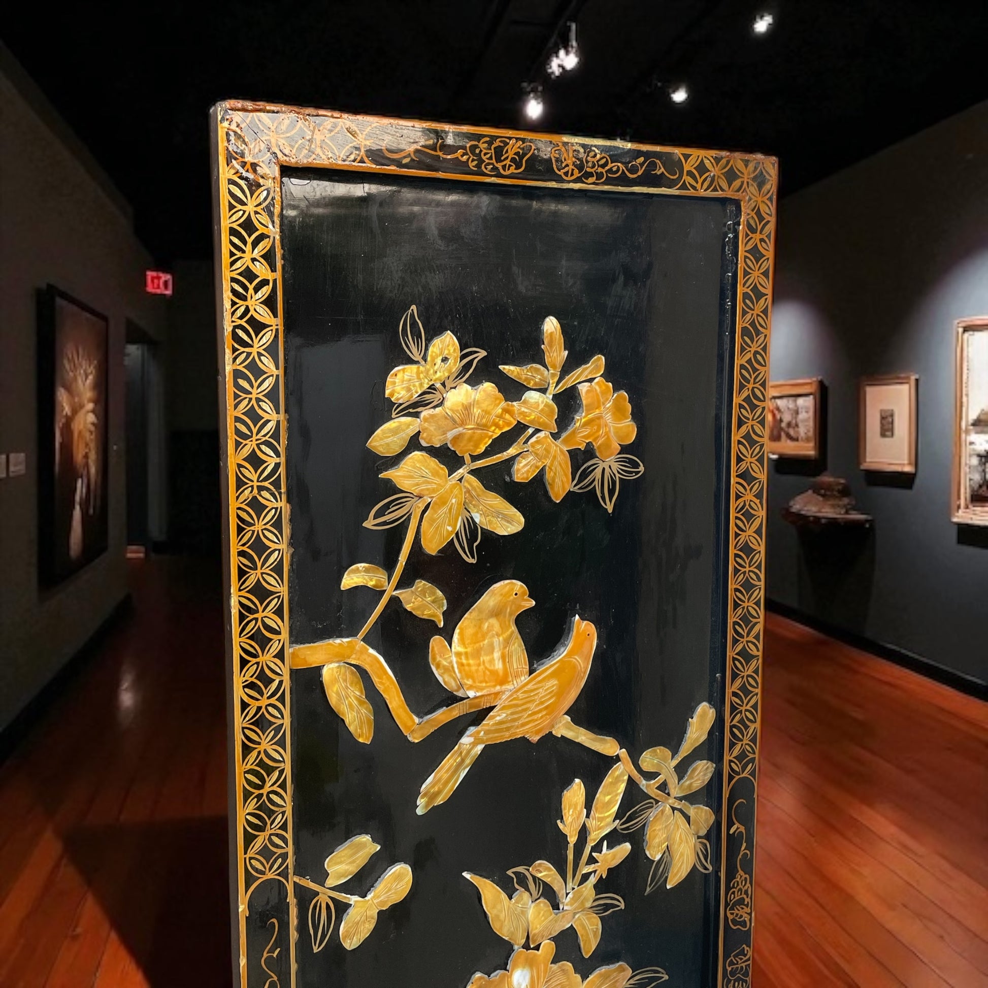 Due uccellini si cercano tra i rami fioriti, sulla superficie lucida e scura di questo pannello in legno laccato nero. I dettagli sono realizzati in madreperla, scolpita e poi dipinta in tonalità dorate, che giocano con la luce creando profondità e movimento. Un oggetto decorativo dall’effetto scenico garantito, capace di dominare la parete anche da solo. Realizzato con cura artigianale negli anni Sessanta, in area asiatica (Cina o Vietnam), questo pannello porta con sé un linguaggio simbolico caro a molte culture orientali: i fiori come auspicio di armonia e gli uccelli in coppia come metafora di amore duraturo e serenità domestica. Nel tempo ha vissuto — e porta qualche piccola testimonianza della sua storia: