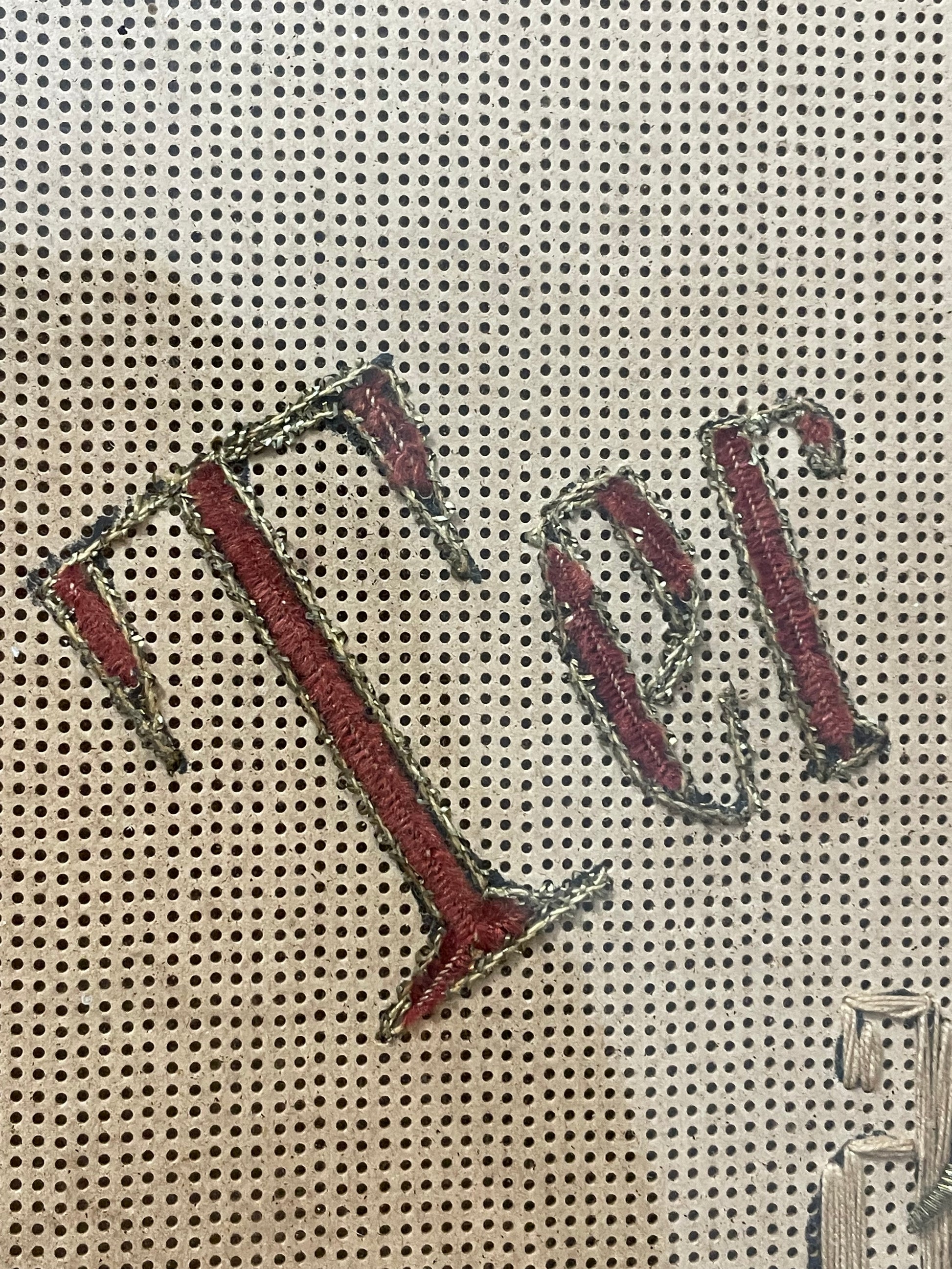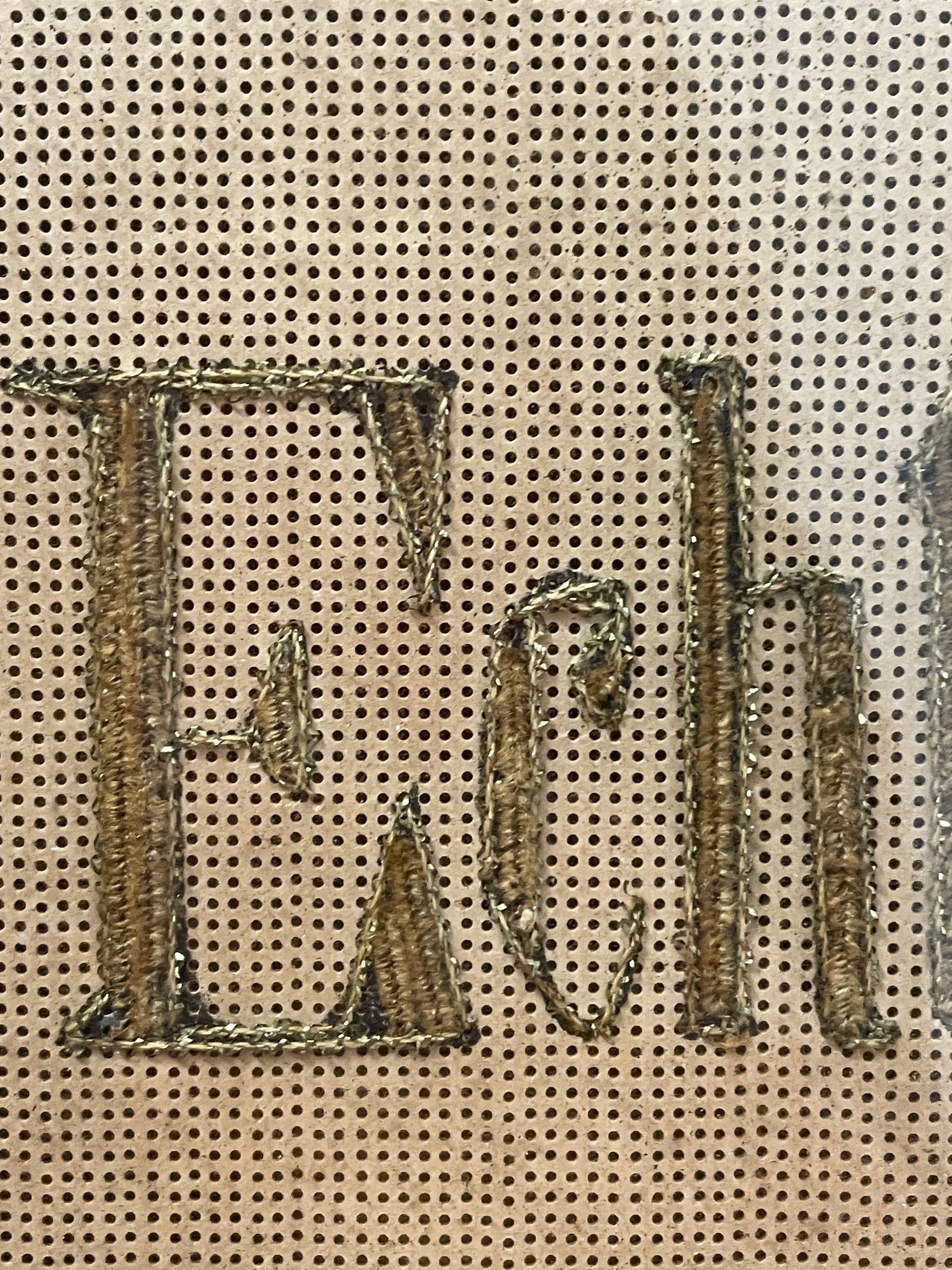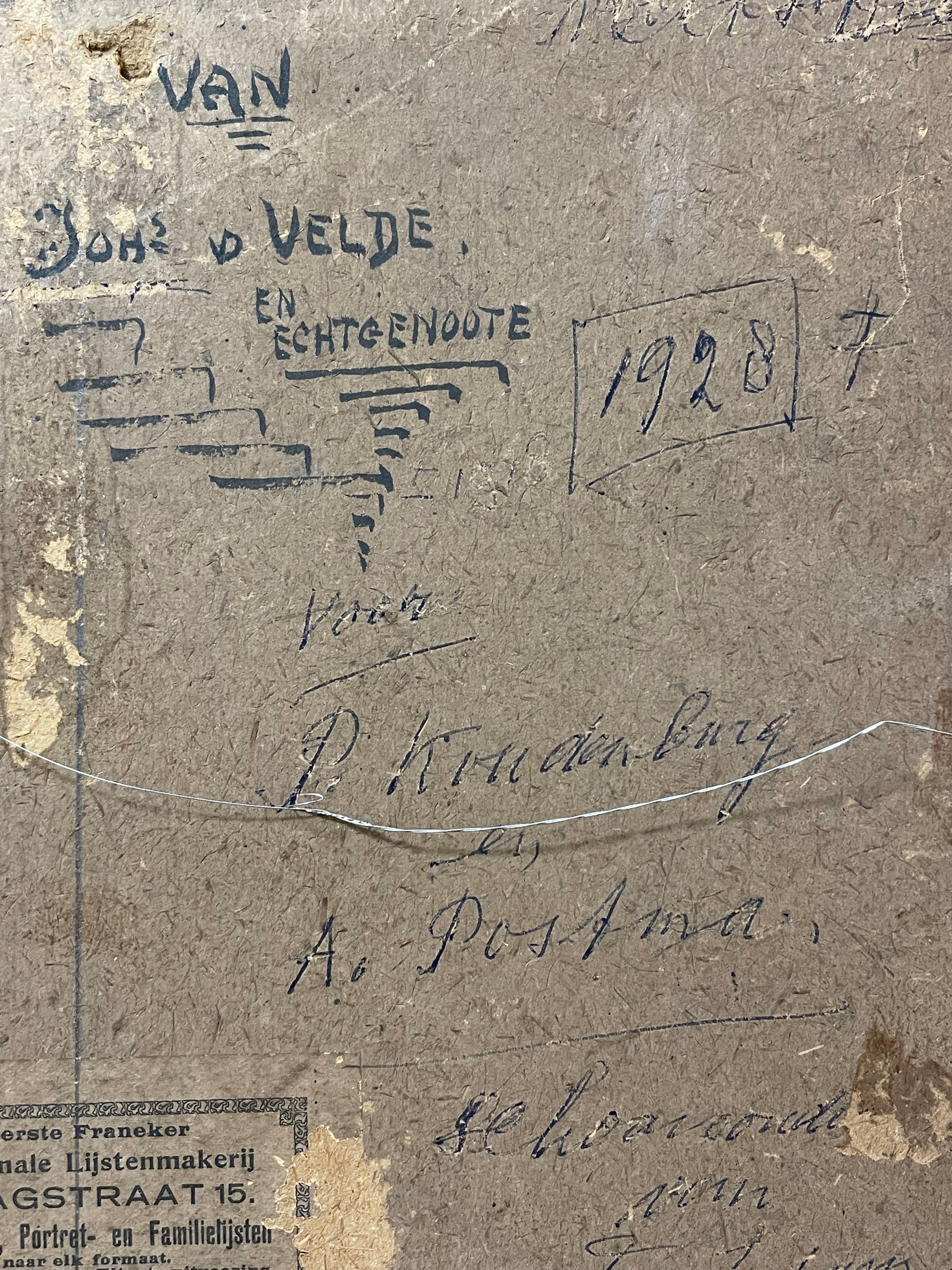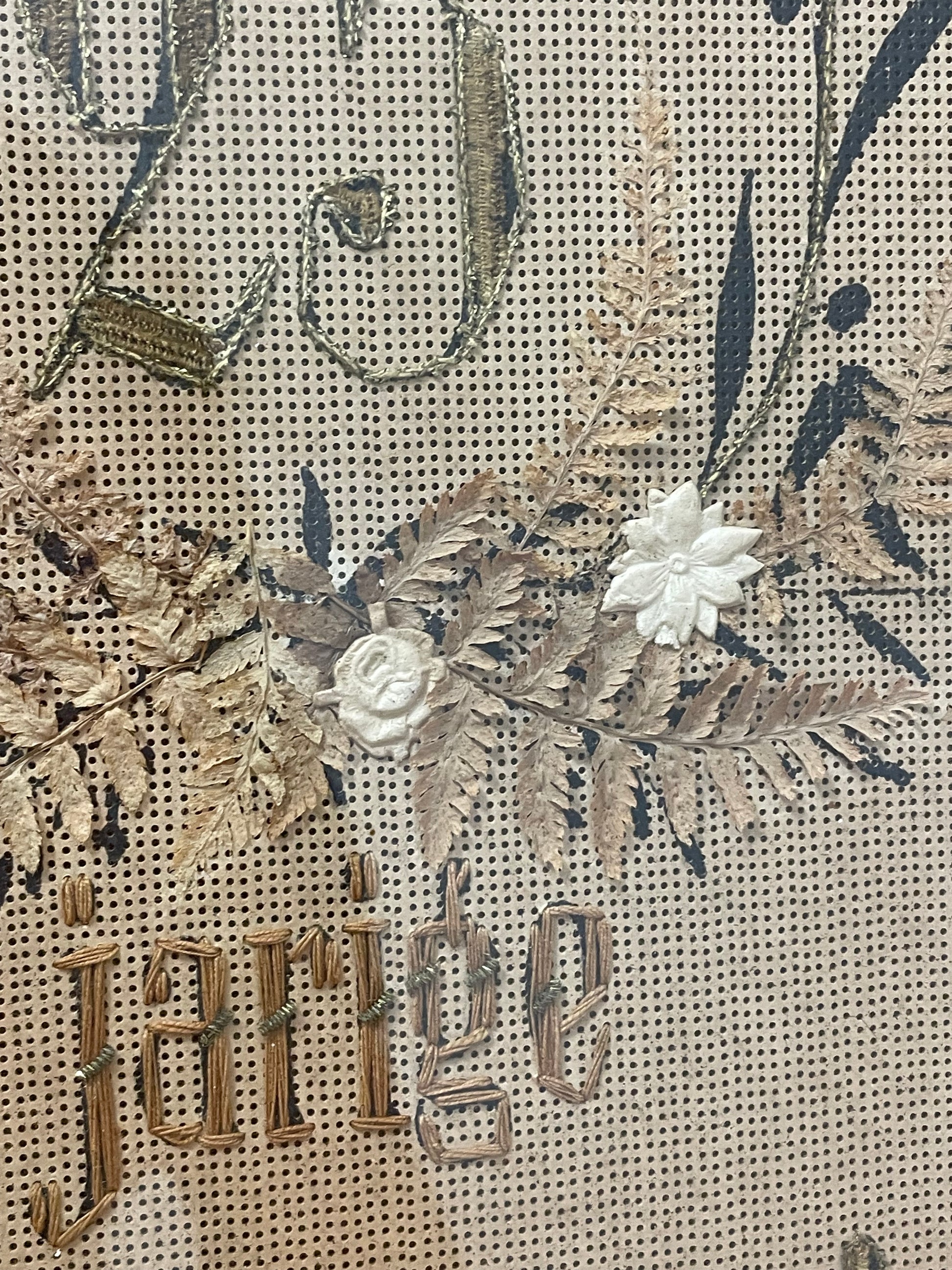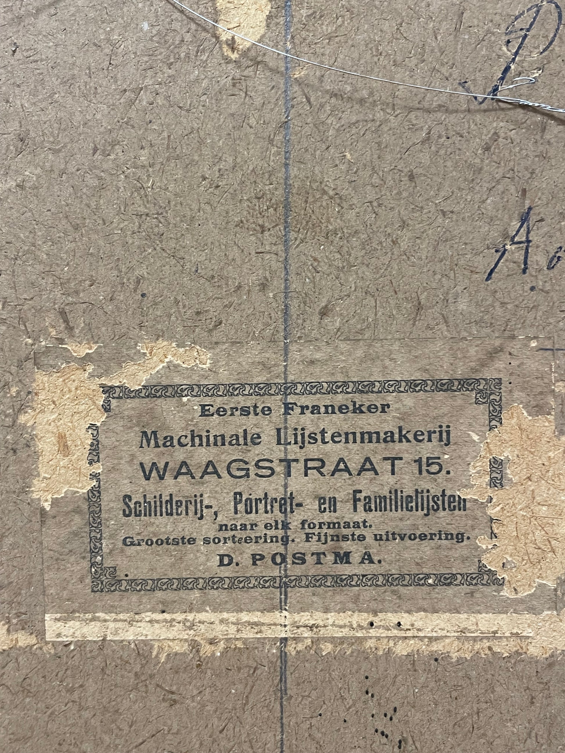 Questa dedica è incorniciata in una cornice originale dell’epoca, eseguita dalla Prima Corniceria Meccanica di Franeker (Eerste Franeker Machinale Lijstenmakerij), un laboratorio storico situato nel cuore della città, in Waagstraat 15 (scritta originale a tergo). Ma ciò che rende questo ricamo davvero unico è l’eccezionale utilizzo di fili d’oro e d’argento, combinati con simbologia vegetale: fiori e steli, fra cui felci, sono stati intrecciati a mano con maestria nella trama del tessuto. Questo dettaglio, raro e sorprendente, non è solo un elemento decorativo, ma un simbolo carico di significato. Le felci, in particolare, rappresentano amore duraturo, protezione e prosperità. La loro natura rigogliosa e resiliente riflette l’idea di un’unione coniugale solida e benedetta dal tempo. Questo ricamo è un omaggio ad un amore eterno: scegliete voi quale. Dimensioni grandi: 48 x 36 cm.