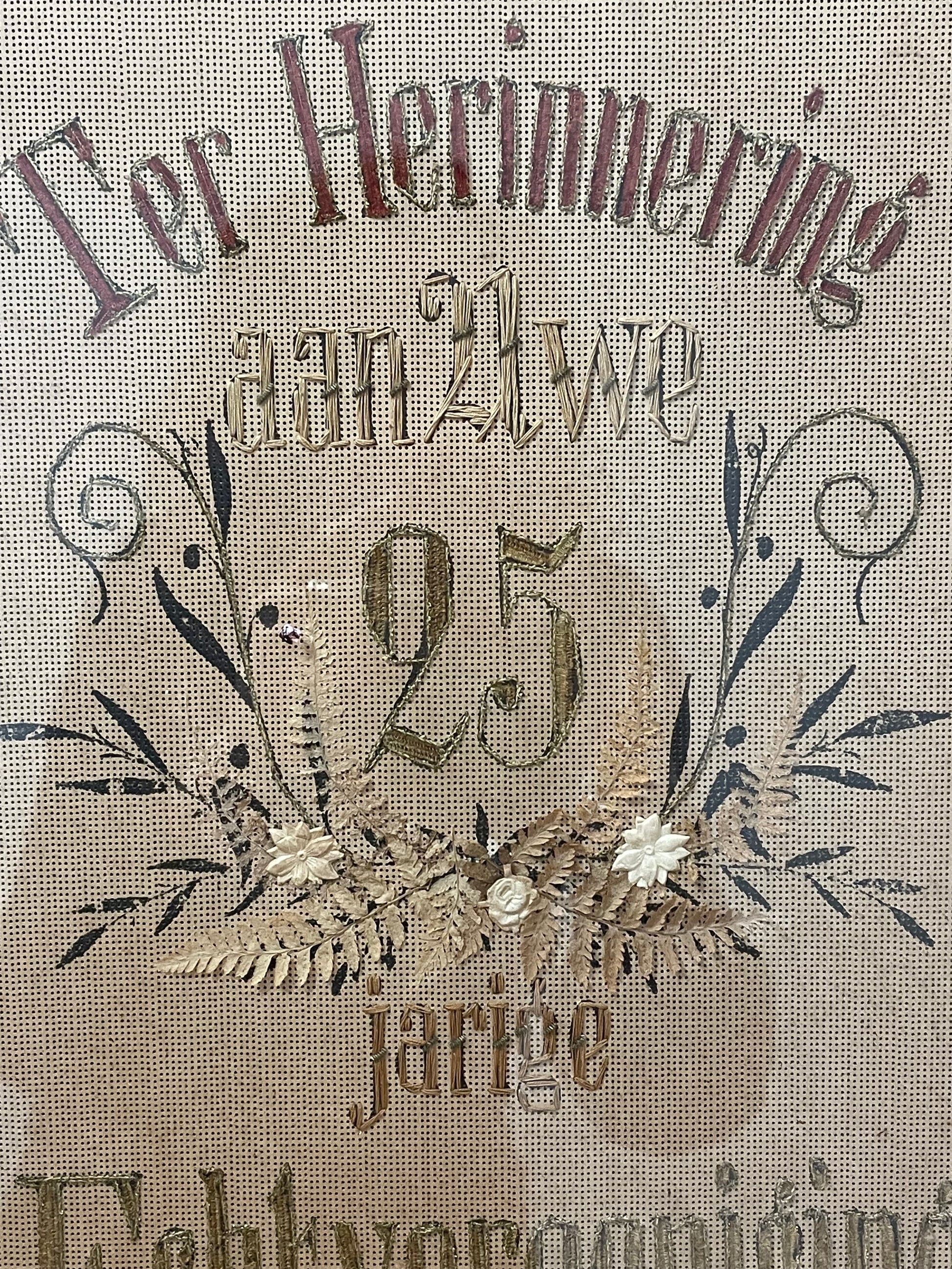 Chi ha una fortuna così in amore….? Ho ritirato questo straordinario ricamo in Frisia, una terra ricca di storia e tradizioni artigianali. Il ricamo, datato 1928, è stato realizzato per celebrare il 25º anniversario di matrimonio, un traguardo che merita un’opera unica come questa. La scritta, elegantemente ricamata, recita: