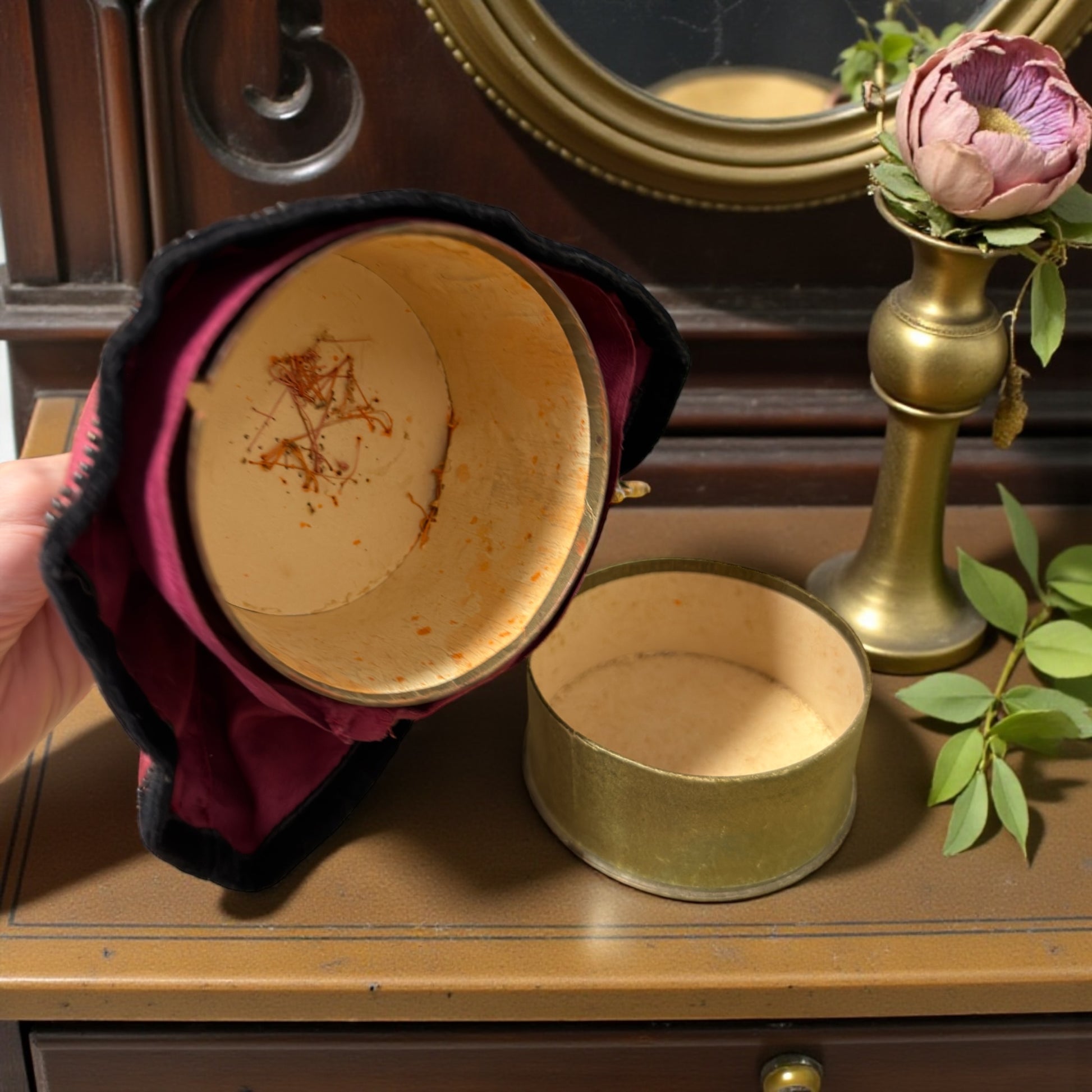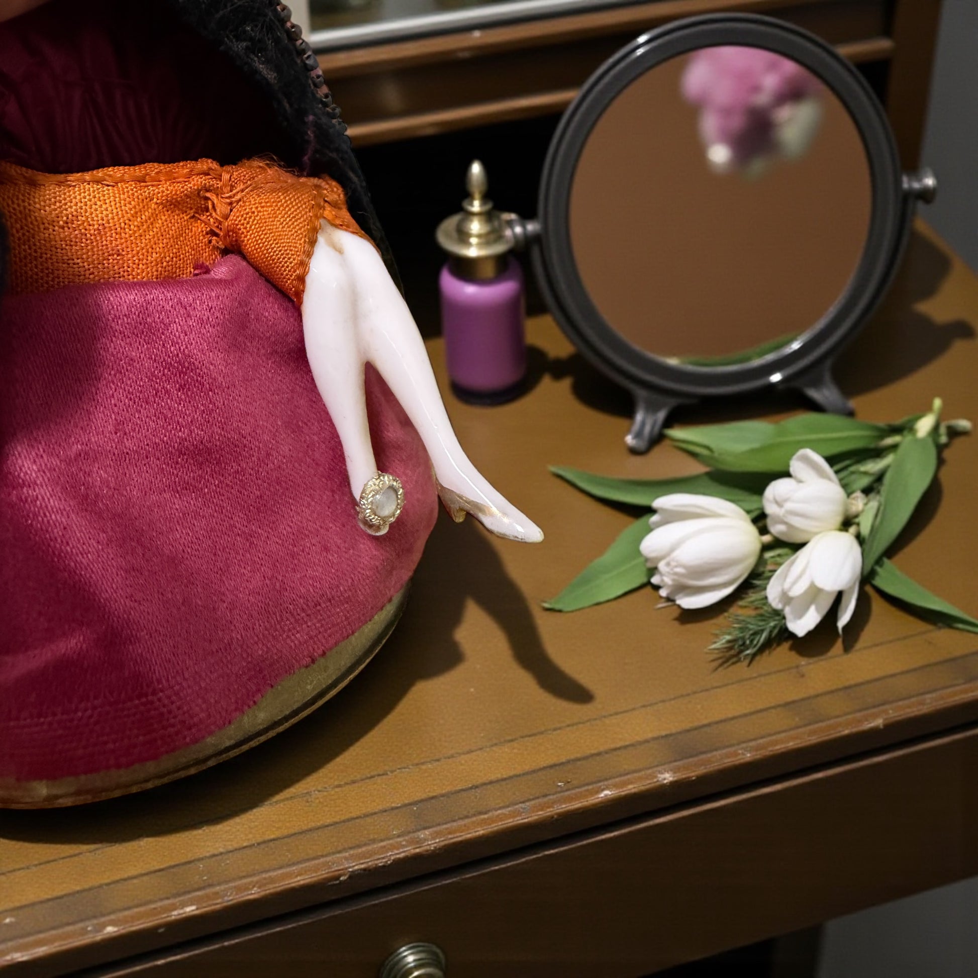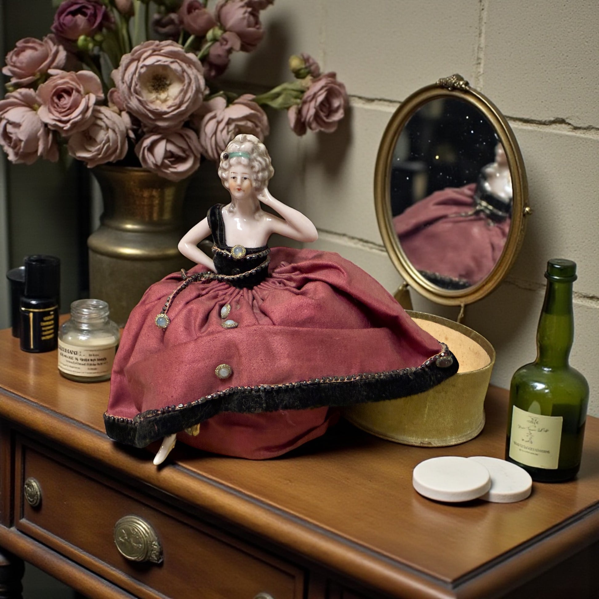 Stava sul tavolino, aspettava un gesto lento, uno specchio aperto, un attimo tutto per sé. È una raffinata half doll da toilette, trasformata in portacipria nei primi decenni del Novecento. Il busto e le gambe in porcellana smaltata emergono da una gonna ampia in tessuto bordeaux, impreziosita da passamanerie e piccoli decori, mentre la scatola interna in cartone custodiva la polvere profumata dei rituali quotidiani col suo delizioso piumino. Il dettaglio che fa la differenza è lì, appena sotto l’orlo: le gambe in porcellana, integre, un particolare non scontato, pensato per sorprendere chi sollevava il coperchio. Un oggetto intimo, elegante, nato per accompagnare la cura di sé quando il tempo aveva un altro ritmo. Alta 16 cm, ha attraversato gli anni con grazia, conservando quella presenza silenziosa che non chiede attenzione, ma la ottiene comunque. È femminilità pura. La immagini su una toilette d’epoca… o già appoggiata a casa tua?