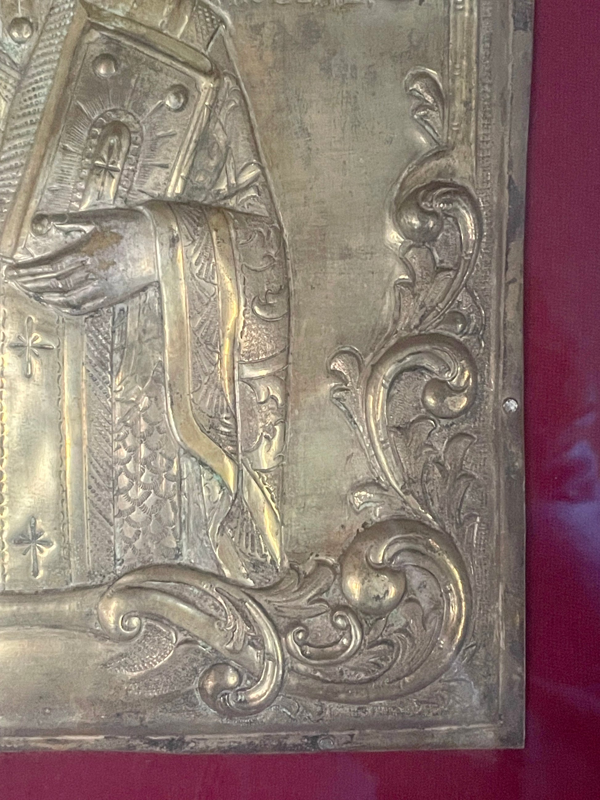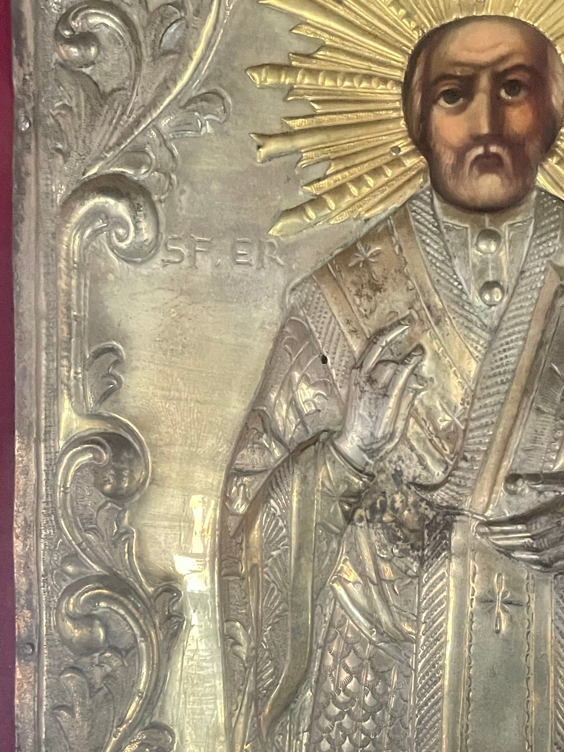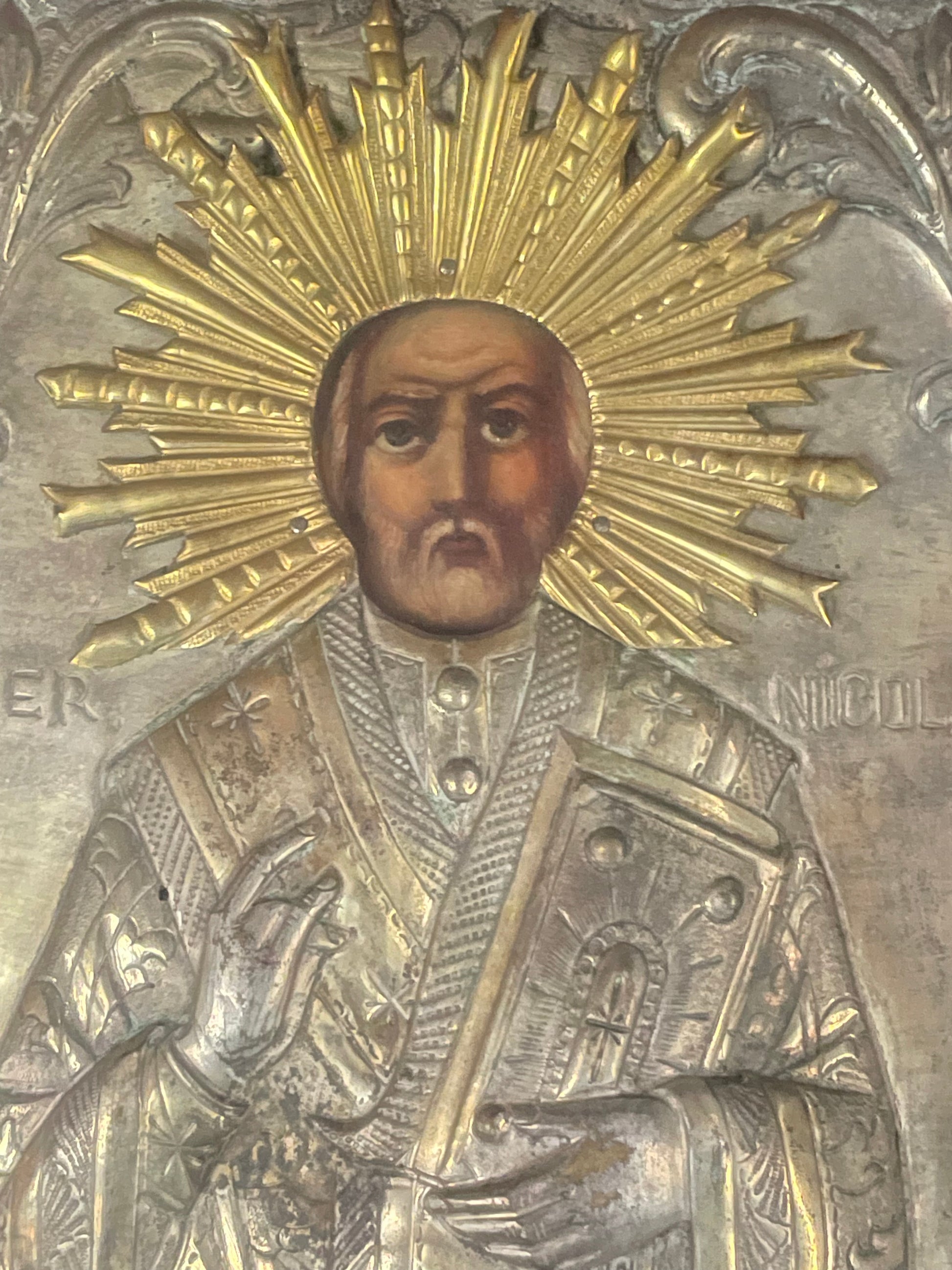 Questa affascinante icona, proveniente dall’area balcanica e risalente ai primi decenni del XX secolo, rappresenta San Nicola - il vescovo di Myra, venerato per la sua benevolenza e saggezza. L’opera è impreziosita da una riza, la tradizionale cornice metallica lavorata a sbalzo, realizzata in una lega argentata con dettagli floreali e raggi dorati che avvolgono il volto del santo, dipinto su supporto cartaceo. Le scritte in latino, “NICOLAE” e “SF. ER”, testimoniano la destinazione dell’icona per una comunità dell’Europa orientale, in un’epoca di incontro tra tradizione sacra e modernità artigianale. San Nicola è raffigurato con il Vangelo nella mano sinistra, simbolo della sua autorità spirituale, e con la destra nel gesto benedicente. Incorniciata professionalmente, l’opera si presenta in ottime condizioni, con una cornice arigenerata impeccabile e una leggera patina sulla riza che racconta la sua storia. Un pezzo perfetto per collezionisti o per chi desidera aggiungere un tocco di spiritualità e fascino al proprio spazio. Dimensioni 43 x 39 spessore 4,5 cm.
