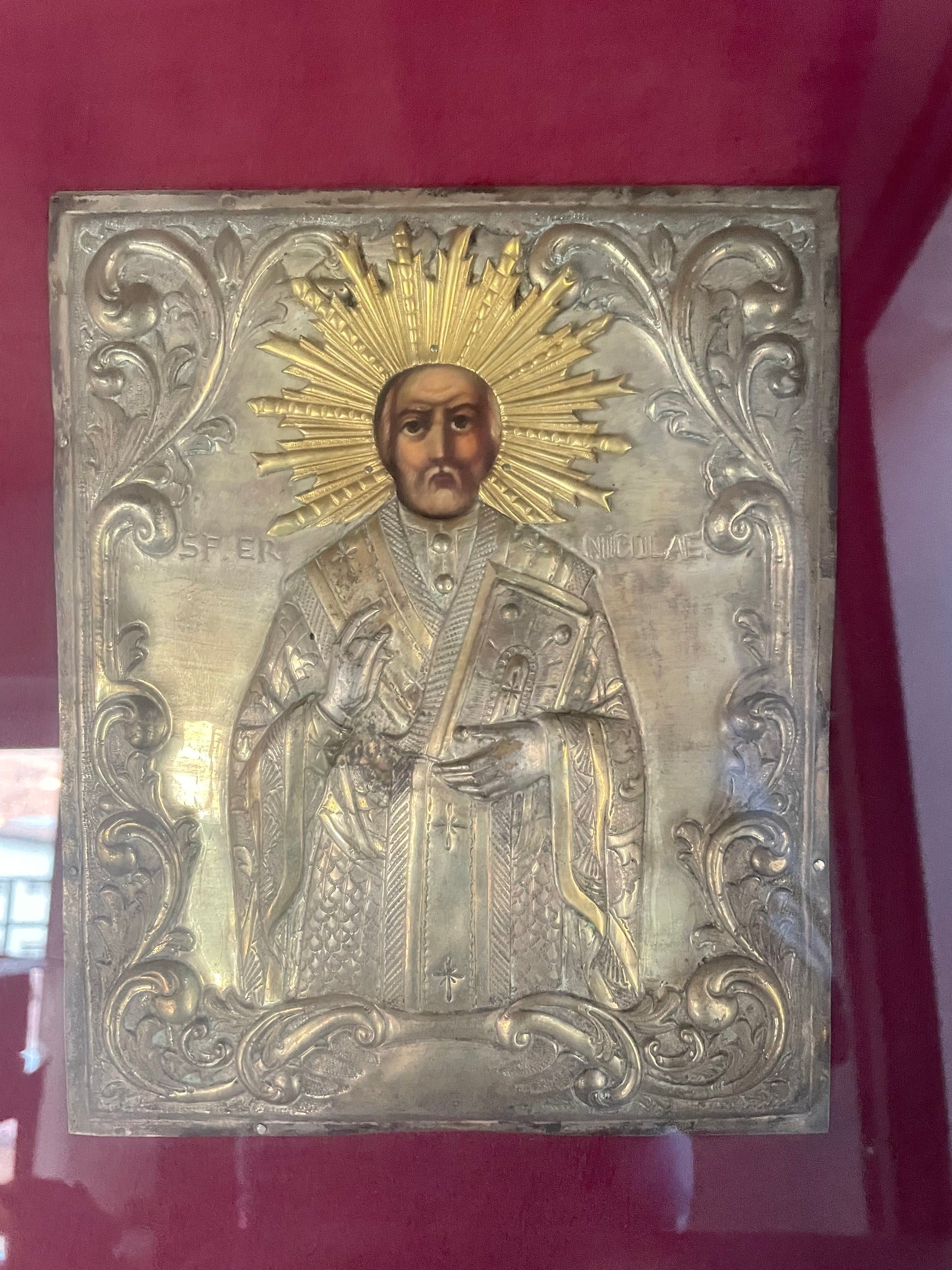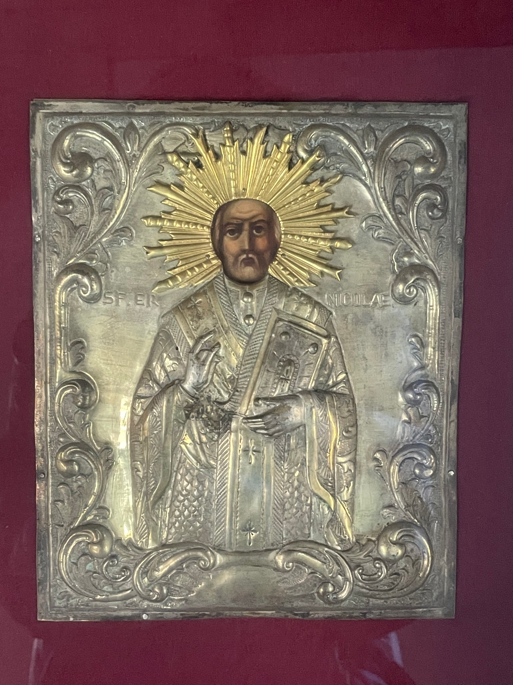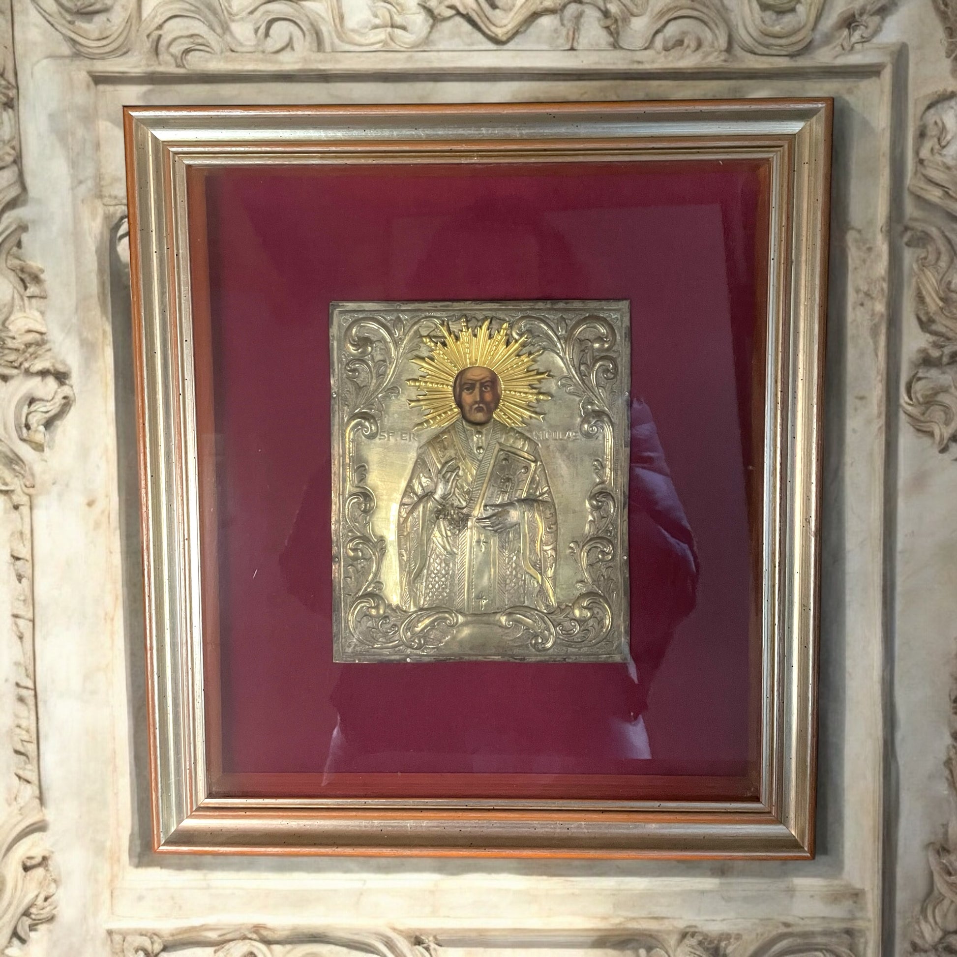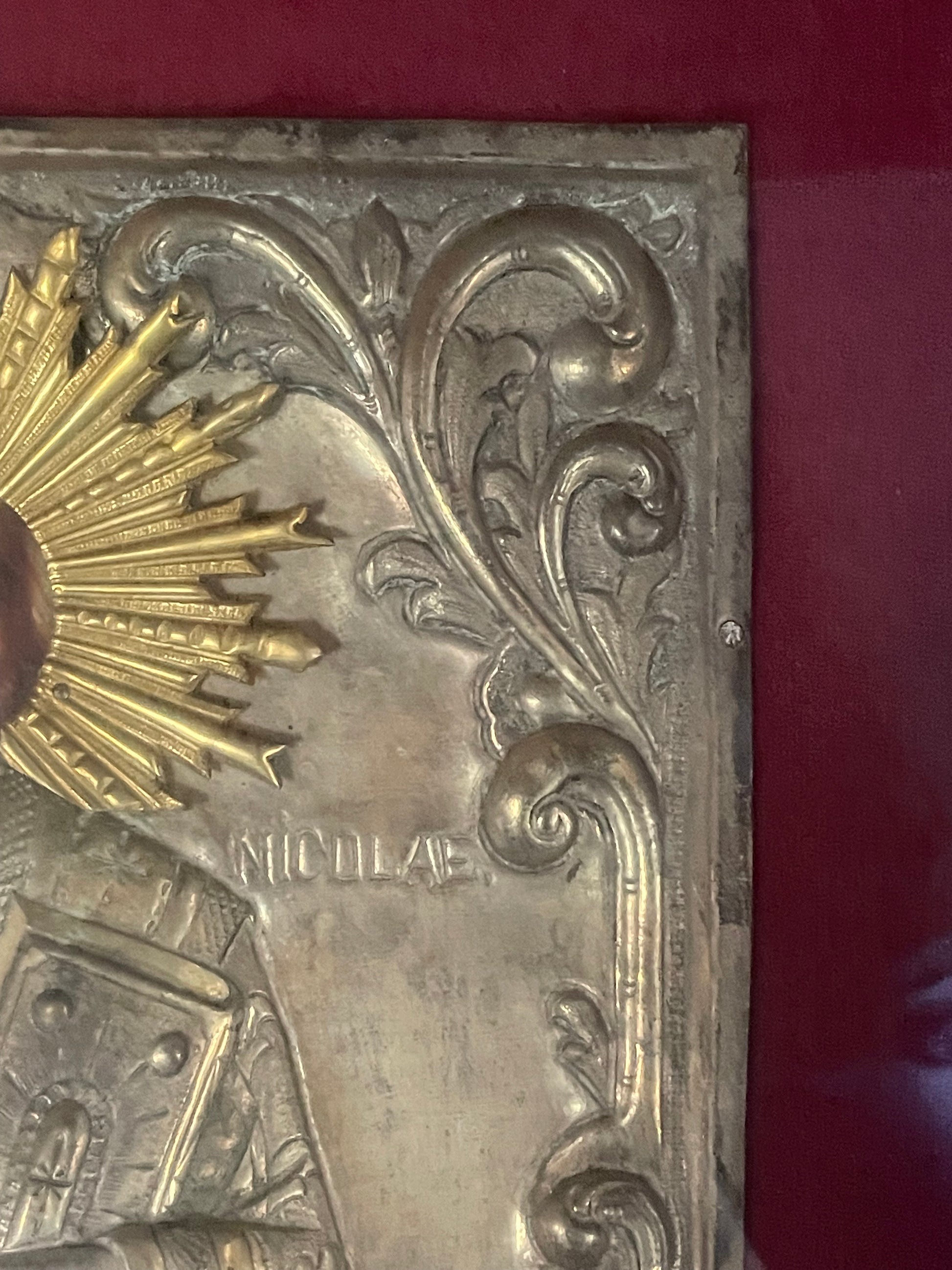Questa affascinante icona, proveniente dall’area balcanica e risalente ai primi decenni del XX secolo, rappresenta San Nicola - il vescovo di Myra, venerato per la sua benevolenza e saggezza. L’opera è impreziosita da una riza, la tradizionale cornice metallica lavorata a sbalzo, realizzata in una lega argentata con dettagli floreali e raggi dorati che avvolgono il volto del santo, dipinto su supporto cartaceo. Le scritte in latino, “NICOLAE” e “SF. ER”, testimoniano la destinazione dell’icona per una comunità dell’Europa orientale, in un’epoca di incontro tra tradizione sacra e modernità artigianale. San Nicola è raffigurato con il Vangelo nella mano sinistra, simbolo della sua autorità spirituale, e con la destra nel gesto benedicente. Incorniciata professionalmente, l’opera si presenta in ottime condizioni, con una cornice arigenerata impeccabile e una leggera patina sulla riza che racconta la sua storia. Un pezzo perfetto per collezionisti o per chi desidera aggiungere un tocco di spiritualità e fascino al proprio spazio. Dimensioni 43 x 39 spessore 4,5 cm.