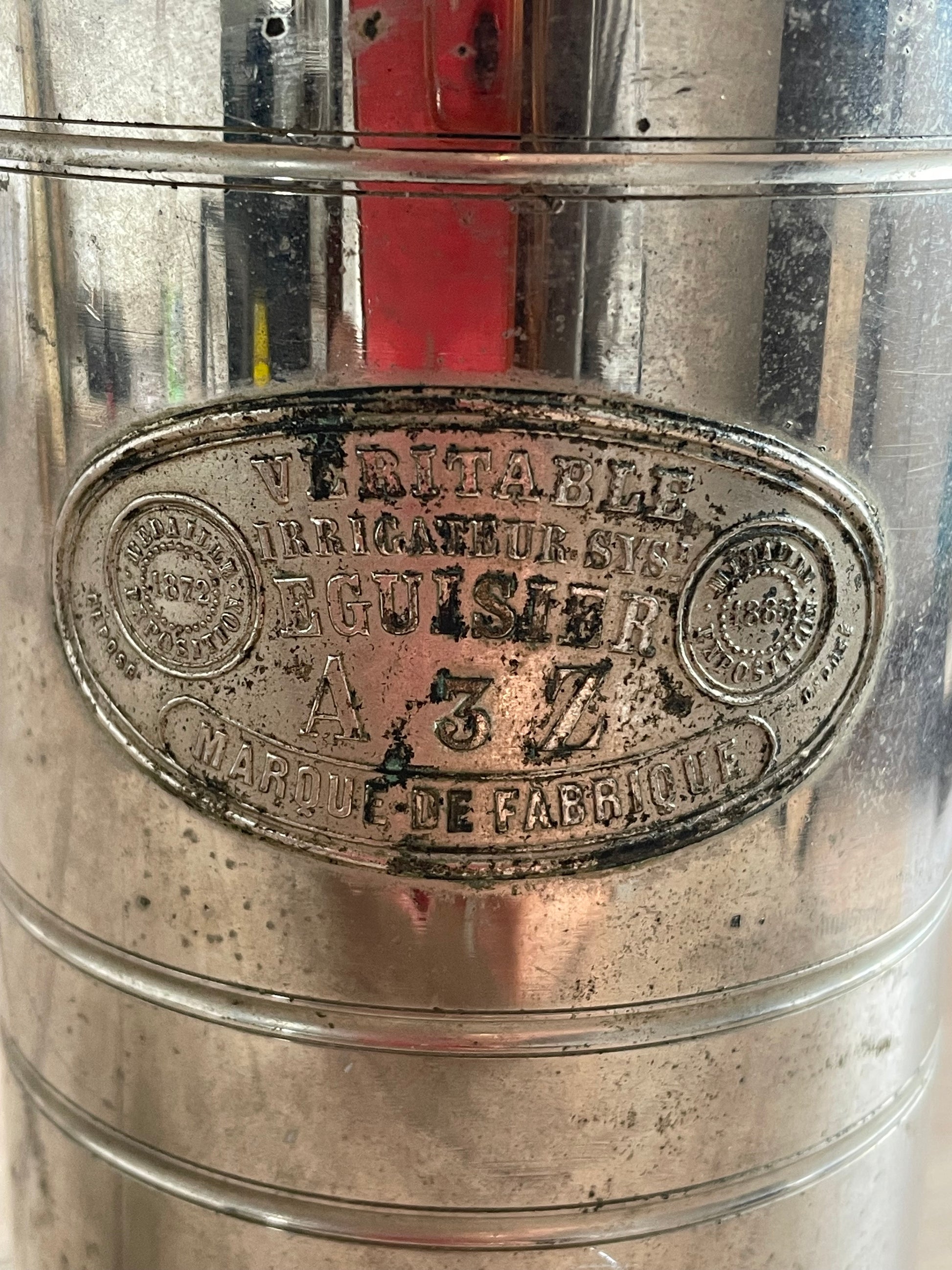 Véritable Irrigateur Système ÉGuisier – Modèle A3Z. Epoca: ca. 1890–1910. Materiale: metallo argentato/nichelato. Funzionamento: pressione manuale con manovella, rubinetto di scarico. Condizioni: segni d’uso, usura e ossidazioni compatibili con l’età; integro nel funzionamento meccanico. Destinazione: collezionismo medico, musei, studi storici sull’igiene.