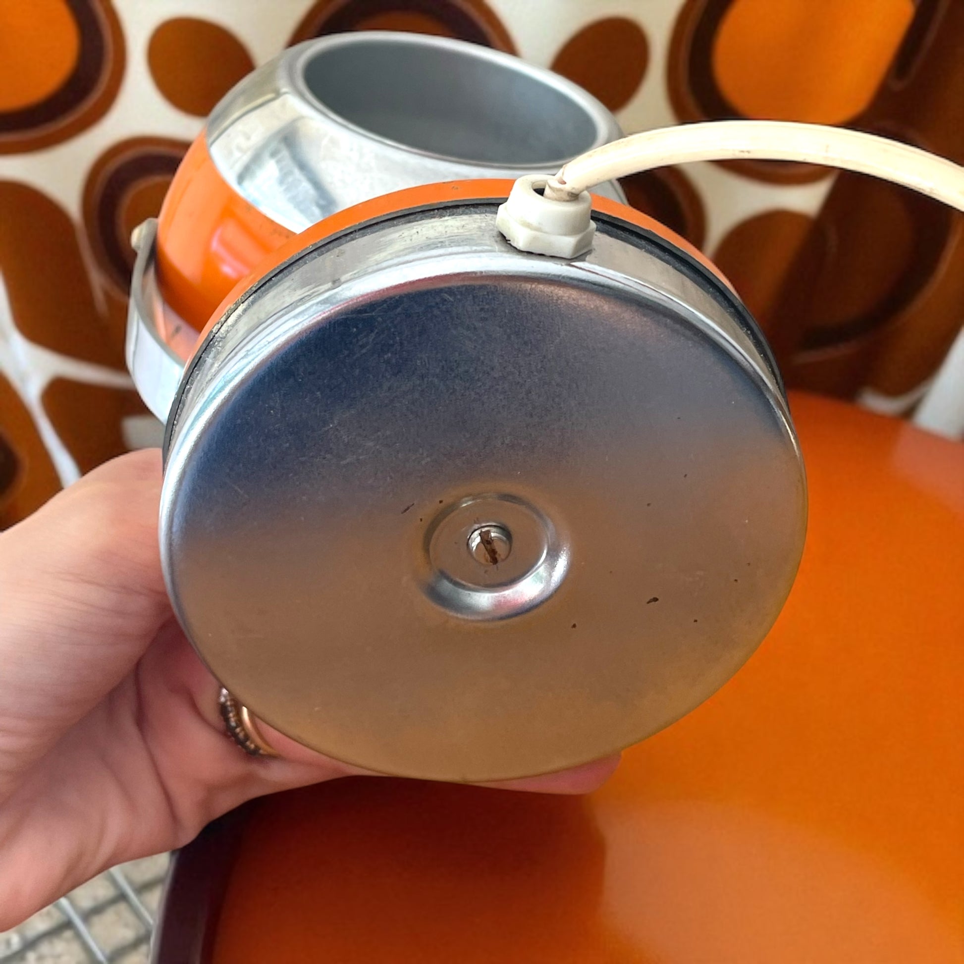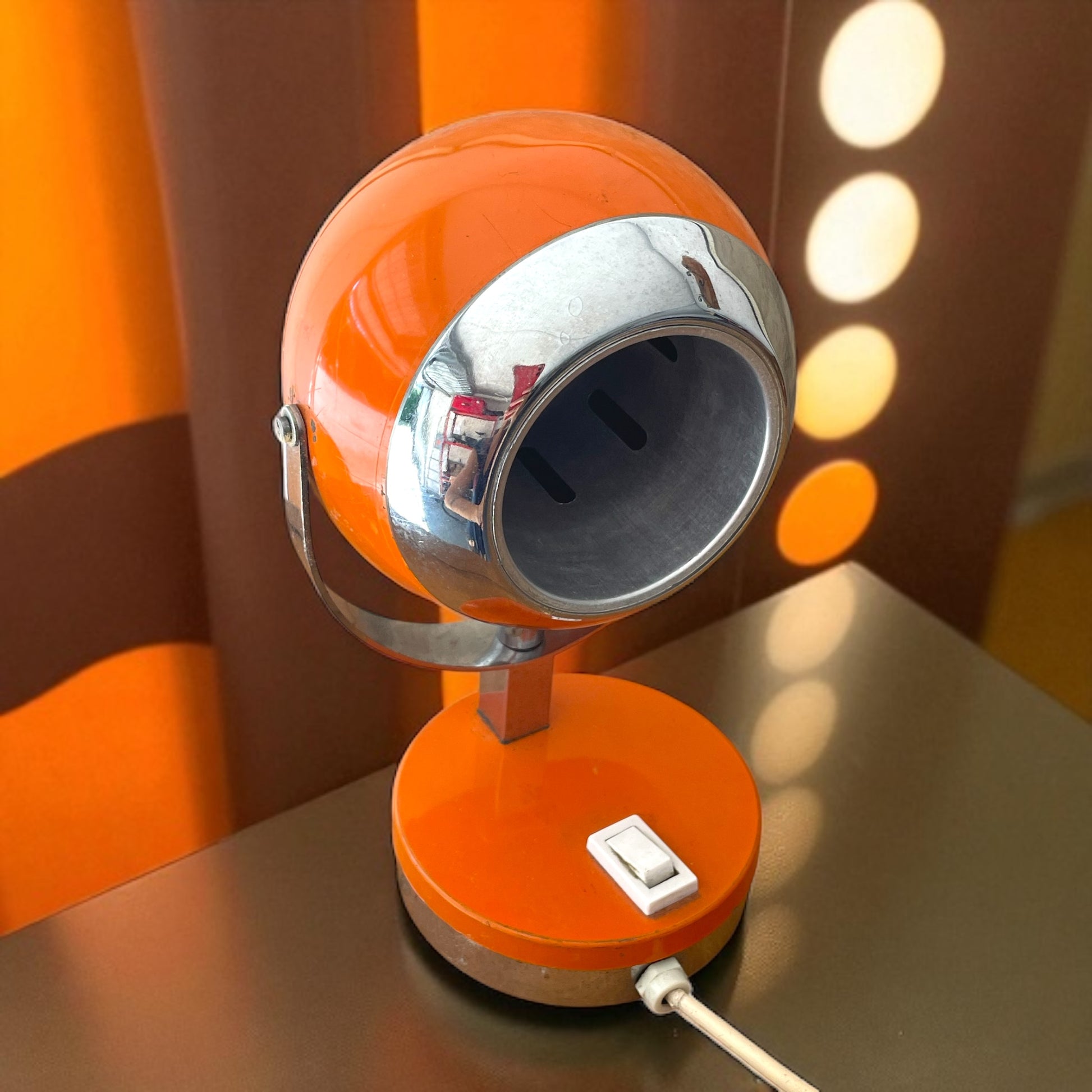 C’era un tempo in cui il futuro aveva la forma sferica di un arancione brillante. Questa lampada degli anni ’70 ha conservato intatto il suo fascino spaziale, con quel design eyeball che profuma di sogni, scoperte e salotti illuminati da una luce nuova. È realizzata in metallo color arancio, con dettagli cromati che riflettono l’ambiente come uno specchio d’epoca. Il cappello orientabile ricorda un piccolo satellite domestico, pronto a puntare la luce dove serve o dove semplicemente fa sognare. Funziona perfettamente – l’ho testata personalmente – e anche se porta qualche segno del tempo sul cappello, resta un oggetto iconico e raro, capace di evocare l’immaginario di un’epoca in cui lo spazio sembrava a portata di mano. Non ha firme visibili, ma la sua personalità basta da sola a firmare un ambiente. È pronta per una casa che ama i dettagli pieni di carattere… e di memoria.
