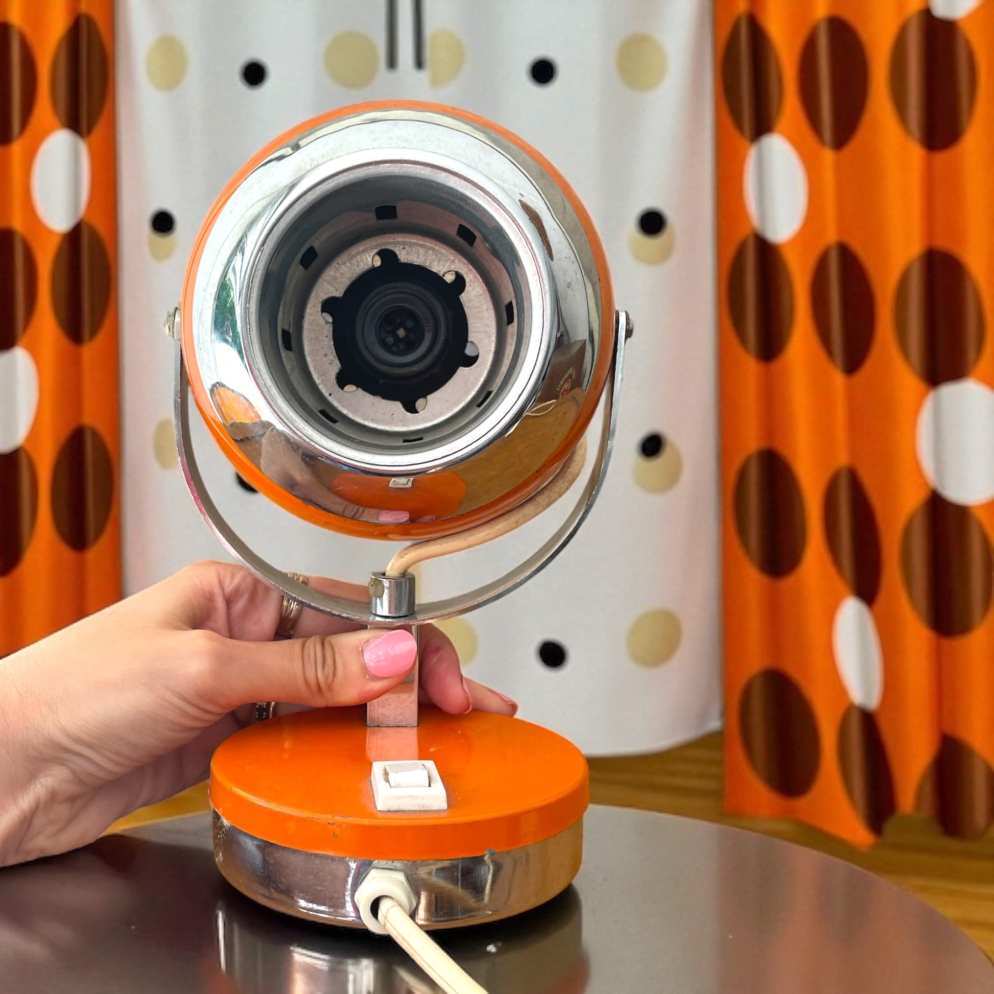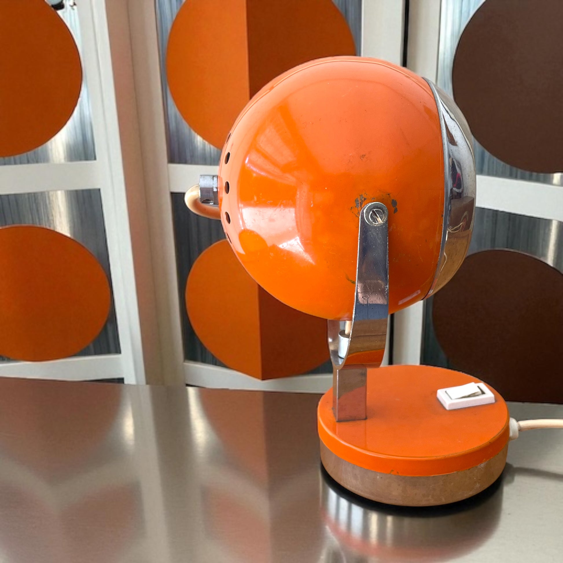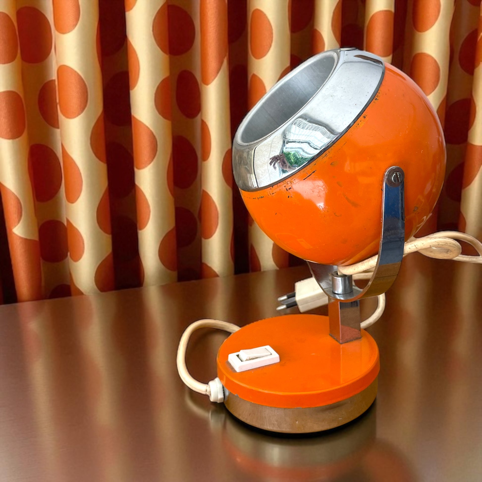 Lampada da tavolo vintage originale anni ’70 arancione, cromature. Cappello sferico orientabile. Testata e funzionante. Segni del tempo sulla calotta. Spina originale a due poli. Altezza cm 23.