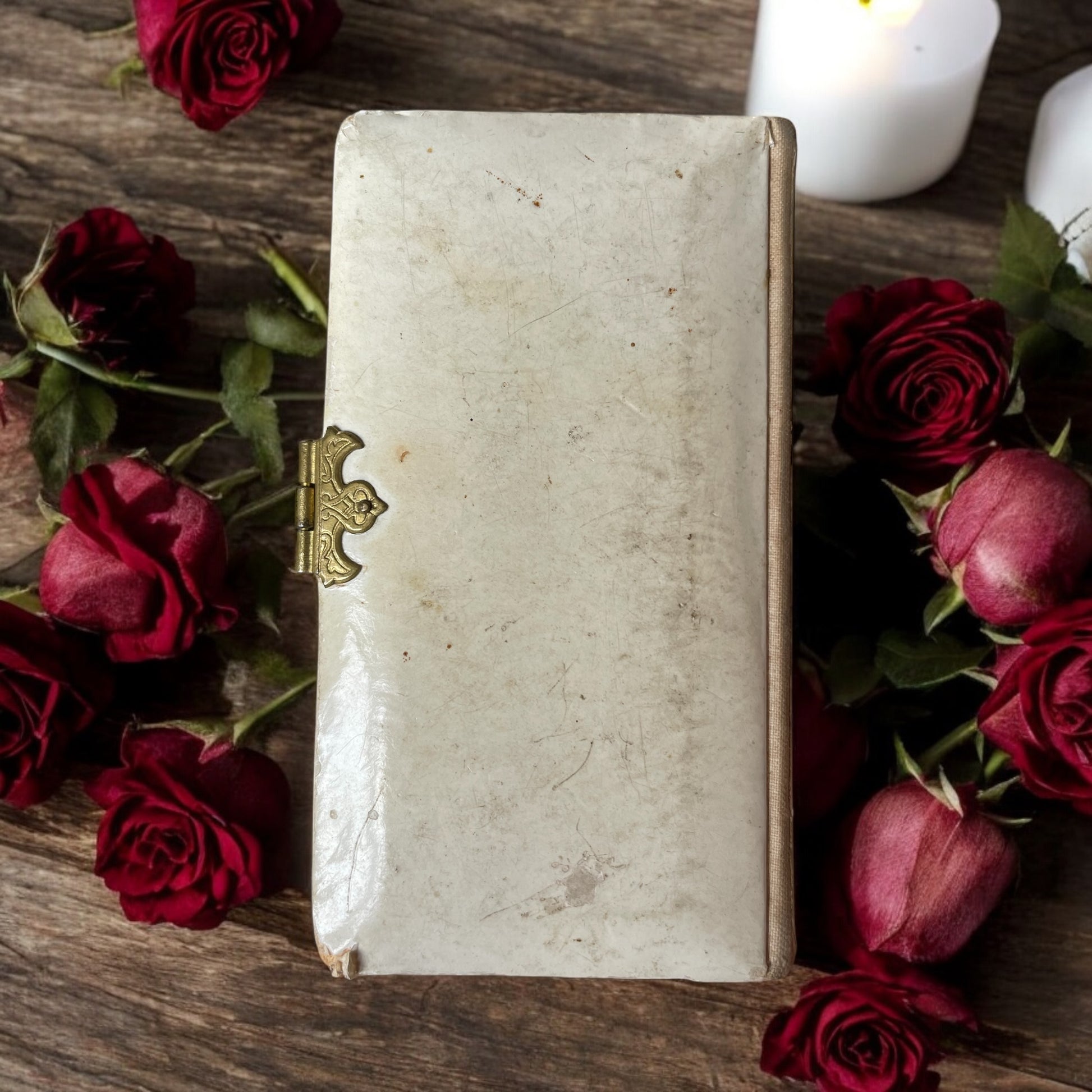 Un piccolo gioiello di devozione, questo Pio Ricordo è un manuale di preghiere dall’eleganza raffinata. La copertina bianca, decorata con un delicato fiore smaltato e un angelo inginocchiato, ne suggerisce la natura commemorativa, probabilmente legata a una Prima Comunione o un altro sacramento. La chiusura in metallo dorato, ancora perfettamente funzionante, custodisce pagine finemente stampate, impreziosite da illustrazioni e testi devozionali. All’interno, la grafica dai toni pastello e dorati accompagna le preghiere quotidiane con un tocco di soavità . Un oggetto intriso di spiritualità e memoria, capace di trasportare chi lo sfoglia in un’epoca di intensa fede e raccoglimento.
