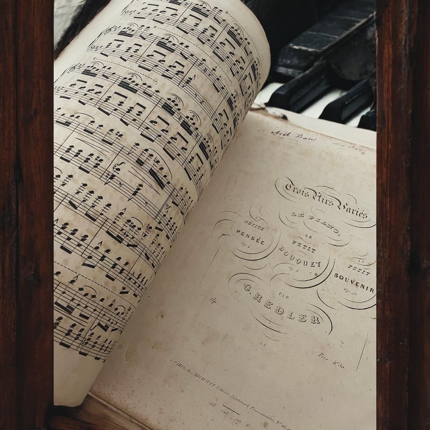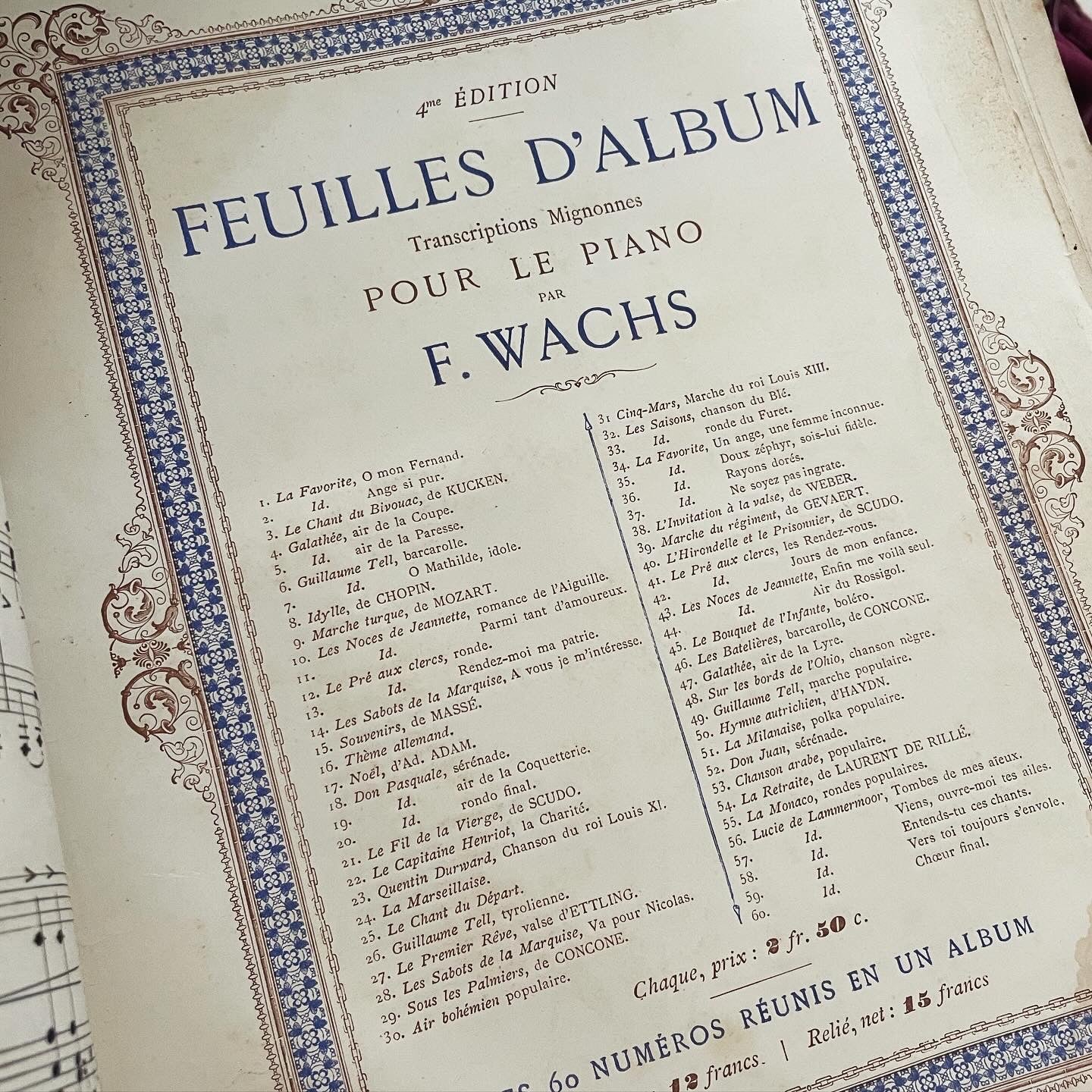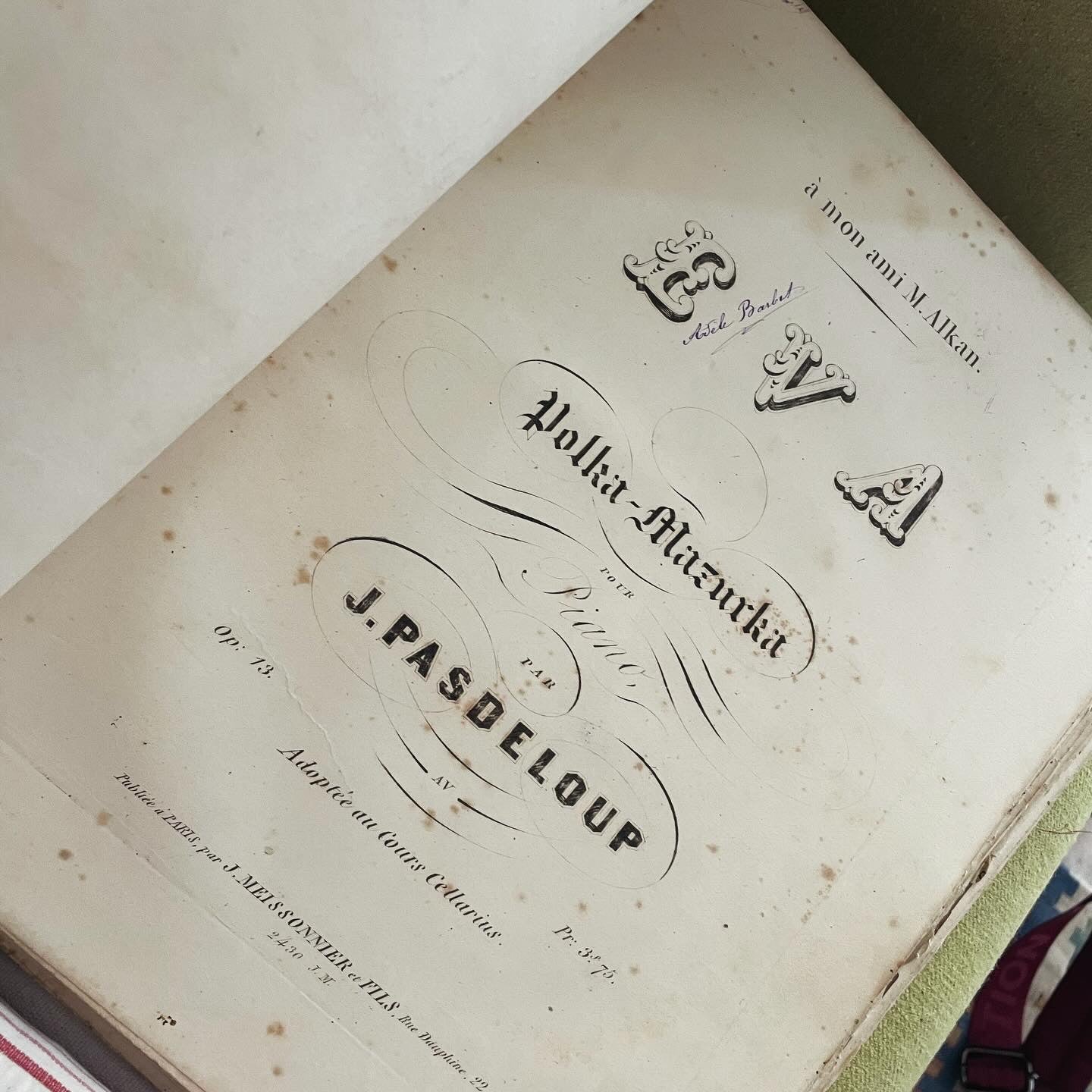 Beautiful find full of atmosphere and flavor ... large old book from the late 1800s bound by the owner with many different scores for piano; it has more than 50 pages, there are also the covers of the individual partitions - very decorated; some in color. The first half of the volume despite having a damaged binding has pages in excellent condition, the second half has pages with tears sometimes repaired, you can see that it was a much loved and used volume by the owner - the pianist Adèle - who signed each score.