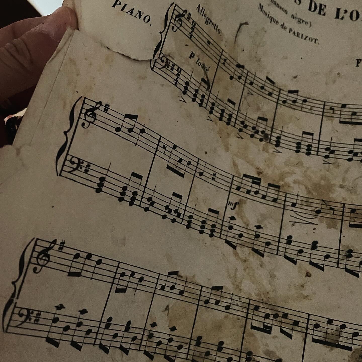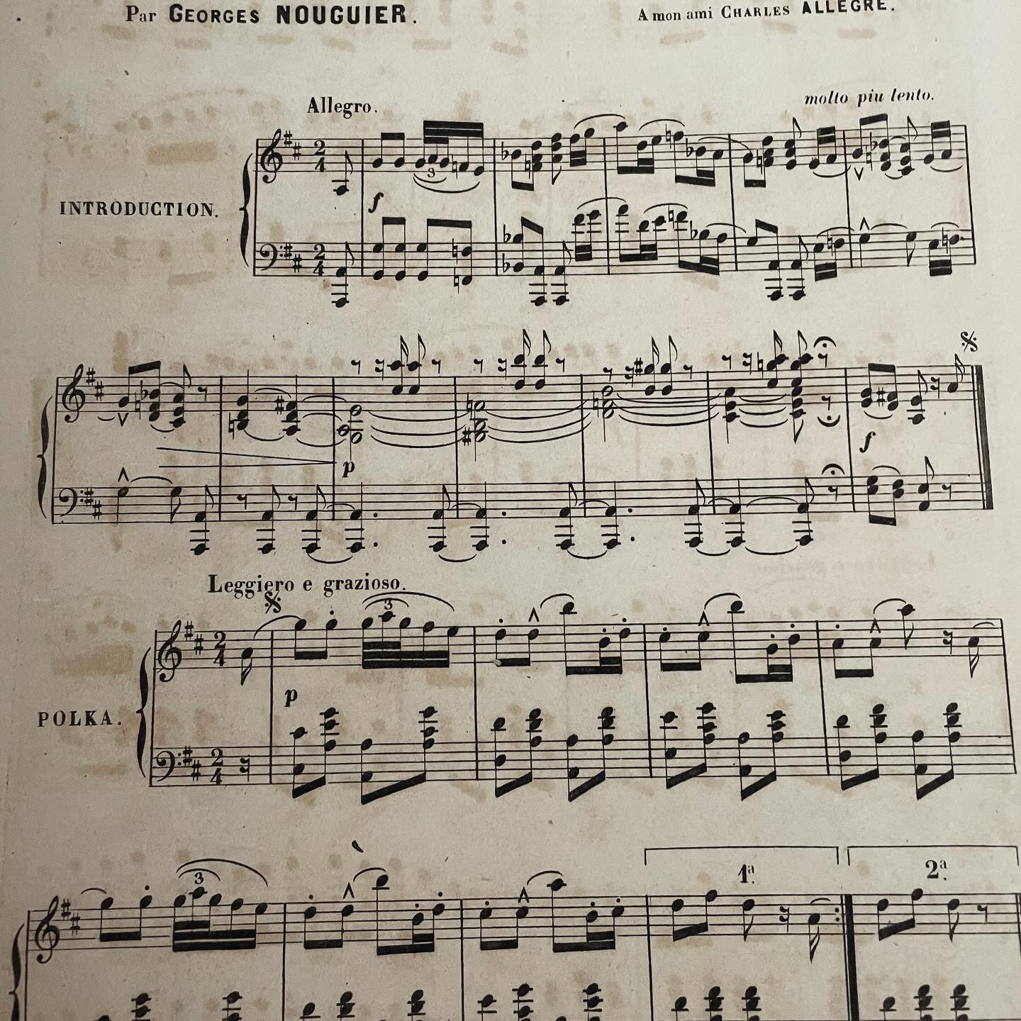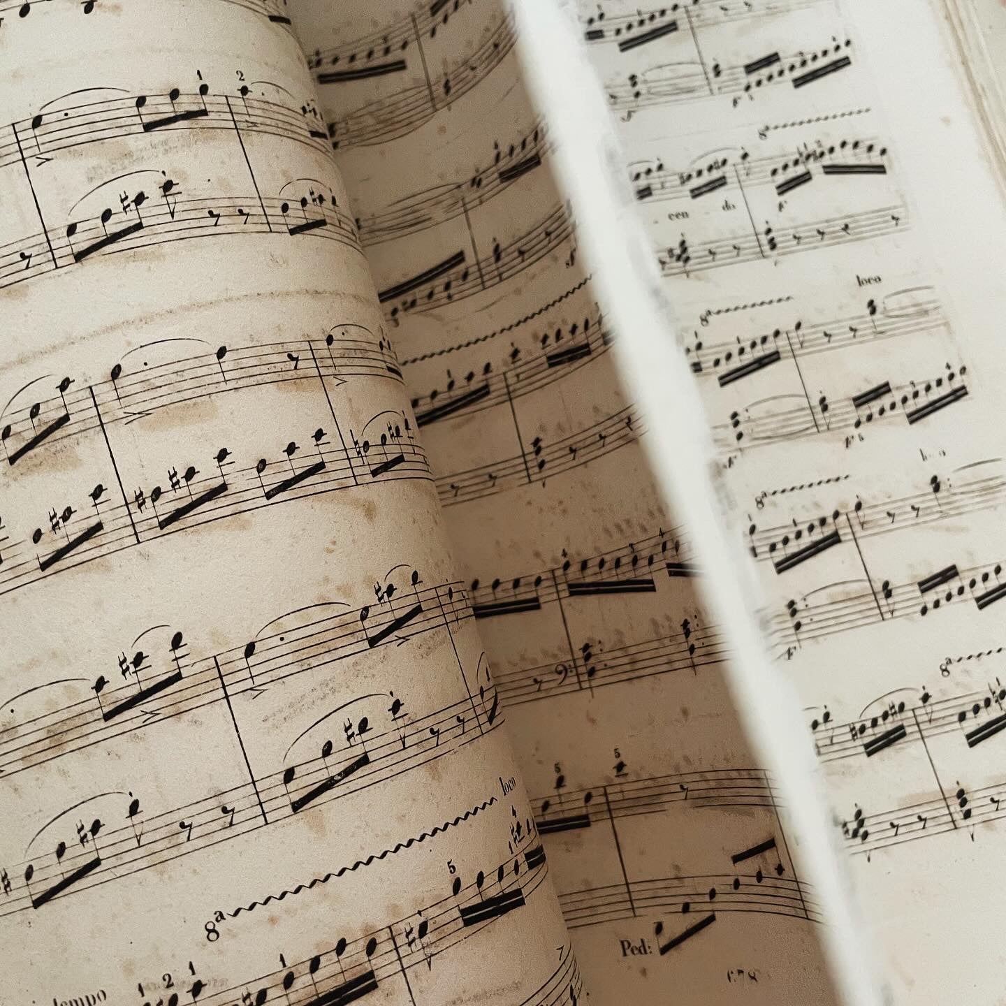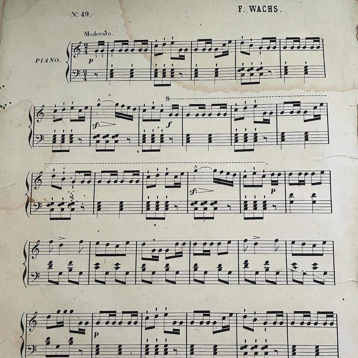 Beautiful find full of atmosphere and flavor ... large old book from the late 1800s bound by the owner with many different scores for piano; it has more than 50 pages, there are also the covers of the individual partitions - very decorated; some in color. The first half of the volume despite having a damaged binding has pages in excellent condition, the second half has pages with tears sometimes repaired, you can see that it was a much loved and used volume by the owner - the pianist Adèle - who signed each score.