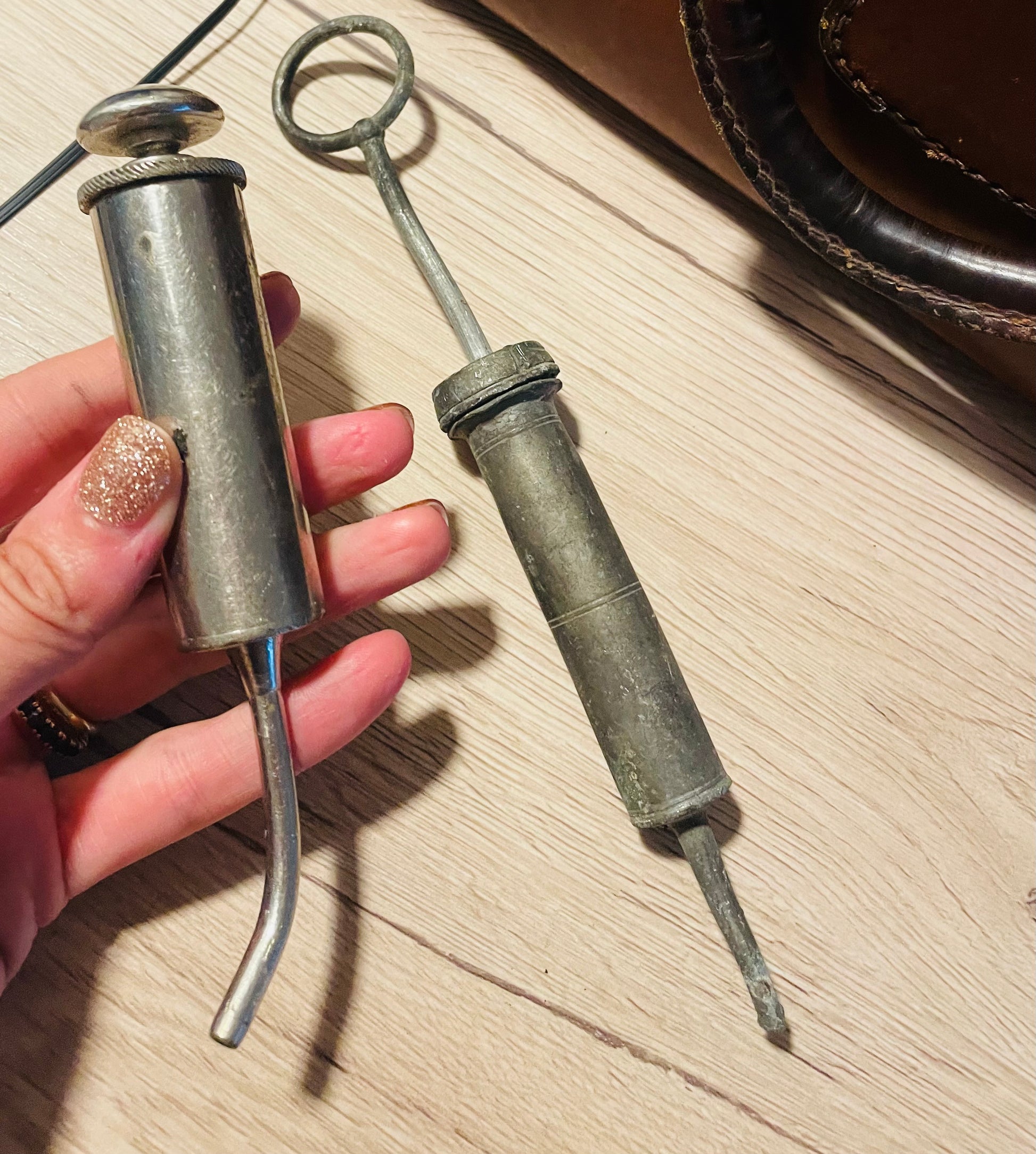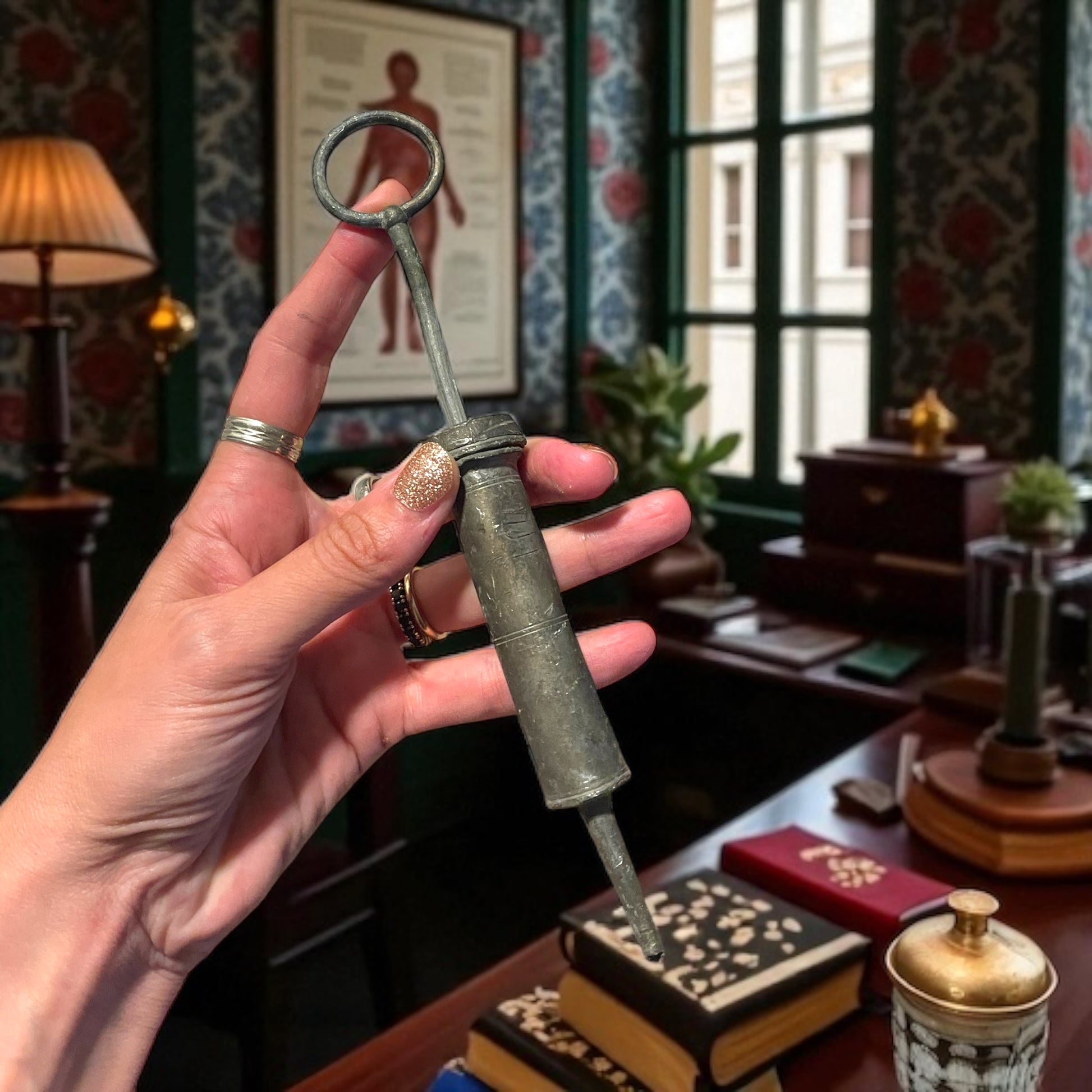 🛠️ Fornita con siringa medica da irrigazione con anello 1920–1935 in lega (probabile zinco/piombo), a corpo cilindrico, stantuffo con anello per il pollice, beccuccio lungo e dritto. Uso medico per lavaggi rettali o irrigazioni ginecologiche