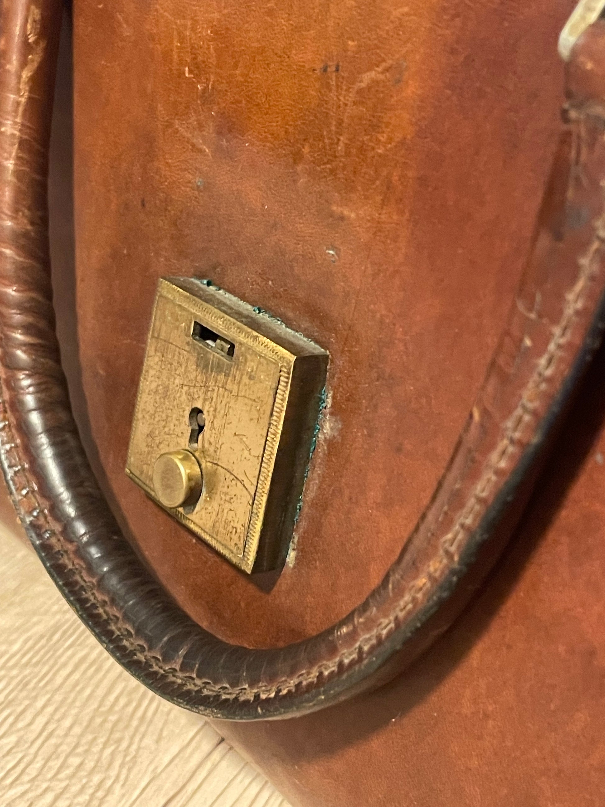 👜 Borsa medica in cuoio con serratura in ottone 1930–1940 in cuoio marrone spesso, con cuciture rinforzate. Chiusura funzionante con placchetta frontale in ottone senza chiave. Interno foderato con tasca. Usura e patina coerenti con l’epoca; manici robusti e cuciture solide; segni del tempo visibili e affascinanti. 25 x 18 cm