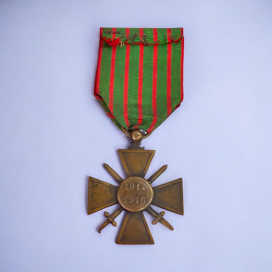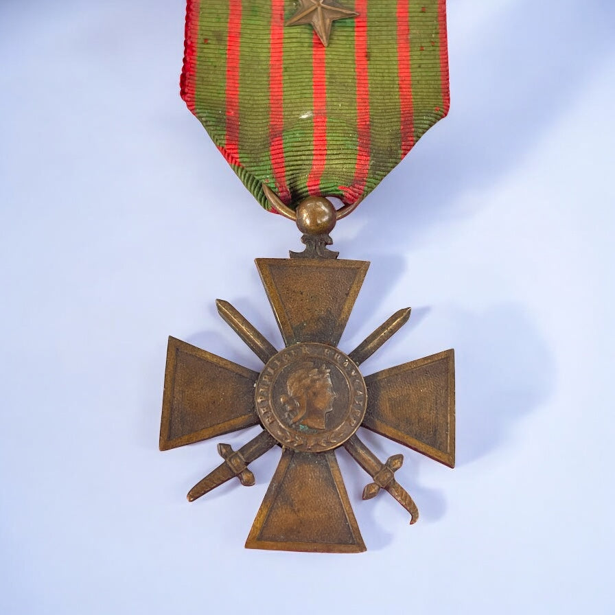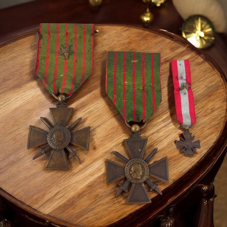 Lotto di tre medaglie originali francesi: due Croix de Guerre 1914-1916 e 1914-1917 (Prima Guerra Mondiale), e una Croix de Guerre T.O.E. (Théâtres d’Opérations Extérieures) con nastro rosso e bianco. Testimonianze di atti eroici e campagne militari che hanno segnato il secolo scorso.