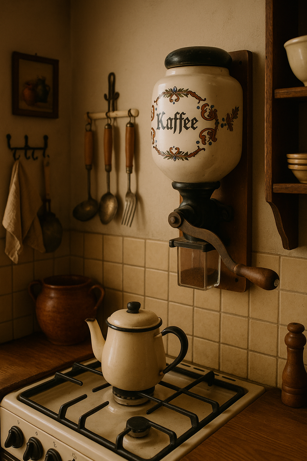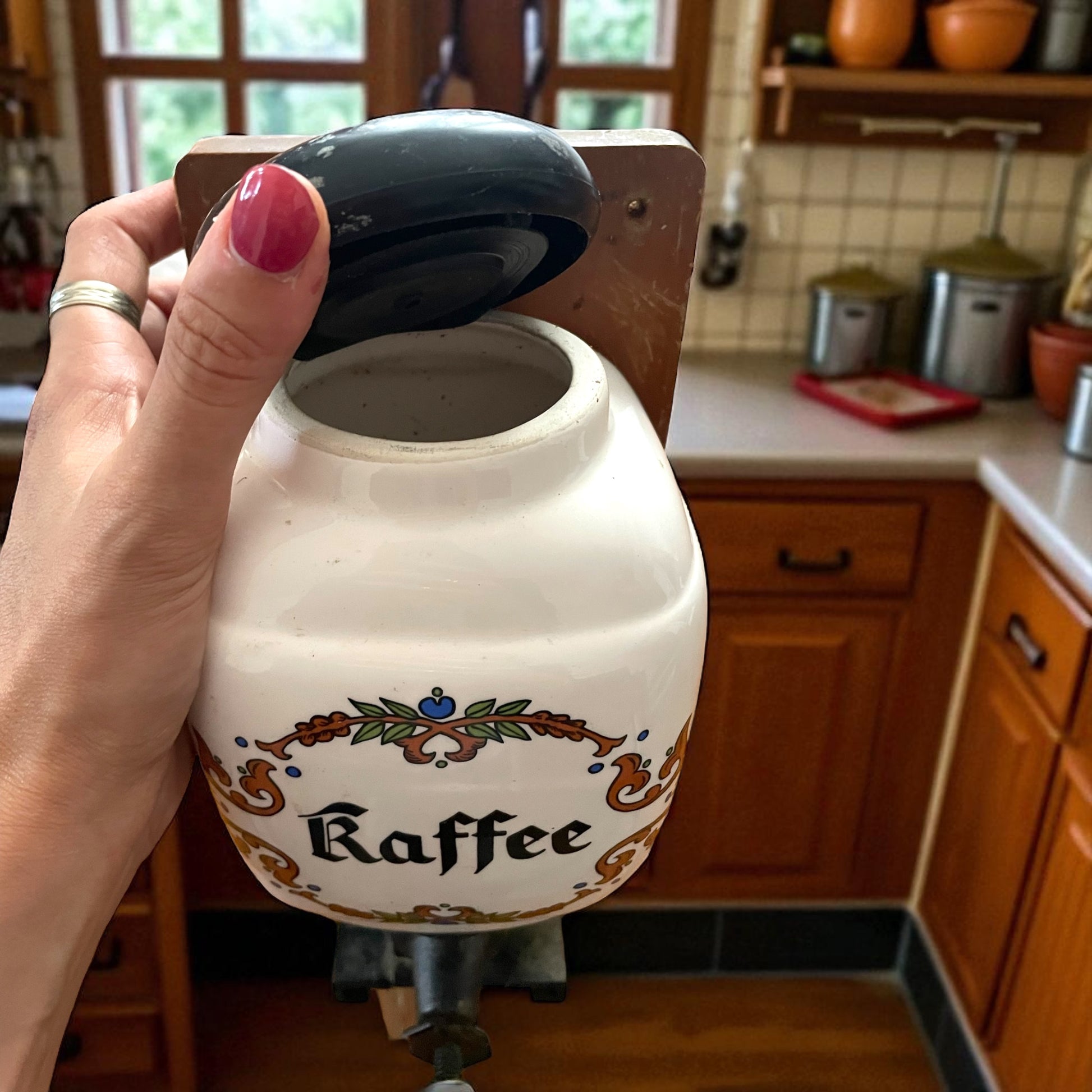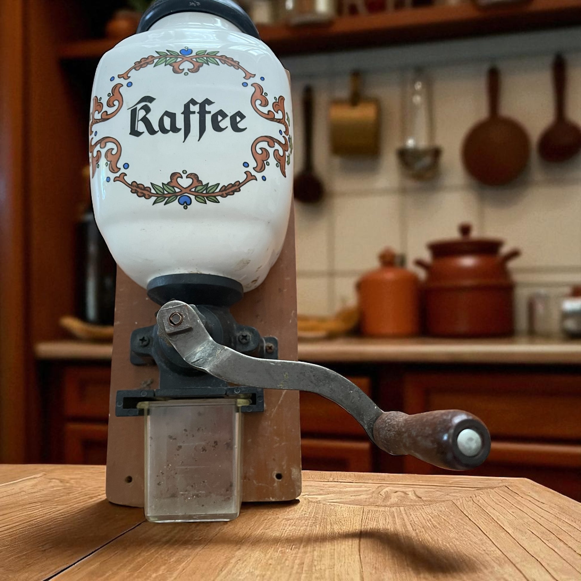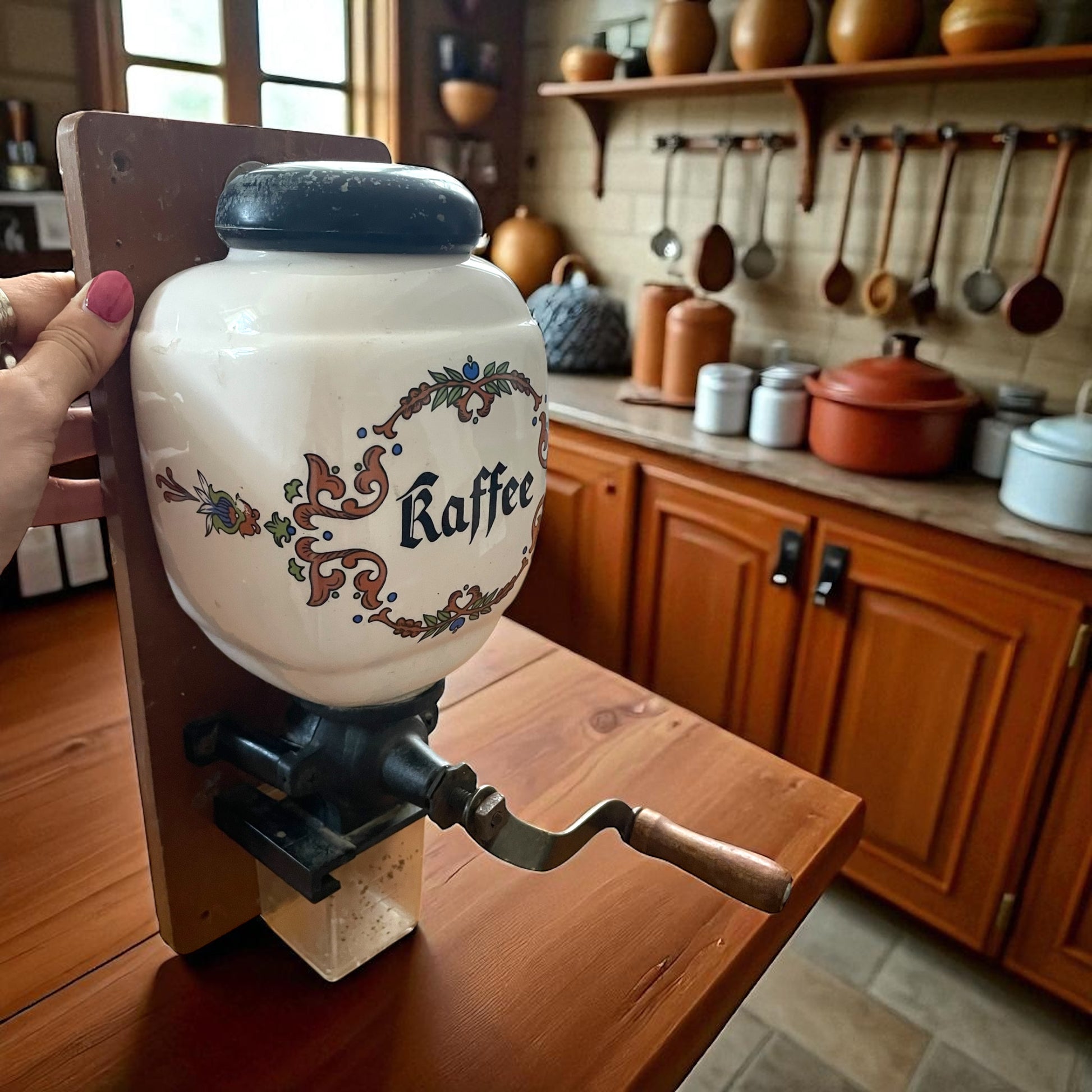 Immagina una cucina tedesca degli anni 50-60: il profumo del caffè appena macinato riempie l’aria, mentre una mano gira lenta la manovella di questo macinacaffè da muro. Il serbatoio in ceramica, decorato con eleganti motivi floreali e la scritta “Kaffee” in caratteri gotici, custodiva i chicchi che, poco a poco, diventavano polvere dorata. Nel bicchiere graduato in plexi si raccoglieva il frutto della macinatura. La sua presenza racconta un passato semplice e familiare, quando preparare il caffè era un rituale lento e condiviso, capace di dare calore all’intera casa. Oggi questo macinacaffè è un frammento di memoria da appendere a una parete o da custodire in cucina, pronto a evocare ogni giorno il sapore della tradizione. Chi lo accoglierà con sé sentirà non solo il valore estetico, ma anche l’eco di una vita quotidiana che scorreva con ritmi più umani. Qualche segno del tempo sul coperchio, ceramica in condizioni ottime. Super atmosfera garantita.