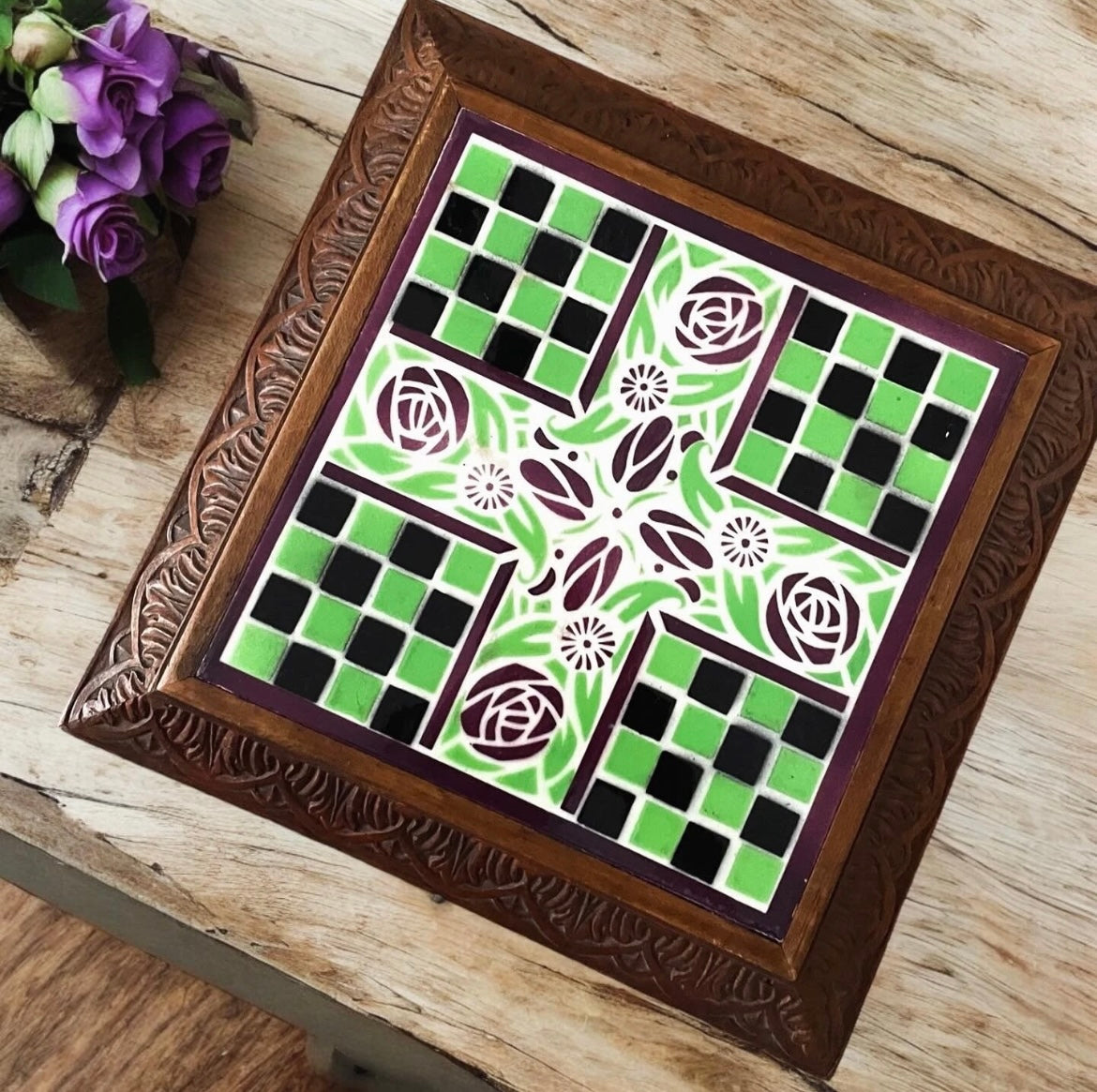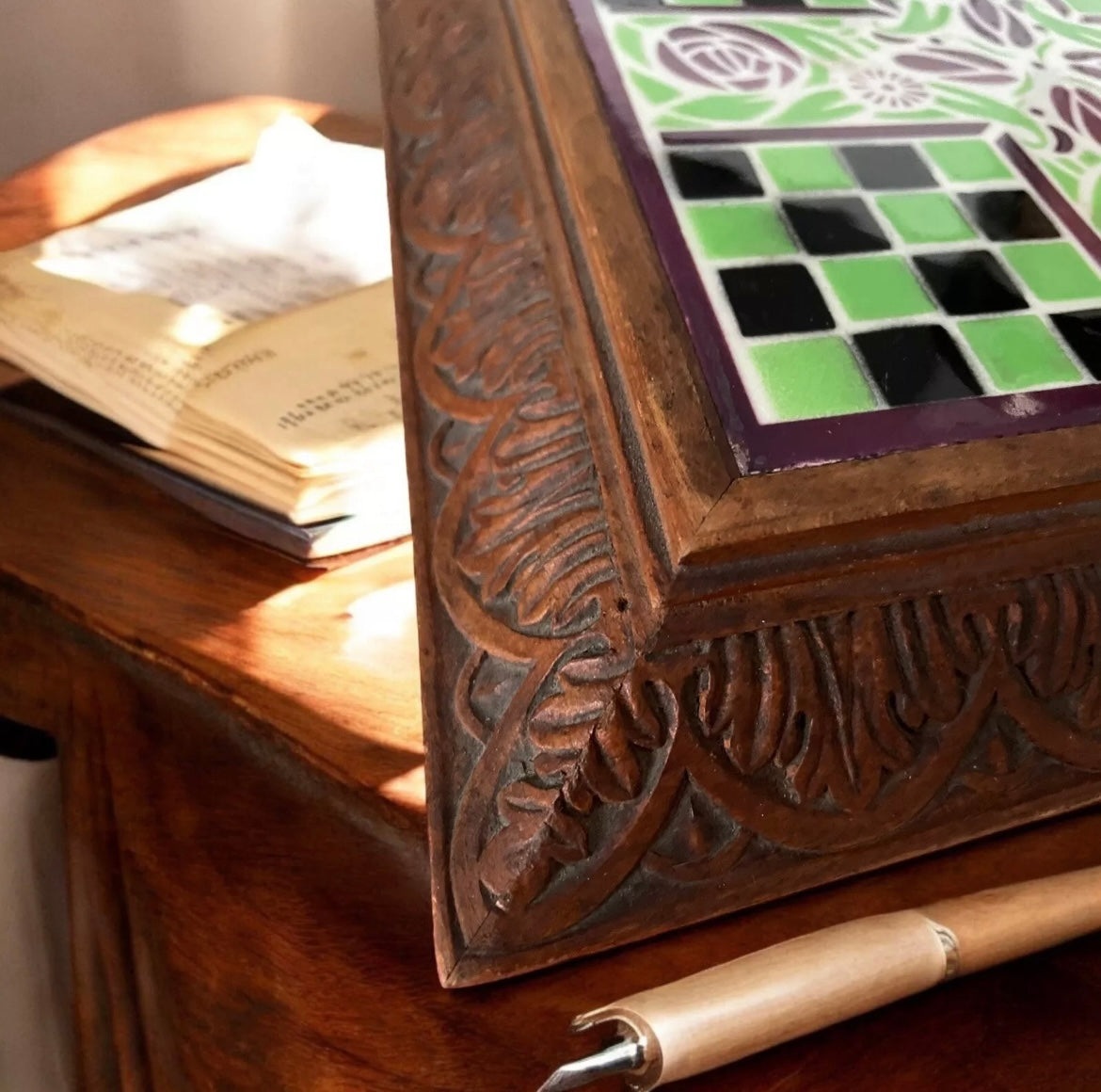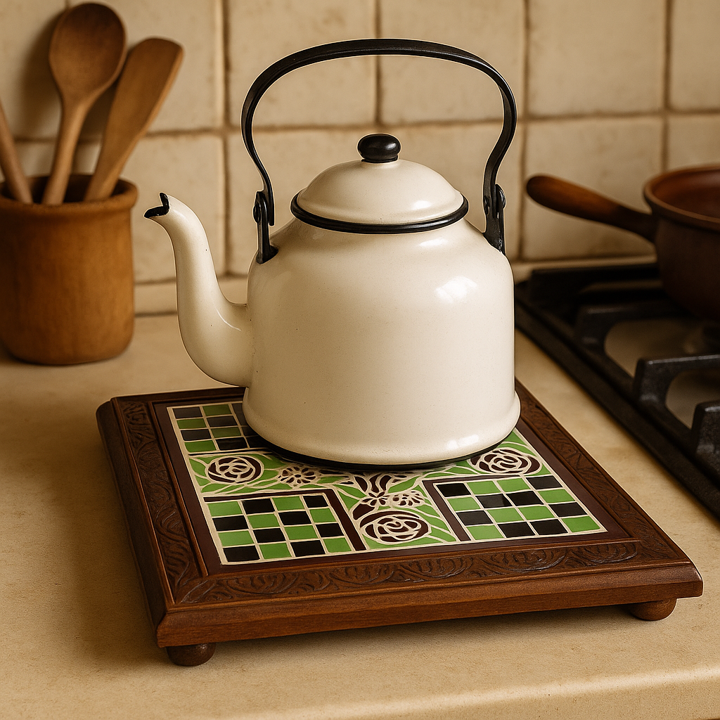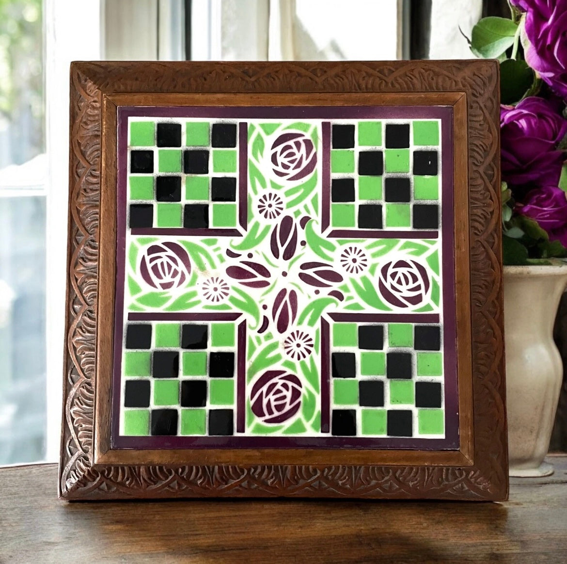 Un frammento di eleganza che porta in tavola il respiro del passato. In Olanda, le suggestioni dell’Art déco e dell’Arts & Crafts sopravvissero oltre i primi decenni del Novecento, filtrando negli oggetti d’uso quotidiano fino agli anni ’50. Questa deliziosa maiolica ne è un raffinato esempio: la cornice in legno intagliato richiama l’arte artigianale del movimento inglese, mentre la piastrella smaltata con i suoi motivi floreali stilizzati e la scacchiera verde-nera conserva il gusto grafico del Déco europeo. Il risultato è un equilibrio armonioso tra natura e geometria, tra tradizione e modernità: le rose prugna, nette e decise, dialogano con il rigore dei quadrati, trasformando un oggetto domestico in un piccolo capolavoro decorativo. Nato per accogliere teiere e pentole calde, oggi racconta la storia di una cucina che non rinunciava alla bellezza, nemmeno nei gesti più semplici.