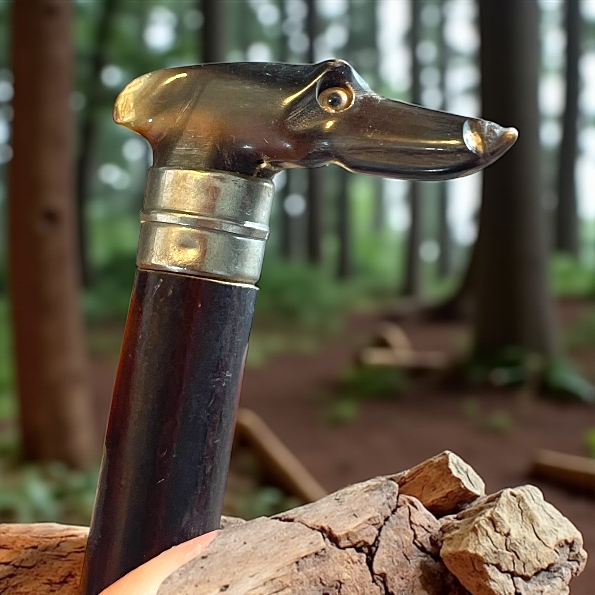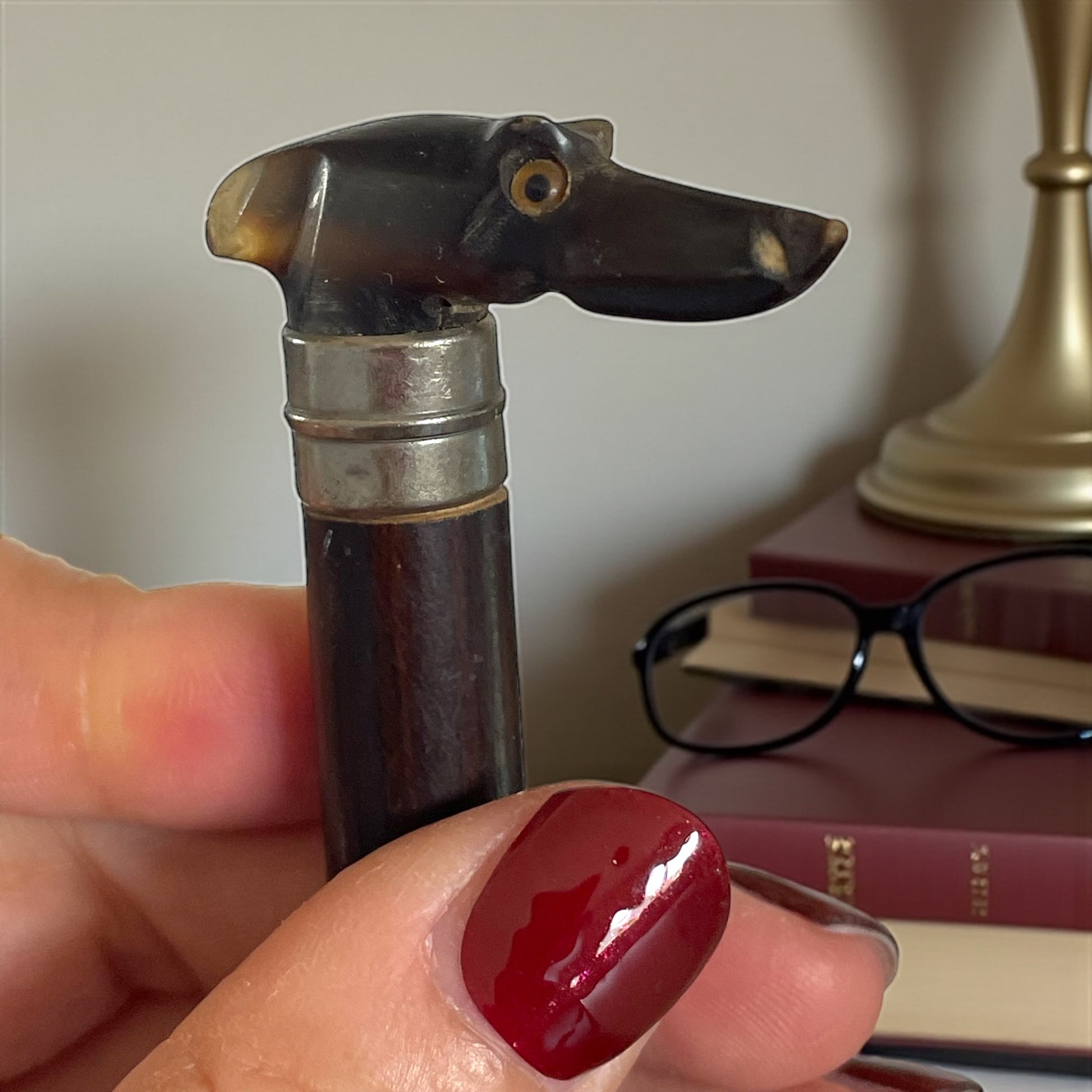 Non è solo un manico da ombrellino: è l’incontro con uno sguardo che attraversa il tempo. Il levriero, scolpito nel corno, affiora dal buio lucente della materia con la sua linea snella e fiera. Gli occhi, due piccole sfere di vetro ambrato vivo, sembrano osservare ancora la strada, come se stessero accompagnando una passeggiata elegante tra viali ombreggiati e abiti leggeri di un pomeriggio vittoriano. La luce scivola sulla superficie levigata, disegnando riflessi caldi che invitano a sfiorarlo, a sentirne sotto le dita la forza del corno e la precisione dell’intaglio. Non è difficile immaginare il gesto di chi, stringendo questo manico, non teneva soltanto un ombrello, ma dichiarava con discrezione la propria appartenenza a un mondo fatto di stile, misura e distinzione. Un piccolo frammento di eleganza antica, capace ancora oggi di raccontare la sua storia a chi sa ascoltare con gli occhi.