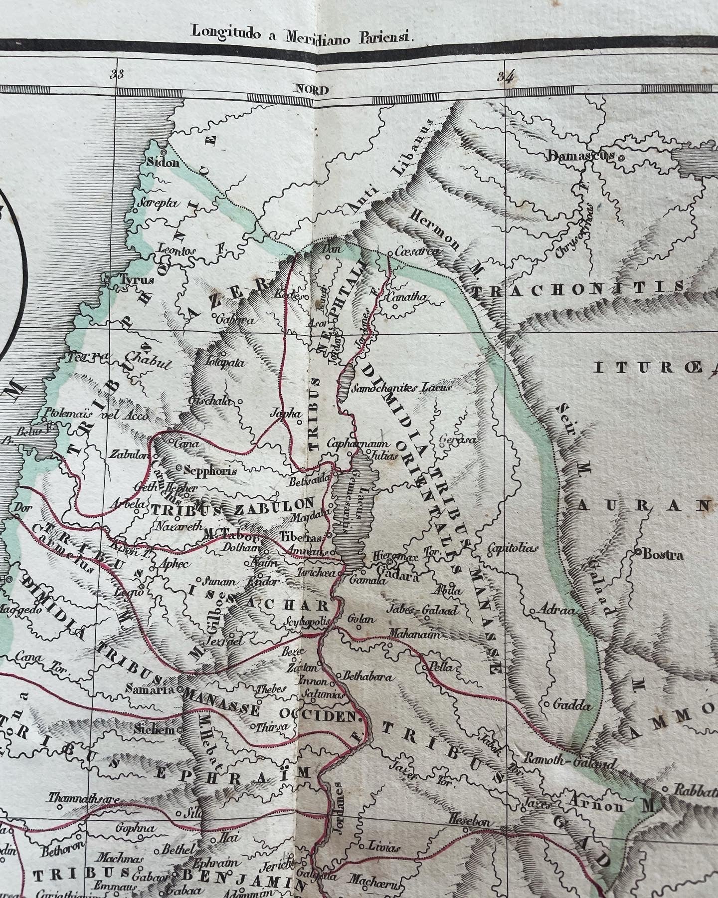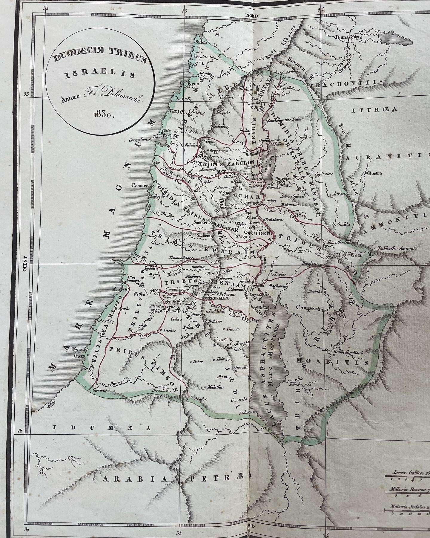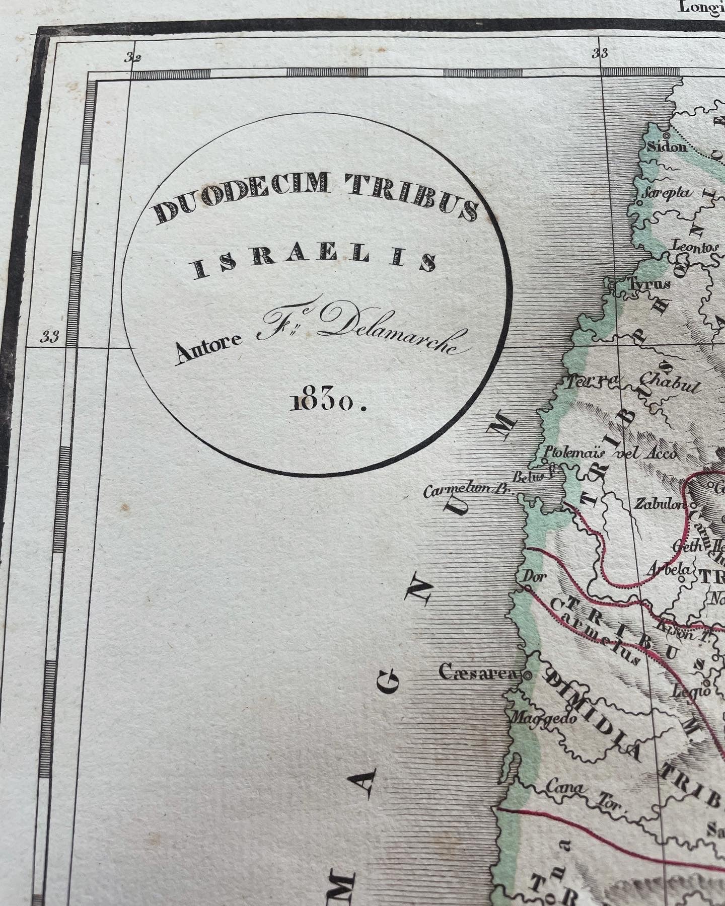 Very current (alas) this ancient map, dated 1830, a beautiful example drawn by Delamarche depicting the 12 tribes of Israel. The map is in excellent condition, ready to be framed, it wears its 200 years very well - it measures 37 centimeters by 31 centimeters.