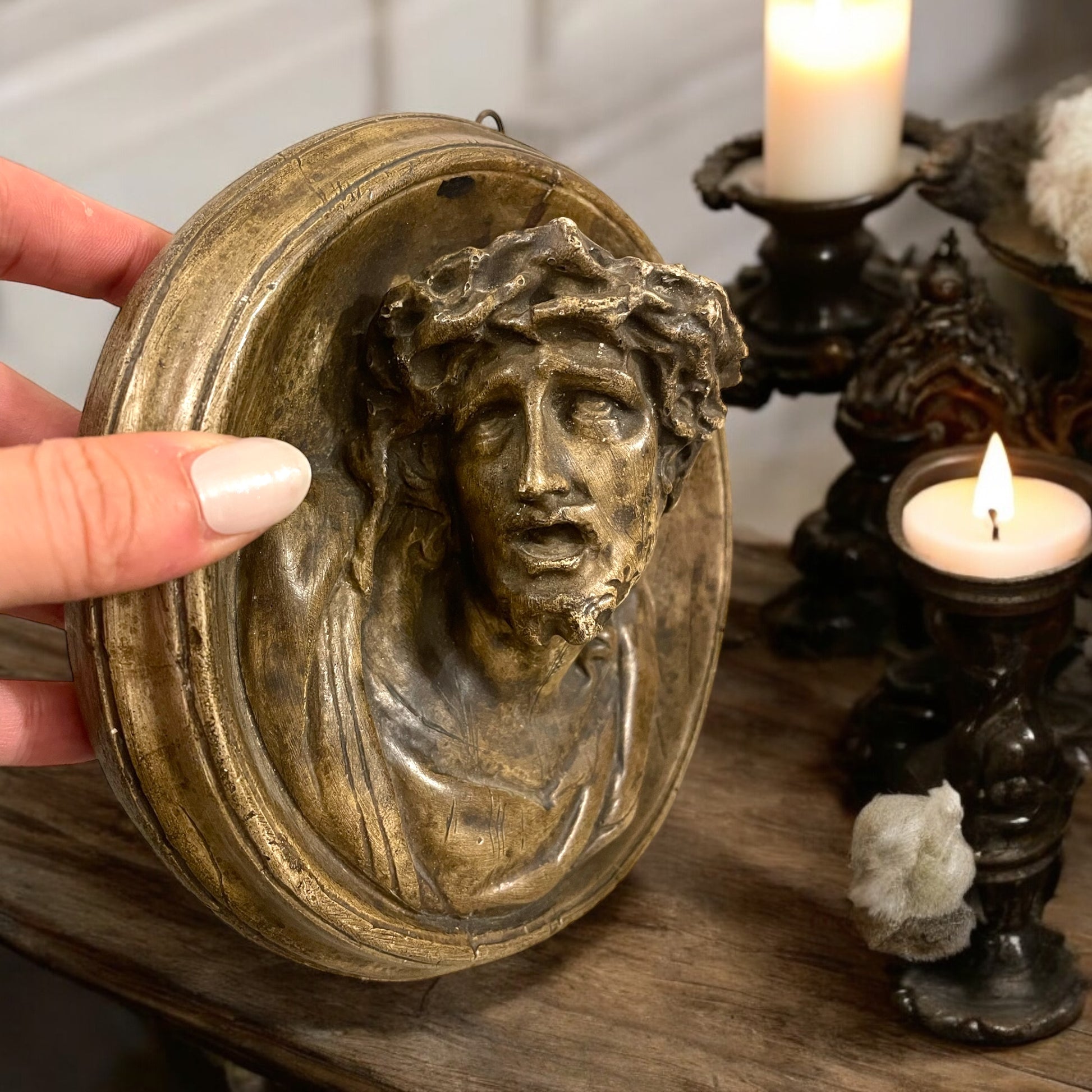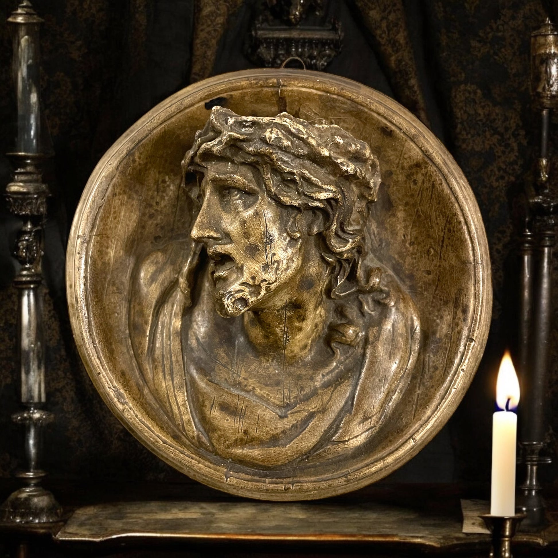 Questo suggestivo Medaglione ad altorilievo in gesso, databile tra la fine dell’Ottocento e l’inizio del Novecento, presenta un raffinato “Christus Patiens”, o Cristo sofferente. Questa iconografia, che si affermò a partire dal XIII secolo grazie agli ordini mendicanti come Francescani e Domenicani, mette al centro il sacrificio umano di Cristo. Il volto di Gesù, caratterizzato dall’espressione di dolore e dalla corona di spine, richiama il pathos della Passione, invitando i fedeli a una meditazione intima e compassionevole sul sacrificio redentore. La diffusione del “Christus Patiens” si lega alla volontà di sottolineare l’umanità di Cristo, in contrasto con le precedenti raffigurazioni trionfanti del “Christus Triumphans”. Questo cambiamento iconografico aveva lo scopo di avvicinare emotivamente i fedeli alla sofferenza di Gesù, favorendo una partecipazione empatica alla sua Passione. L’opera, concepita probabilmente per la devozione privata, conserva una bella patina che esalta la drammaticità dei tratti e il rilievo. Direi molto buona la conservazione; 16 cm il diametro.