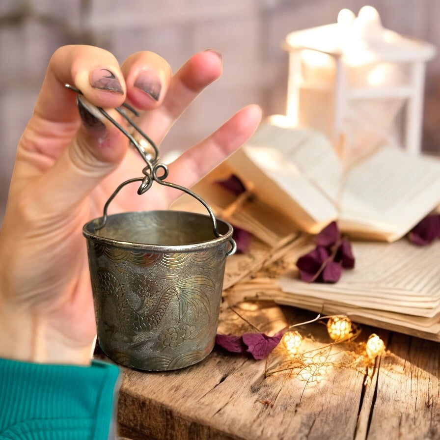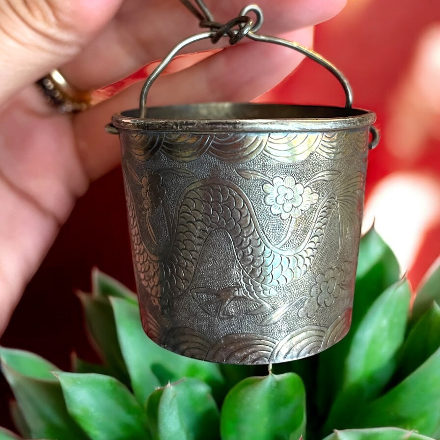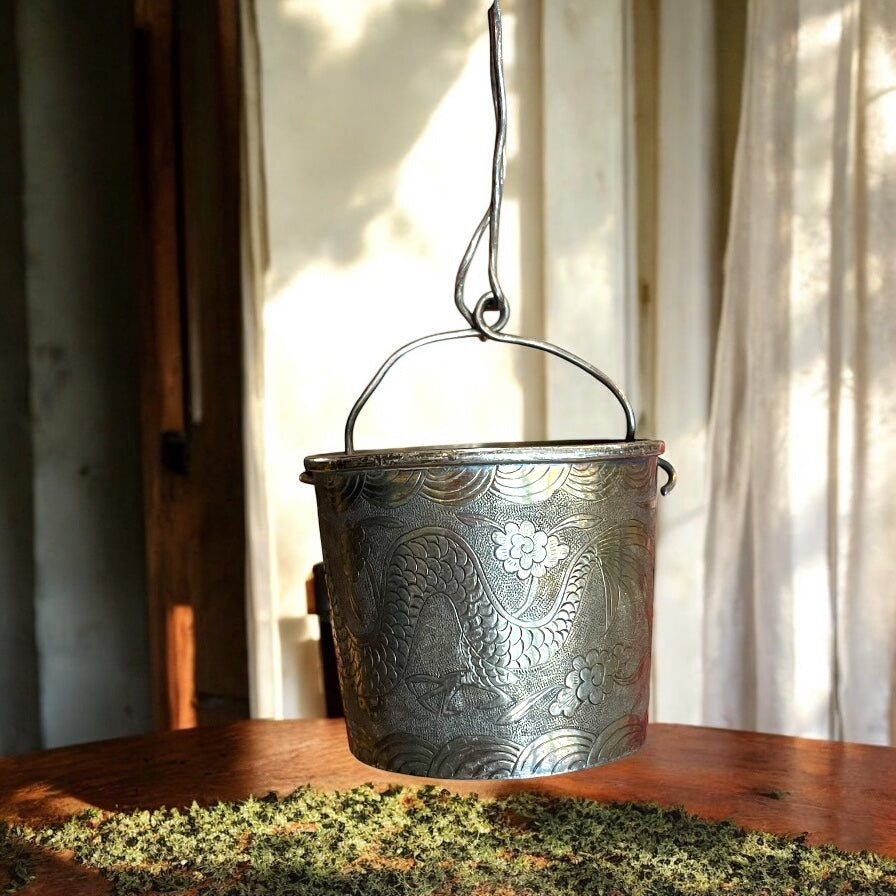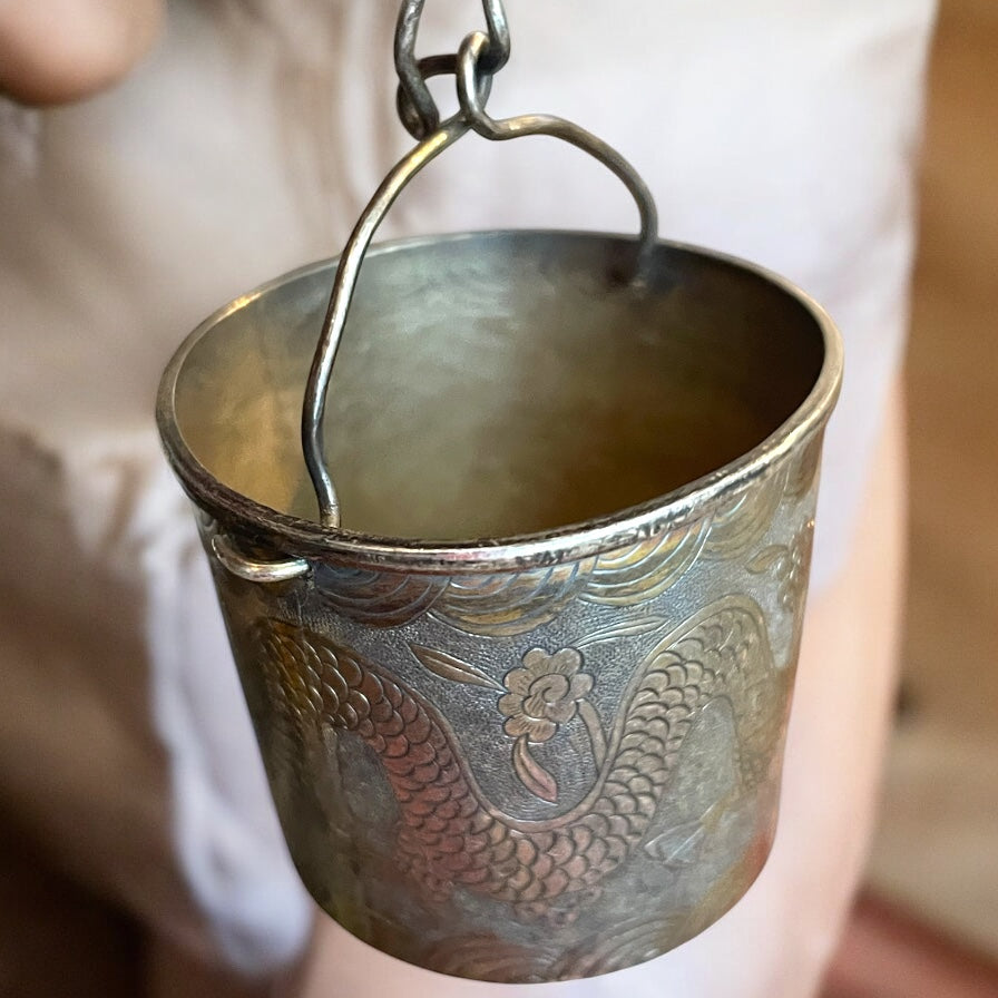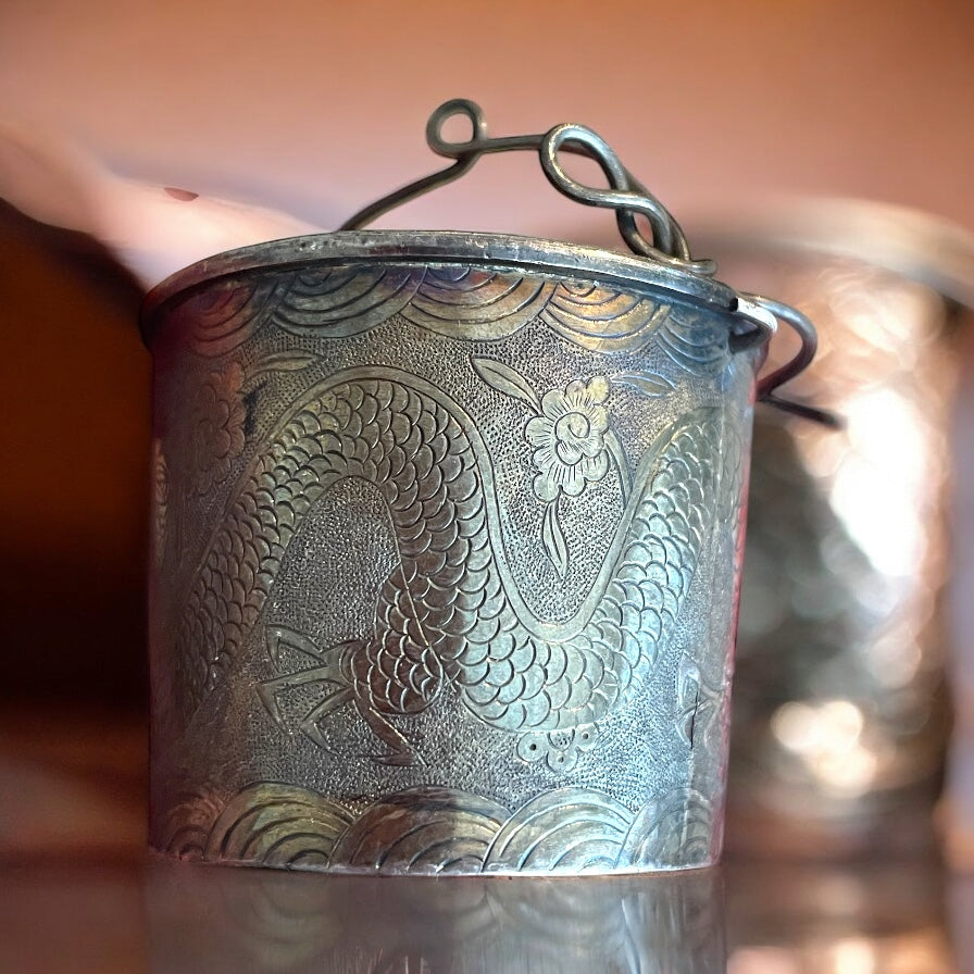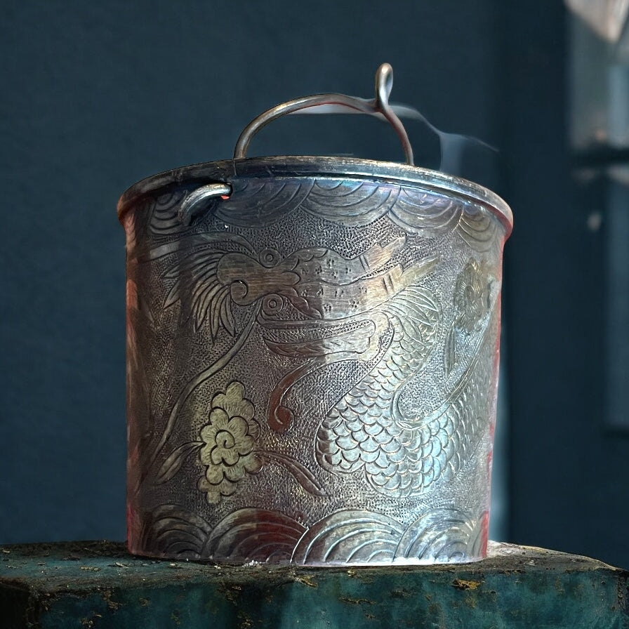 Quando il tè incontra il drago… una volta il tè era un rito e ogni sorso un invito alla contemplazione, e questo filtro in argento oggi ci racconta una storia antica. Leggero e prezioso, cesellato con un drago meraviglioso che danza tra onde e fiori, è nato per portare poesia. Il rito del tè, nella cultura asiatica, non era solo un momento di pausa: era un gesto sacro, un incontro tra spirito e materia, un’arte raffinata che insegnava la pazienza e l’eleganza. Gli accessori come questo filtro per foglie diventavano scrigni di bellezza: ogni dettaglio, ogni decoro inciso non era casuale, ma parte di un mondo simbolico profondo. Il drago, signore dei cieli e custode delle acque, era scolpito qui come protettore e portatore di prosperità. Le sue squame che si intrecciano con i fiori rappresentano la forza e la grazia, l’energia vitale che scorre tra le mani e la mente di chi prepara il tè. Le onde, delicate e continue, ricordano il movimento dell’acqua e il fluire del tempo. Possedere questo filtro d’argento significa aver con sé un frammento di cerimonia, un talismano che racconta la bellezza di un gesto antico. Ogni infuso che passa attraverso di lui diventa un piccolo viaggio, un rituale che sa trasformare una tazza di tè in un invito alla pace interiore.