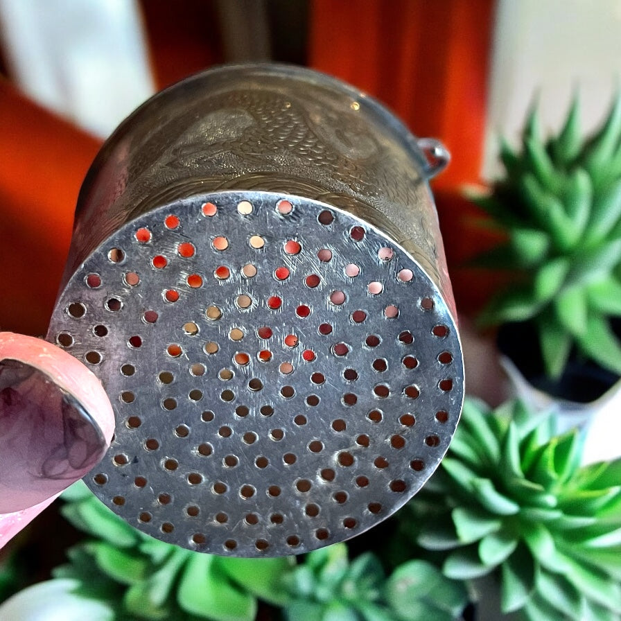 Meraviglioso antico filtro in argento per foglie da tè decorato con drago