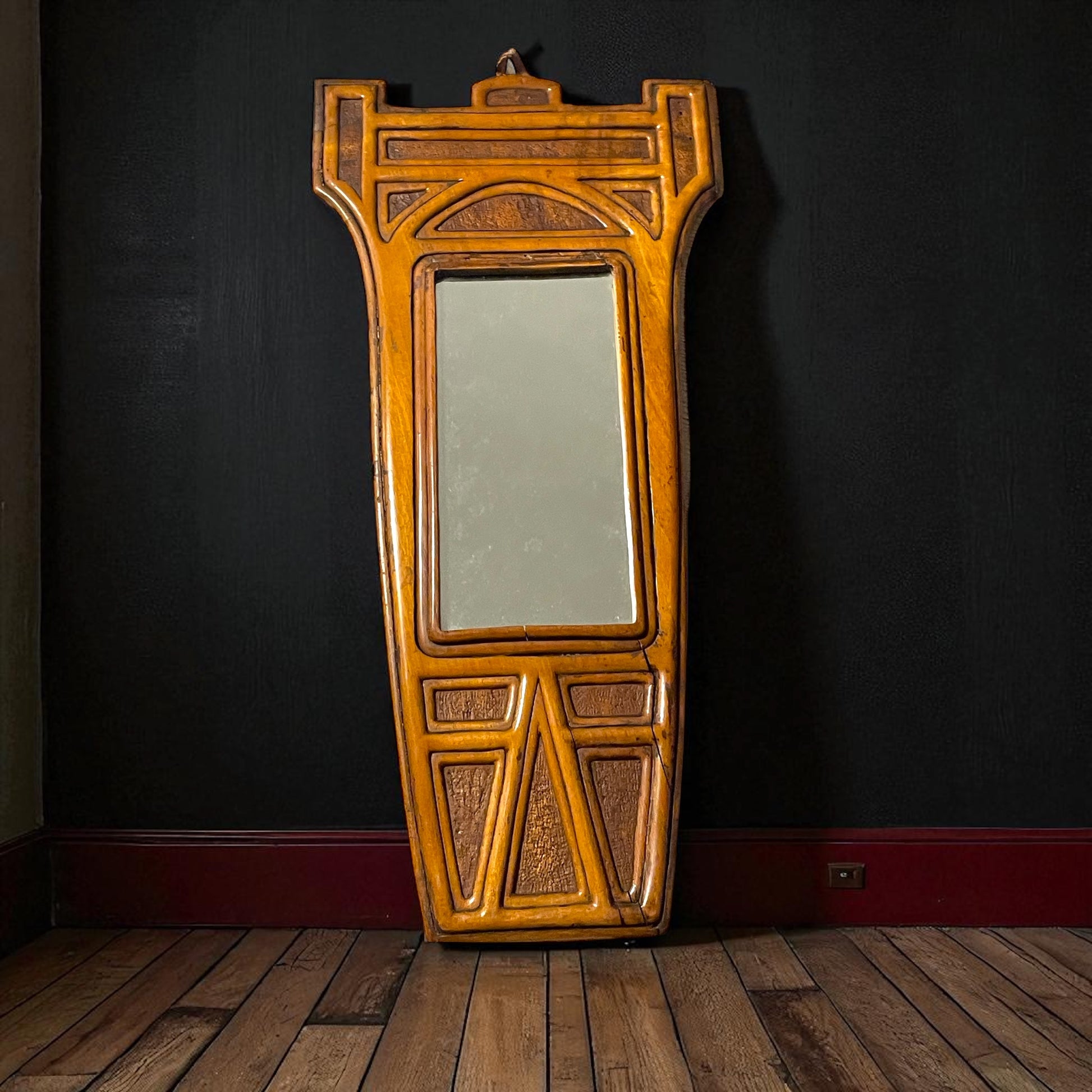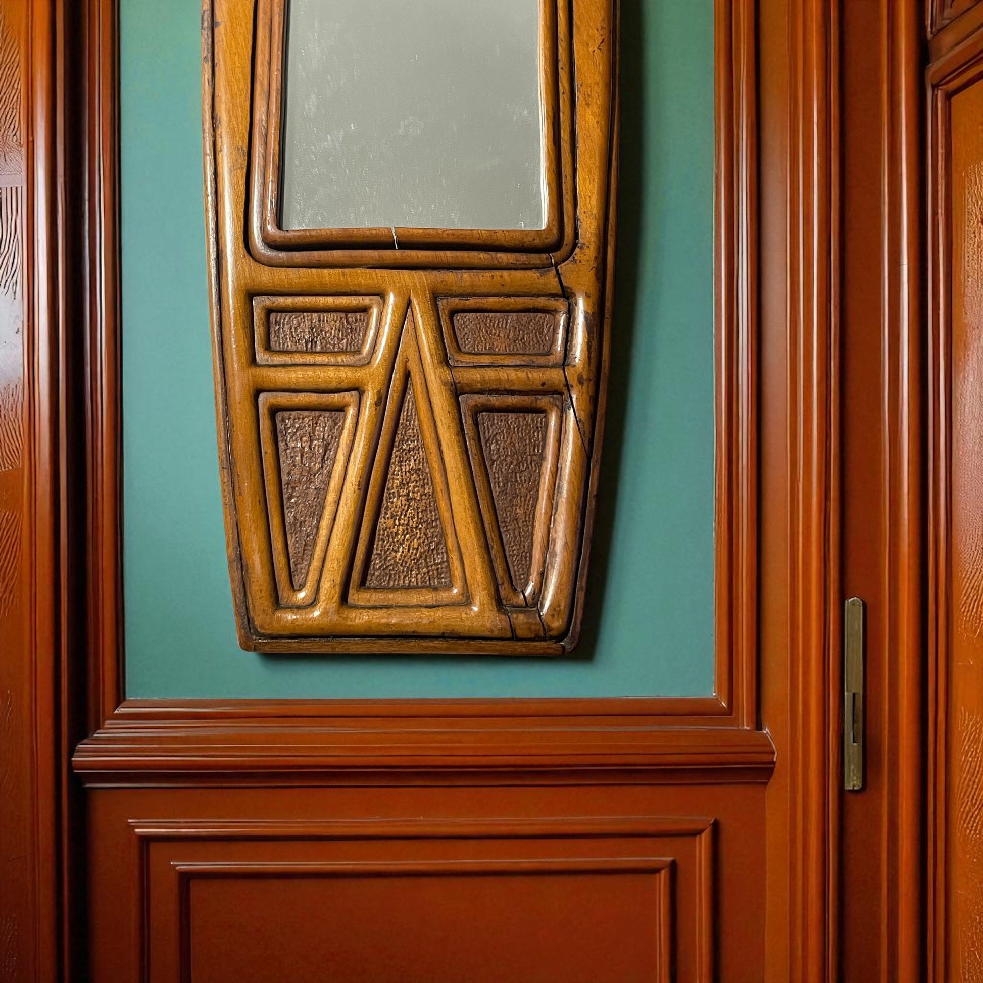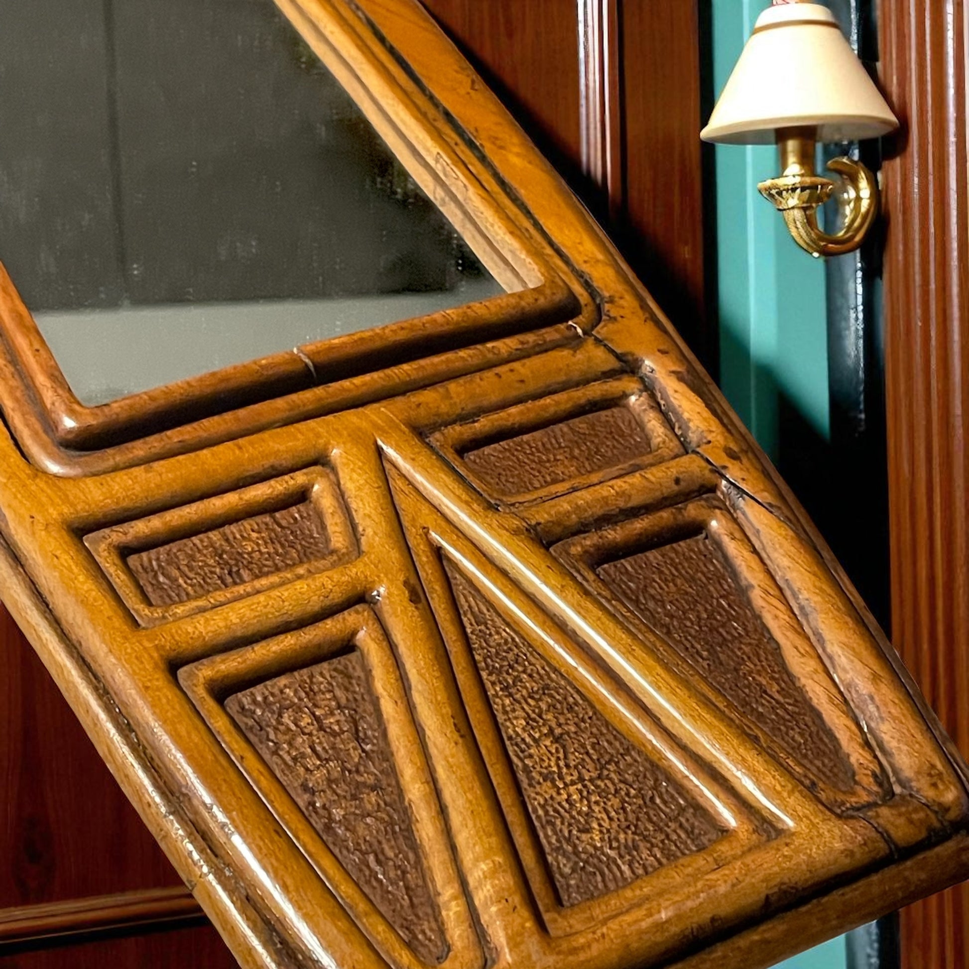 C’è un momento, entrando in casa, in cui lo sguardo si posa su qualcosa che sembra appartenere a un’altra epoca. Questo specchio, con la sua silhouette slanciata e i decori geometrici scolpiti nel legno, racconta l’eleganza degli anni ’20 e ’30, quando ogni linea era studiata per catturare la luce e incorniciare la bellezza. Le forme simmetriche e i contrasti tra superfici lisce e texture martellate invitano a immaginare un corridoio raffinato, una casa dove il gesto di specchiarsi era un rituale, non una distrazione fugace. Portarlo con sé significa dare spazio a un’eleganza senza tempo, dove ogni riflesso diventa parte di una storia che si rinnova ogni giorno. Nelle foto vi indico una crepa presente che non altera la bellezza del pezzo, il quale del resto ha cent’anni e li dimostra con orgoglio. Le dimensioni sono: 48 x 23 cm.