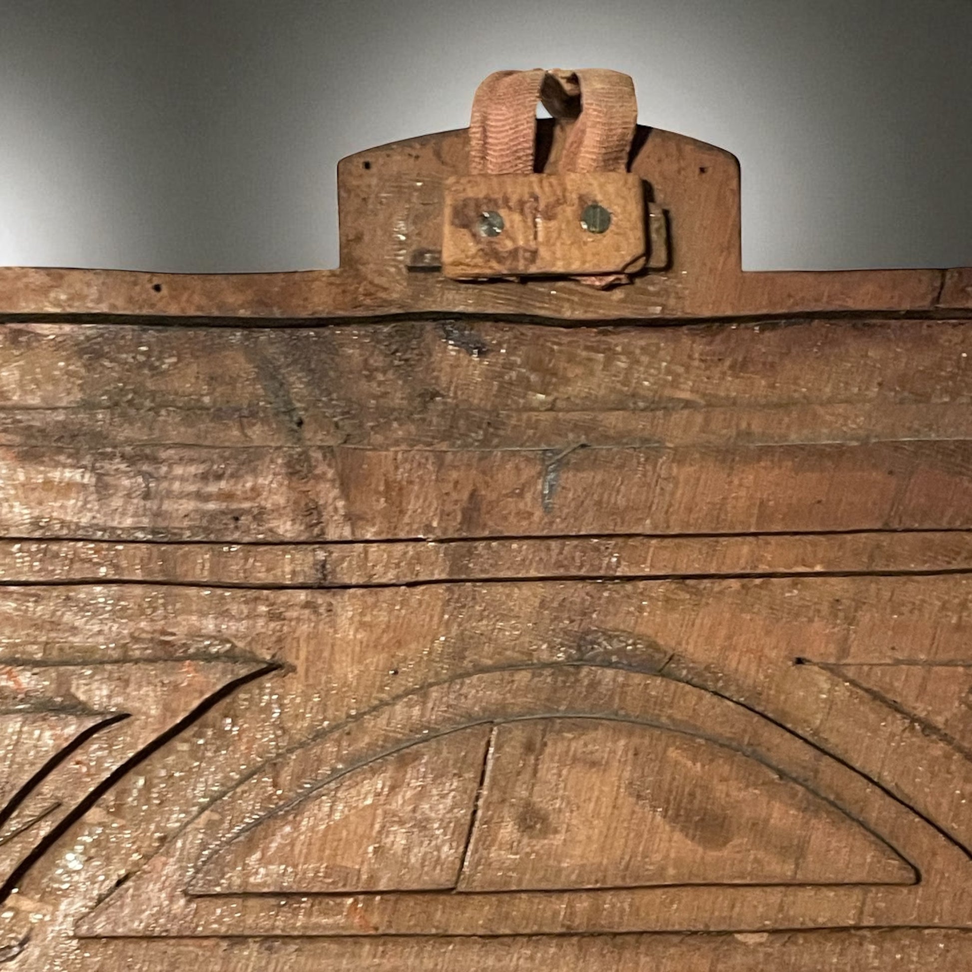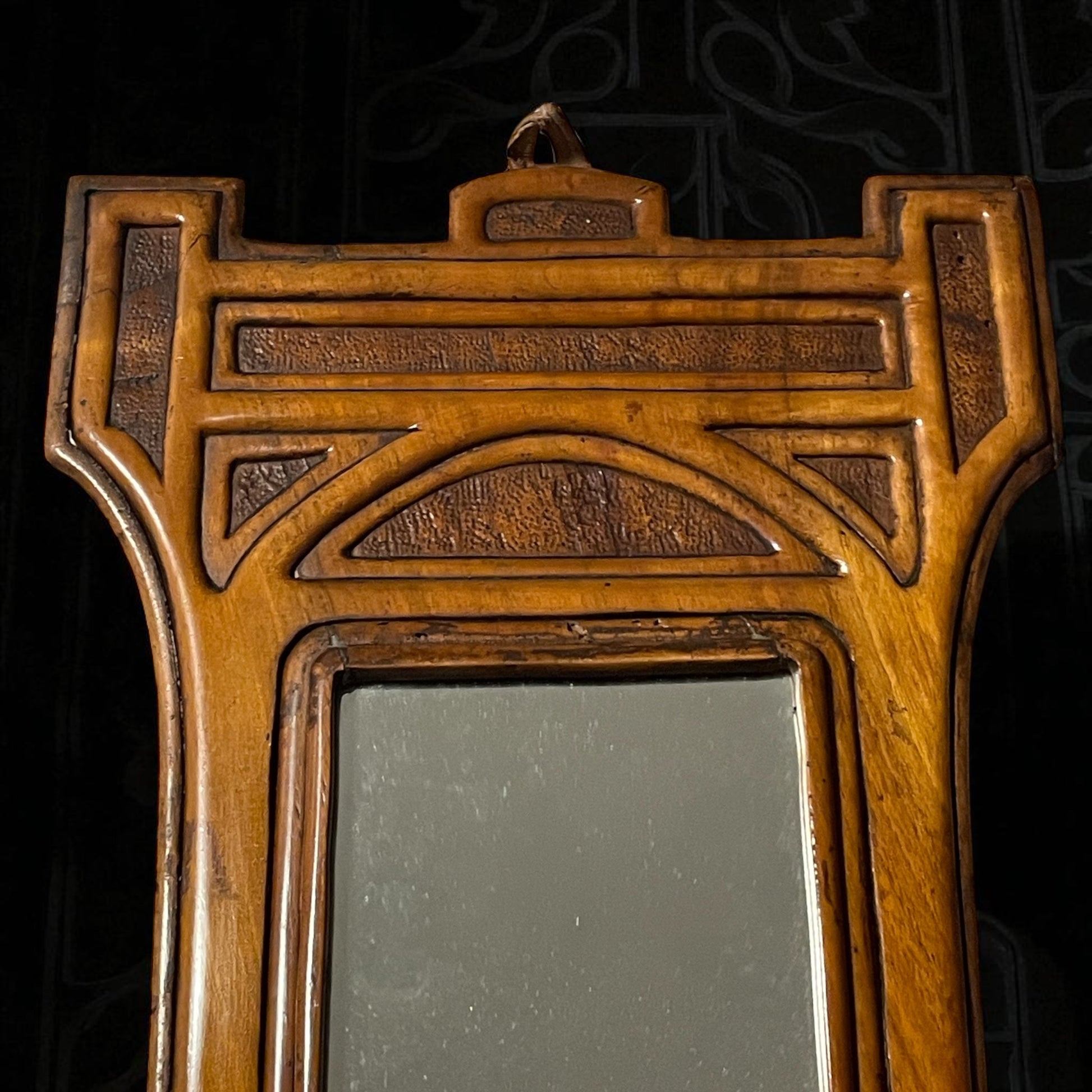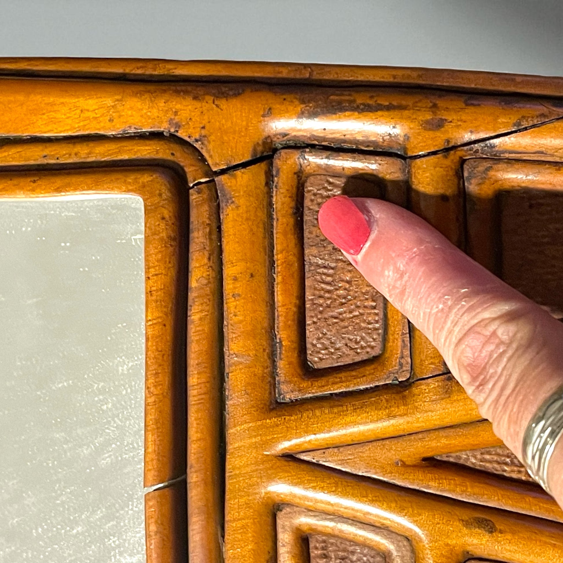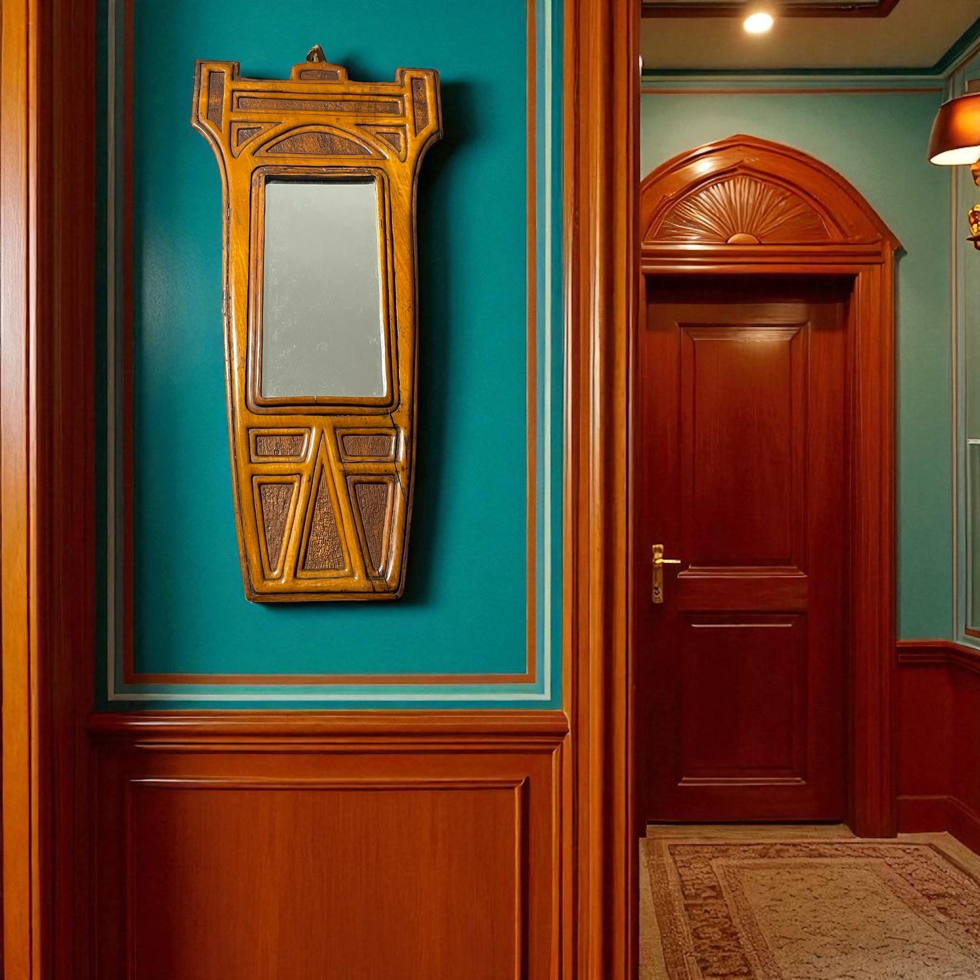 C’è un momento, entrando in casa, in cui lo sguardo si posa su qualcosa che sembra appartenere a un’altra epoca. Questo specchio, con la sua silhouette slanciata e i decori geometrici scolpiti nel legno, racconta l’eleganza degli anni ’20 e ’30, quando ogni linea era studiata per catturare la luce e incorniciare la bellezza. Le forme simmetriche e i contrasti tra superfici lisce e texture martellate invitano a immaginare un corridoio raffinato, una casa dove il gesto di specchiarsi era un rituale, non una distrazione fugace. Portarlo con sé significa dare spazio a un’eleganza senza tempo, dove ogni riflesso diventa parte di una storia che si rinnova ogni giorno. Nelle foto vi indico una crepa presente che non altera la bellezza del pezzo, il quale del resto ha cent’anni e li dimostra con orgoglio. Le dimensioni sono: 48 x 23 cm.