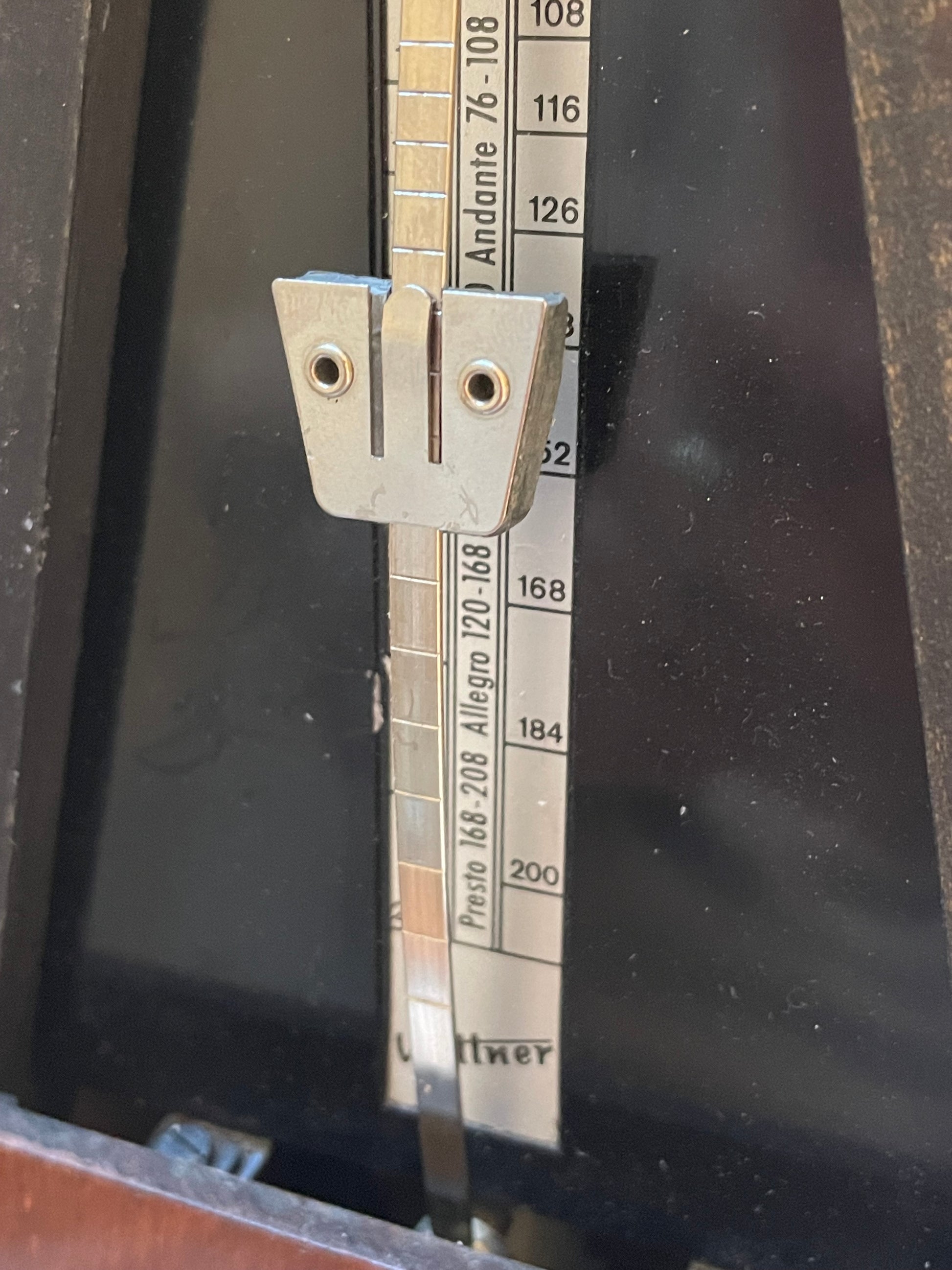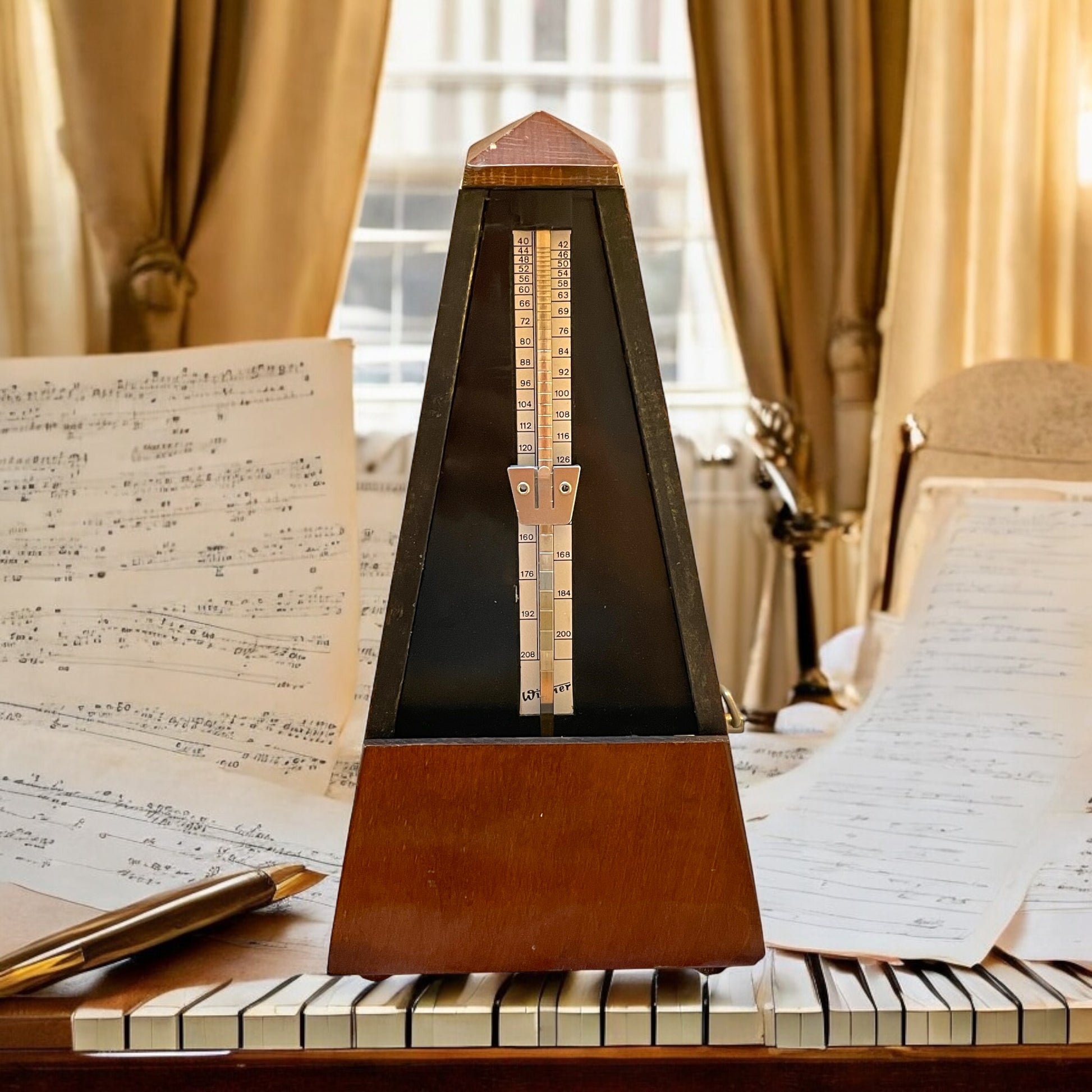 Metronomo Wittner: il battito del tempo… non un semplice strumento, ma un oggetto capace di evocare l’anima della musica e il respiro dei tempi passati. Questo metronomo meccanico Wittner, custodito con cura e amore, rappresenta l’arte di scandire il ritmo con precisione e poesia. Realizzato con la cassa in legno color mogano, la classica forma piramidale, dettagli in acciaio e plastica. Wittner è il nome che ha accompagnato generazioni di musicisti, è un marchio che non ha bisogno di presentazioni: sinonimo di eccellenza tedesca e meccanica impeccabile, ha trasformato uno strumento tecnico in un compagno silenzioso di ogni esecuzione. Ben conservato, ancora provvisto della chiave di carica originale e funzionante, questo metronomo è pronto a tornare in vita… che sia per accompagnare un musicista o semplicemente per raccontare una storia nella vetrina di un collezionista. Non è solo un testimone del tempo: lo incarna, battito dopo battito. N.B. Wittner ha riproposto modelli simili ma assolutamente contemporanei che potete trovare in vendita, nuovi naturalmente, a circa euro 200. Attenzione, questo non è un metronomo contemporaneo, ma Vintage.