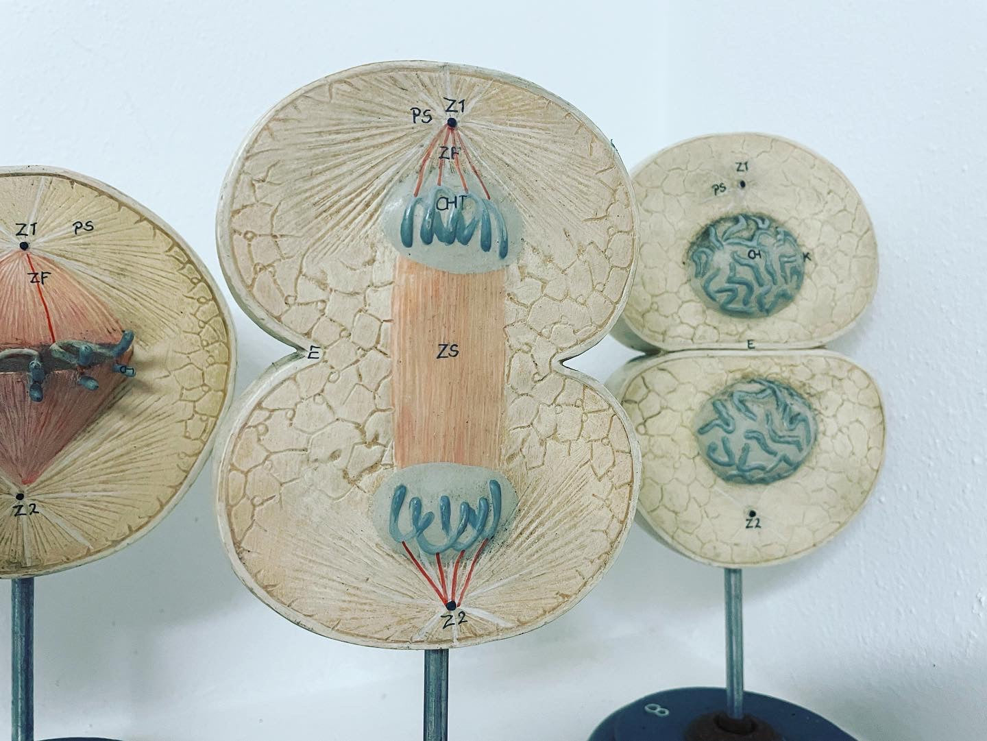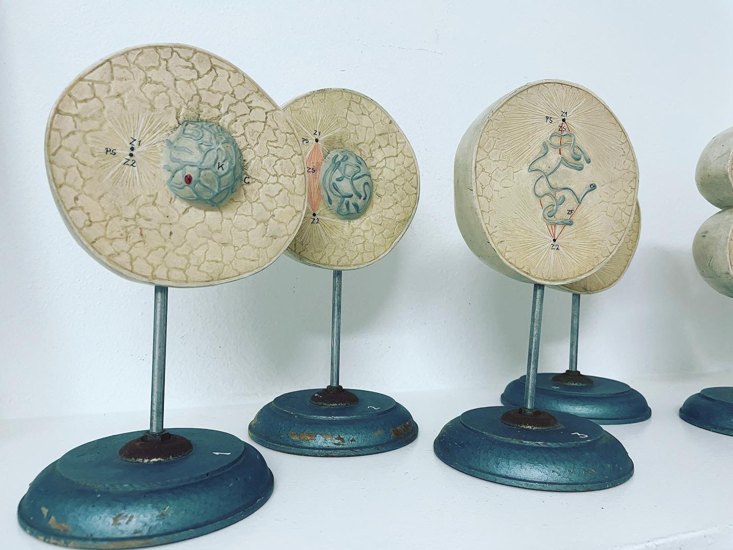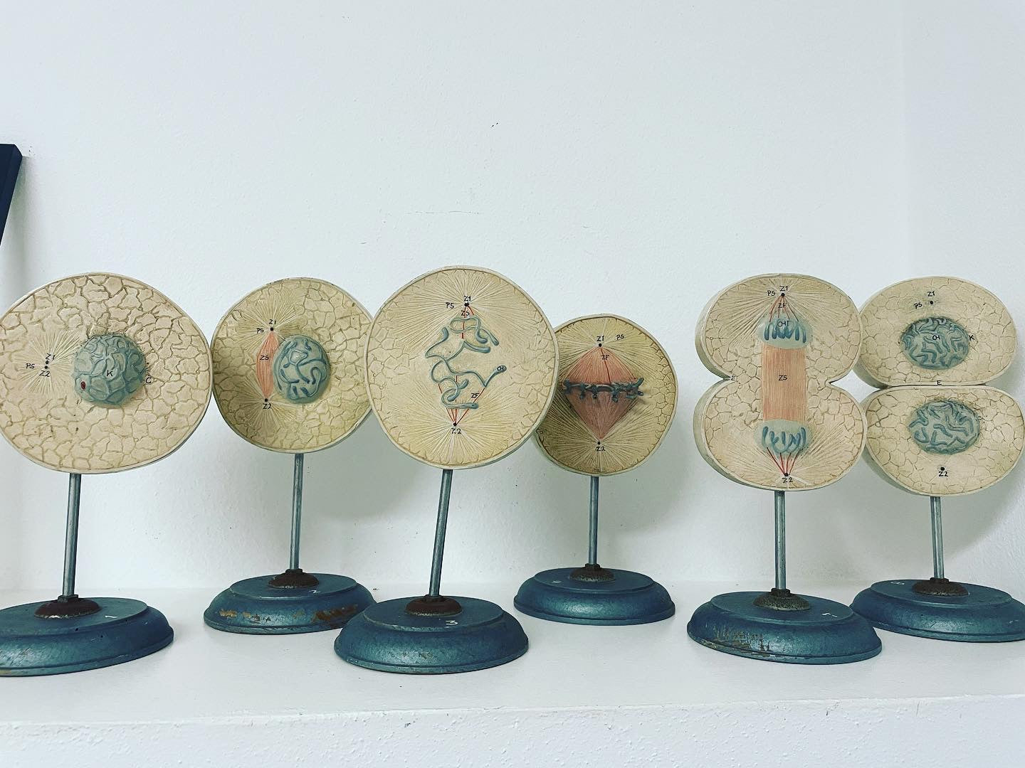 A spectacular and super #cabinetdescuriosites good morning this morning with this #collection of #atomicmodels from the #40s ... the #celldivision reproduced in its phases in 9 representations of which we have 7, numbered, 25 cm high and made with great attention to detail. They belonged to an #ancientuniversity #medicalcollection. Do you see the wooden stands in the amphitheater, and the young university students listening...? It almost seems like you can hear the professor's voice. These are #uniqueobjects and purchases from museum or exhibition contexts are welcome.