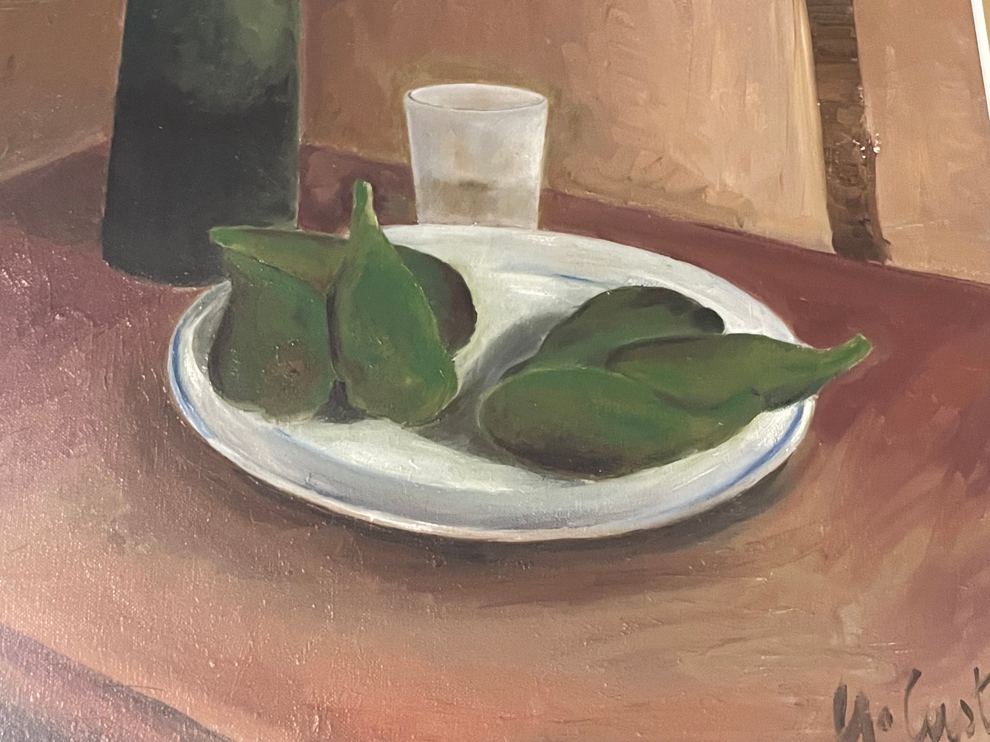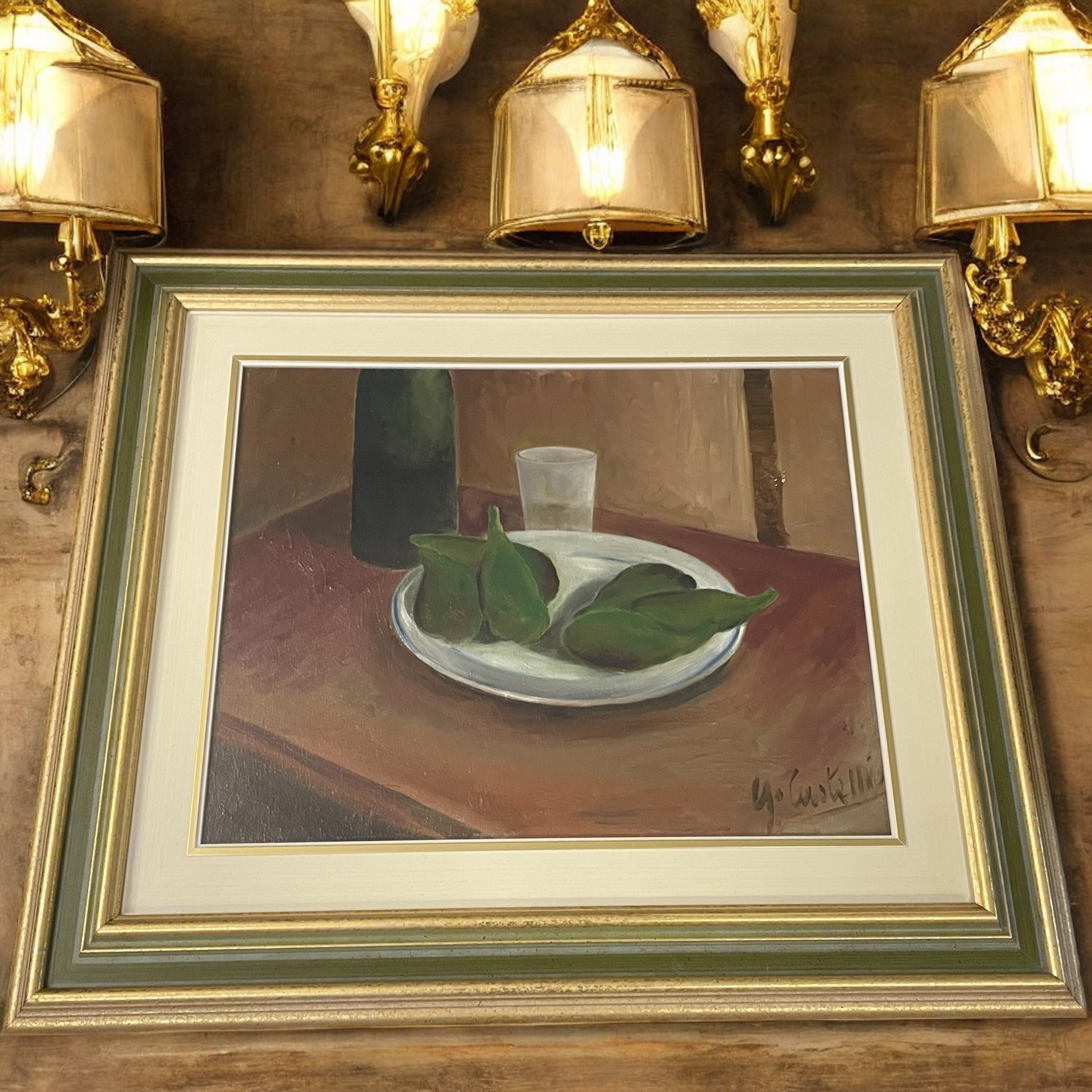 Nel realismo intimo, qui collocherei quest’opera. Sulla tavola di legno antico ci sono una bottiglia verde scuro, un bicchiere trasparente e delle verdure fresche - che riposano silenziose su un piatto bianco. La scena è essenziale, e proprio per questo densa di poesia. L’occhio si muove lentamente tra le forme solide, accarezzate da pennellate materiche ma delicate, che restituiscono la materialità delle superfici senza indulgere nei dettagli superflui. È un racconto visivo nato negli anni Cinquanta, in un’epoca in cui l’arte della natura morta veniva ripensata in chiave moderna: meno sfarzo, più verità. I colori terrosi, il taglio compositivo semplice ma incisivo, la presenza concreta degli oggetti, raccontano di un realismo intimo e raccolto, lontano dalle fastosità del passato. Osservandolo si ha quasi la sensazione di poter toccare la ruvidità del legno, sentire il peso della bottiglia, percepire l’umidità vellutata dei frutti della terra. È un frammento di quotidianità, elevato a piccola eternità attraverso il gesto pittorico. Un’opera che invita a rallentare il passo, a contemplare la bellezza delle cose semplici, a immergersi in un tempo sospeso, dove ogni oggetto ha una sua dignità silenziosa.