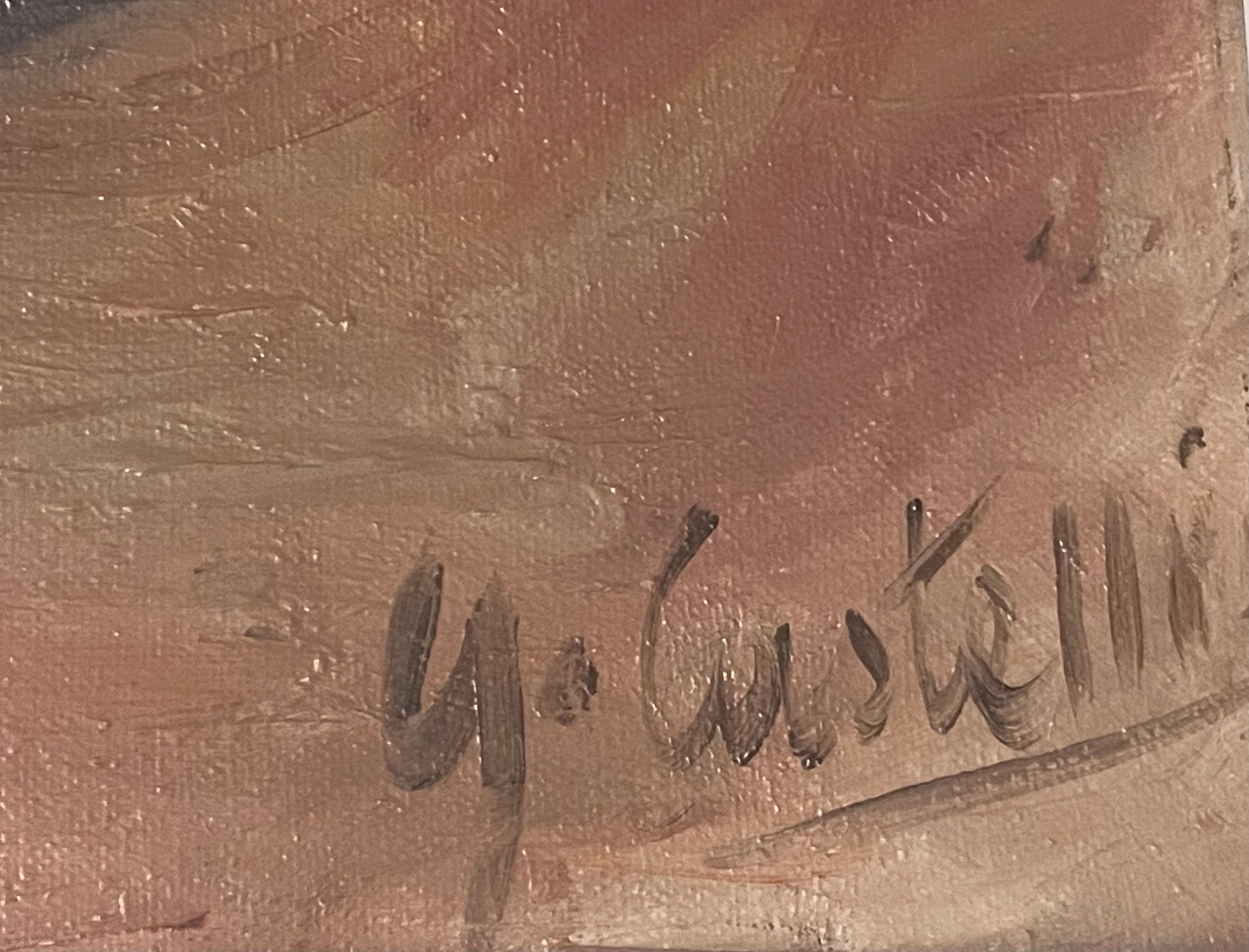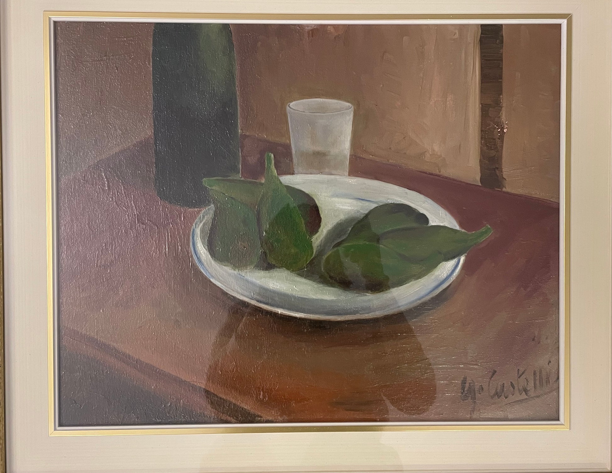 Natura morta anni ‘50, olio su tela, firmato G. Castelli. Dimensioni totali 75 × 63,5 cm (compresa la cornice).