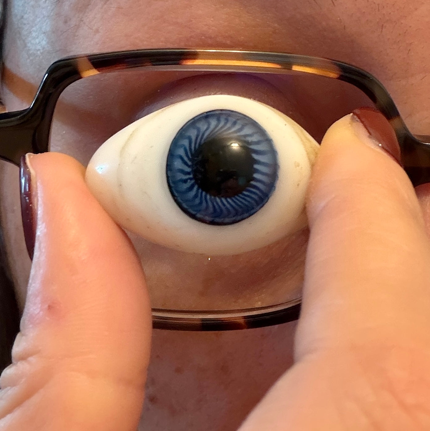 L’ho ritirato dopo averlo trovato adagiato sul fondo di una scatola nella bambagia, un frammento dimenticato di un vecchio gabinetto medico. Un occhio di vetro, compatto e pesante al tatto, con quella sfumatura blu che pare muoversi se lo inclini alla luce: filamenti che si aprono come piccole correnti d’acqua, un’iride dipinta a mano che racconta la pazienza degli artigiani di un tempo. Viene da un laboratorio polveroso, dove su banco in legno consumato l’artigiano che arroventava la punta di una bacchetta di vetro e tracciava le vene sottili una ad una seguiva le indicazioni dei medici per ridare luce a chi luce non aveva più. All’epoca questi oggetti non erano solo strumenti: erano tentativi di restituire dignità, normalità, speranza. Erano un modo per tornare nel mondo senza sentirsi osservati in un certo modo. Oggi quest’occhio di vetro è un piccolo frammento di storia materiale: uno di quegli oggetti che, messi su un tavolo, trasformano immediatamente l’atmosfera. È perfetto per collezionisti, scenografi, appassionati di curiosità mediche, cabinet de curiosités o storici della medicina. E, mentre lo guardi, è difficile non provare quella strana sensazione di essere tu ad essere visto.