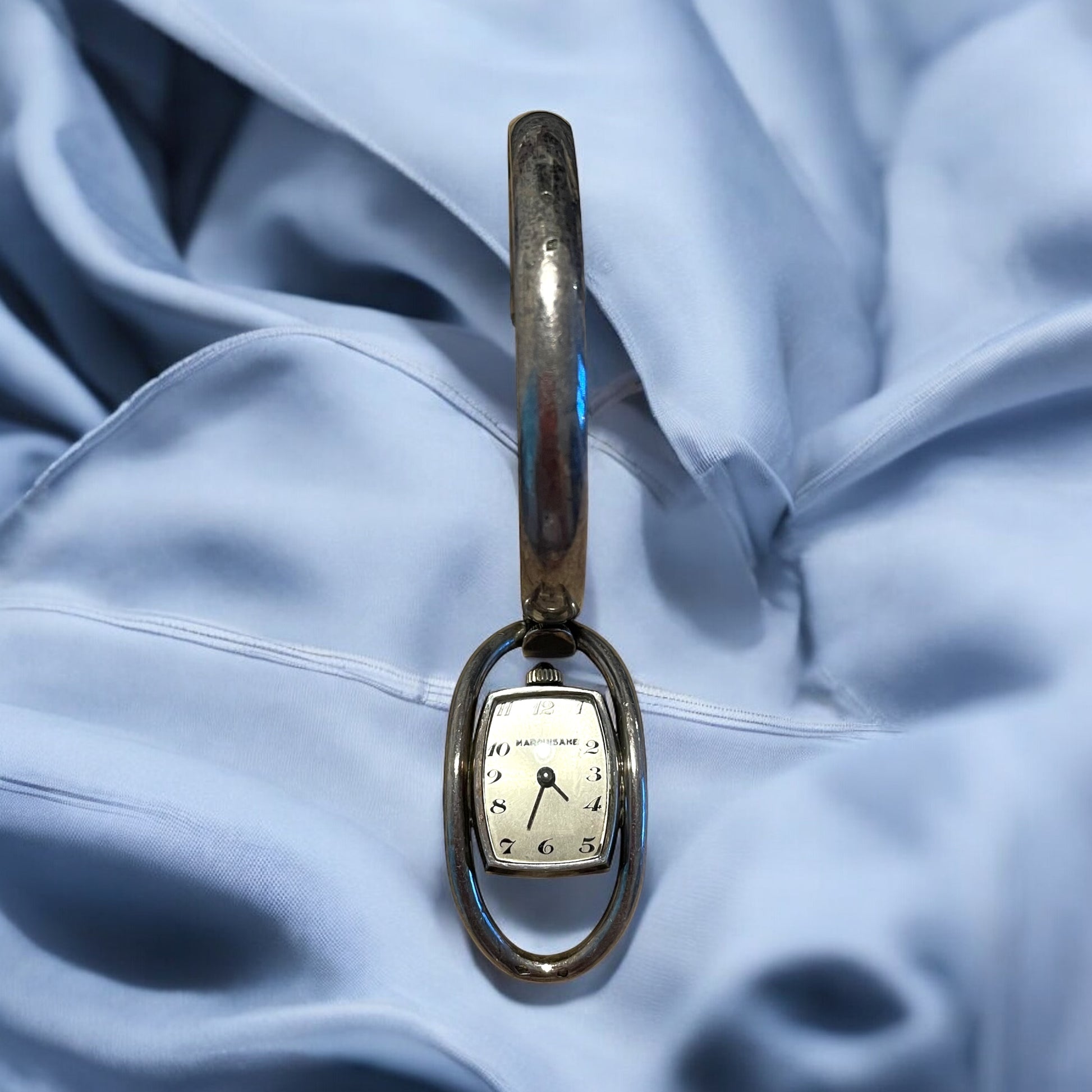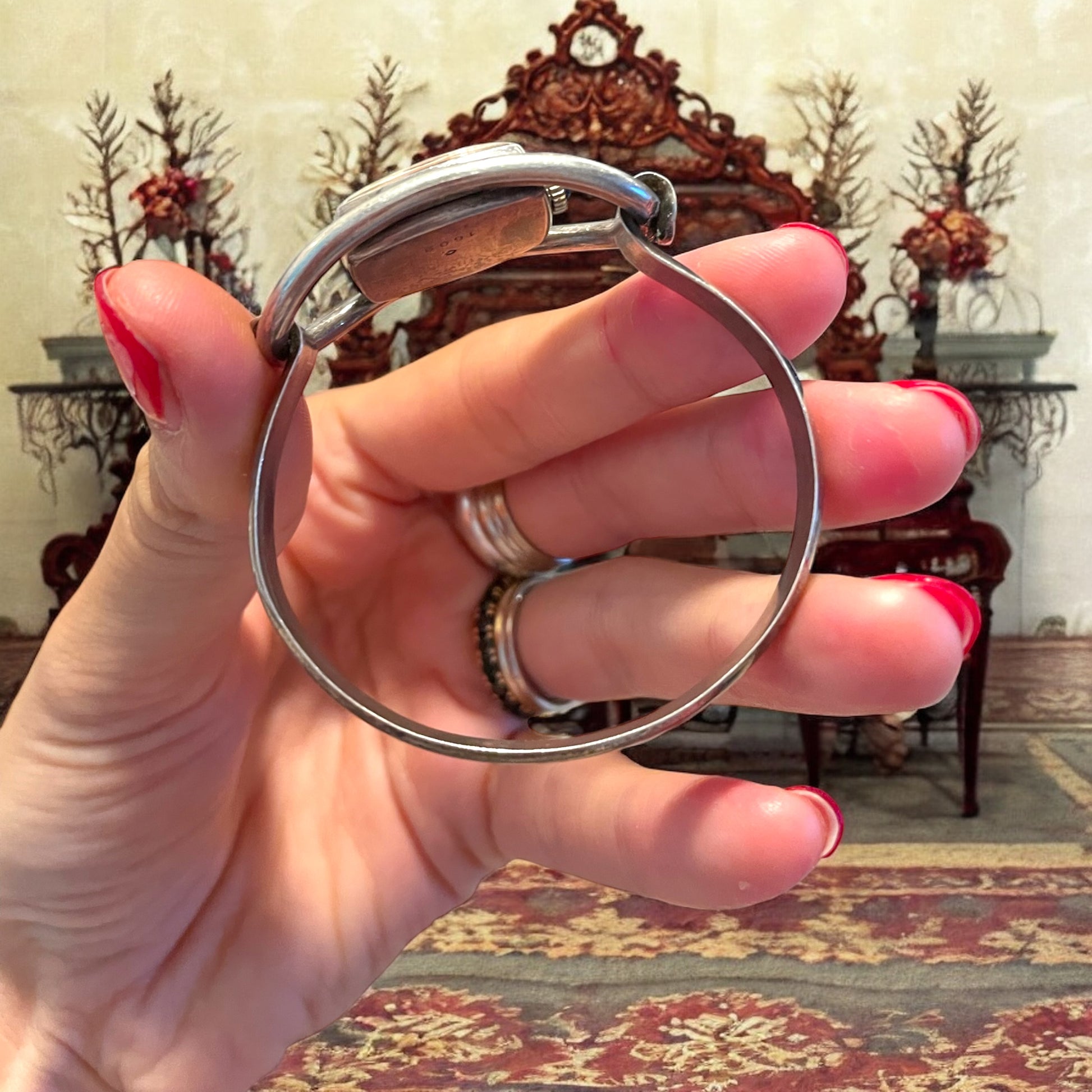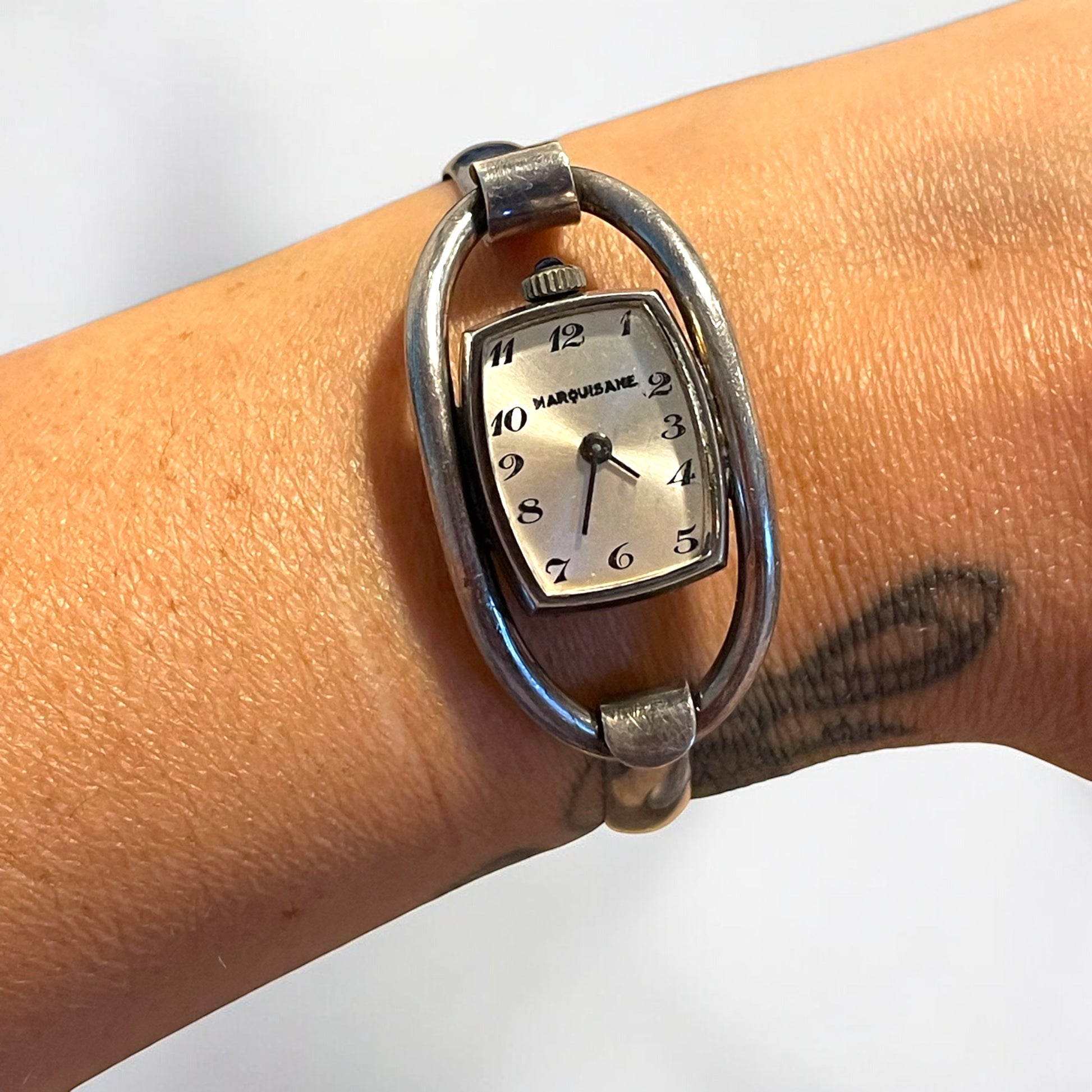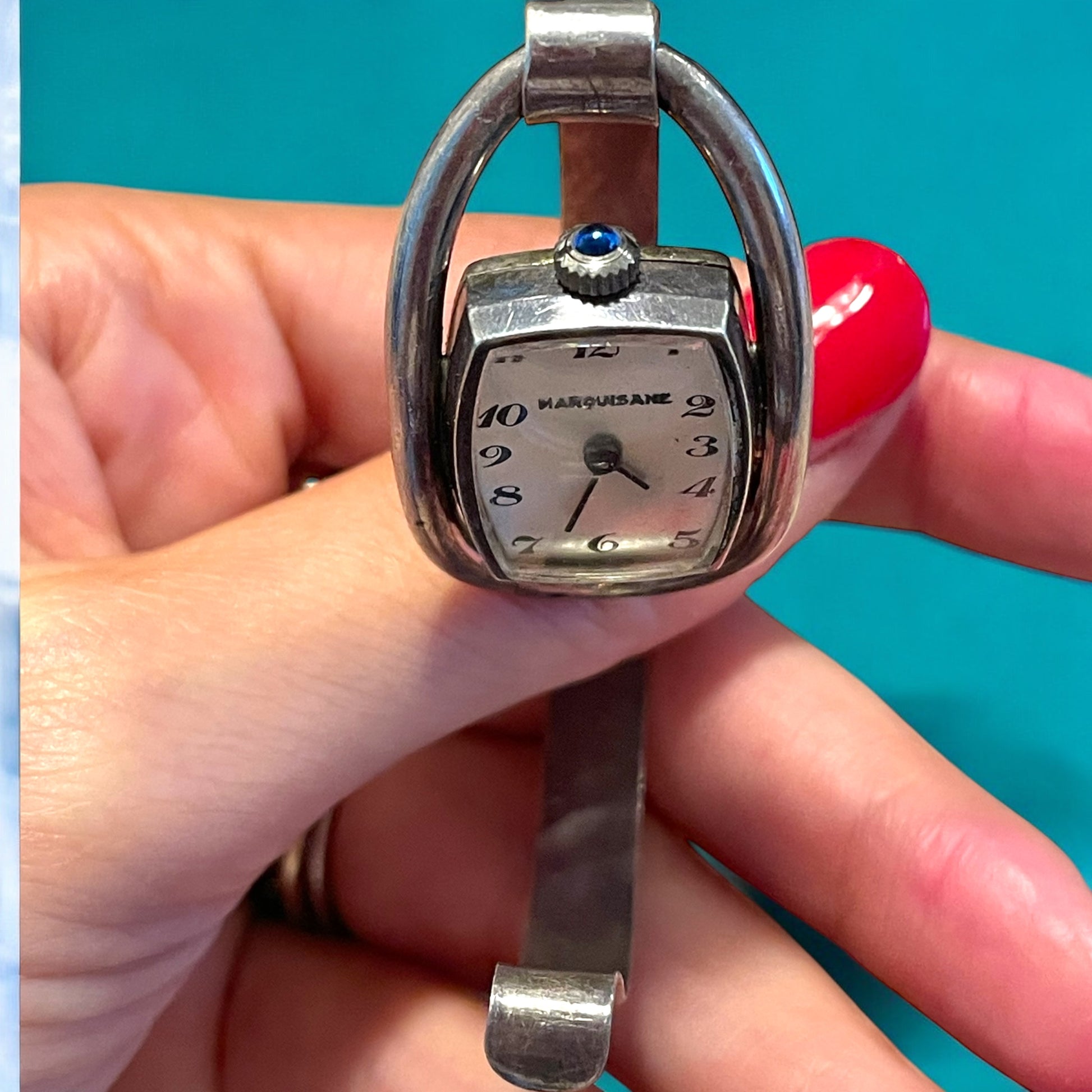 Orologio Marquisane, Francia, fine anni ’40 / inizio anni ’50, da polso rigido in argento massiccio punzonato (bracciale e cassa). Movimento meccanico a carica manuale, perfettamente funzionante. Cassa estraibile con corona decorata da cabochon blu. Peso totale: 28 grammi. Diametro interno bracciale: 5,5 cm – adatto a polsi piccoli e medi.