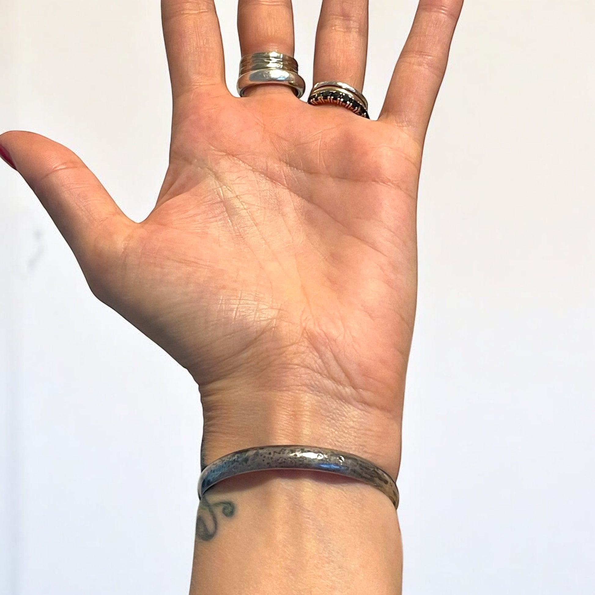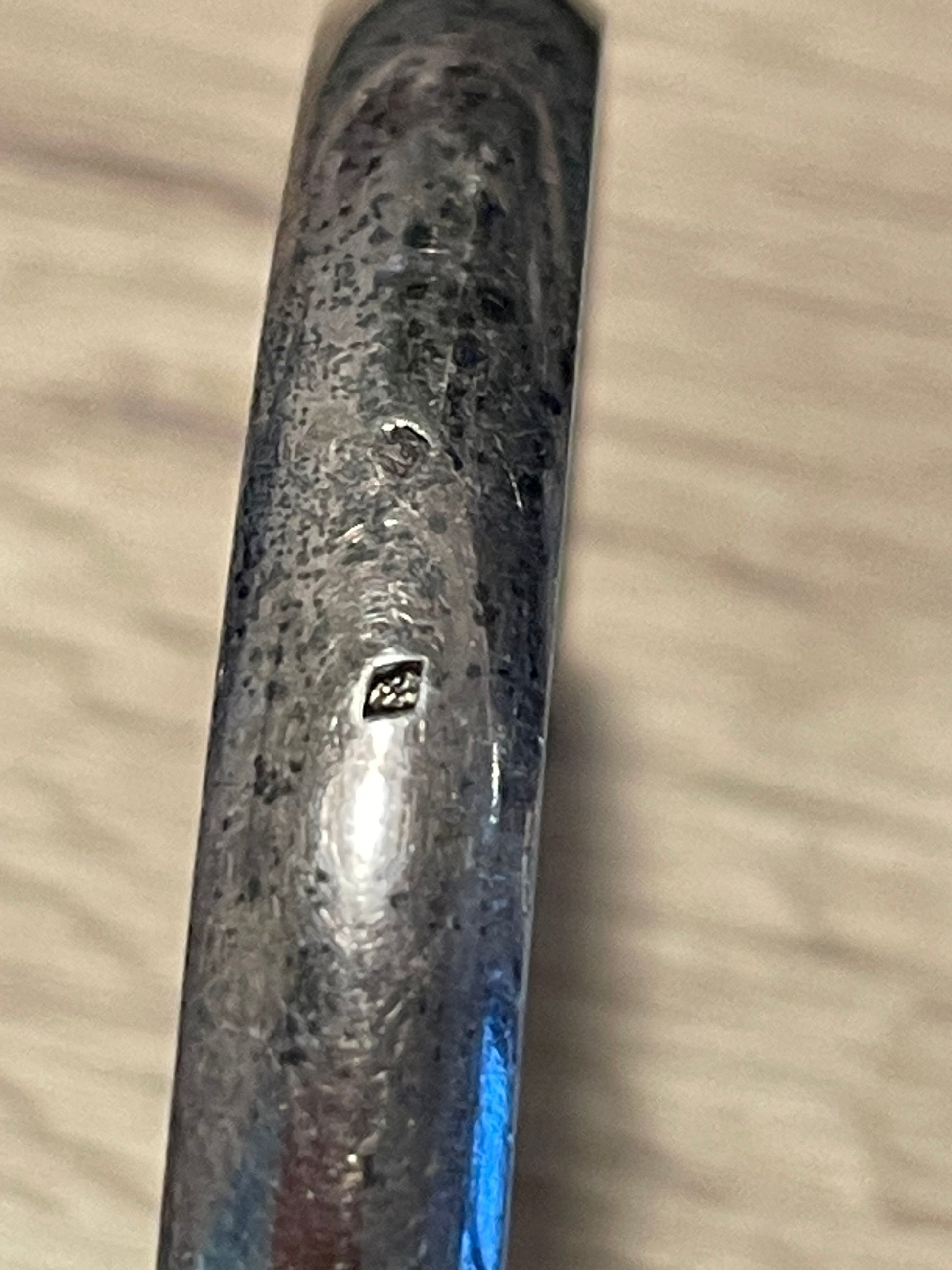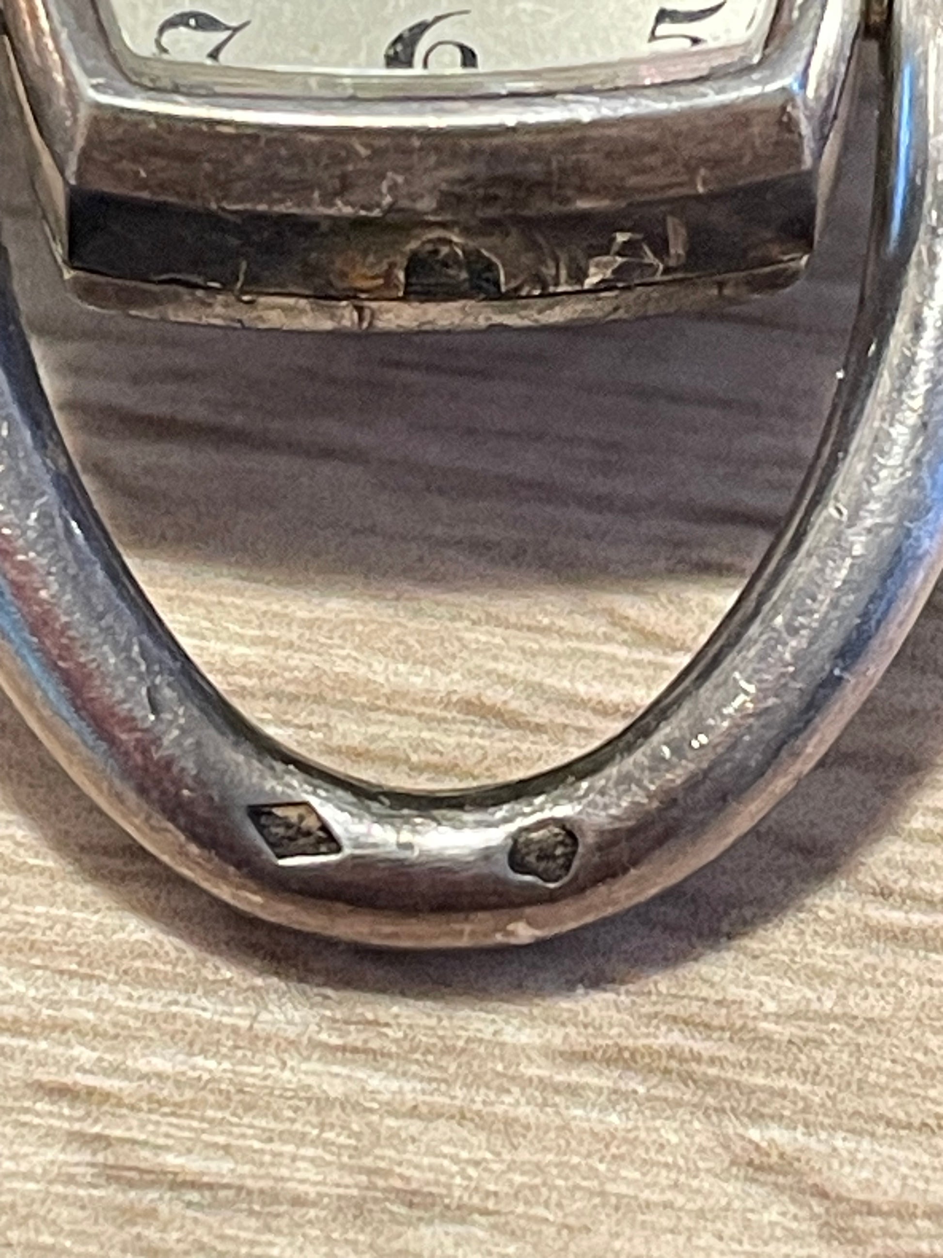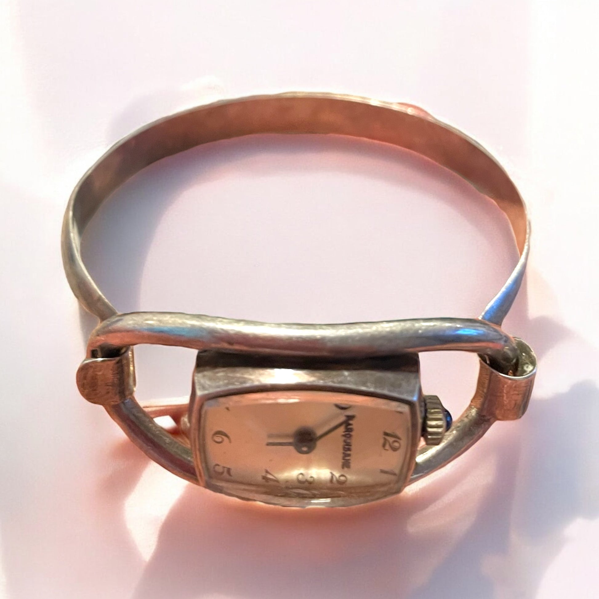 Orologio Marquisane, Francia, fine anni ’40 / inizio anni ’50, da polso rigido in argento massiccio punzonato (bracciale e cassa). Movimento meccanico a carica manuale, perfettamente funzionante. Cassa estraibile con corona decorata da cabochon blu. Peso totale: 28 grammi. Diametro interno bracciale: 5,5 cm – adatto a polsi piccoli e medi.