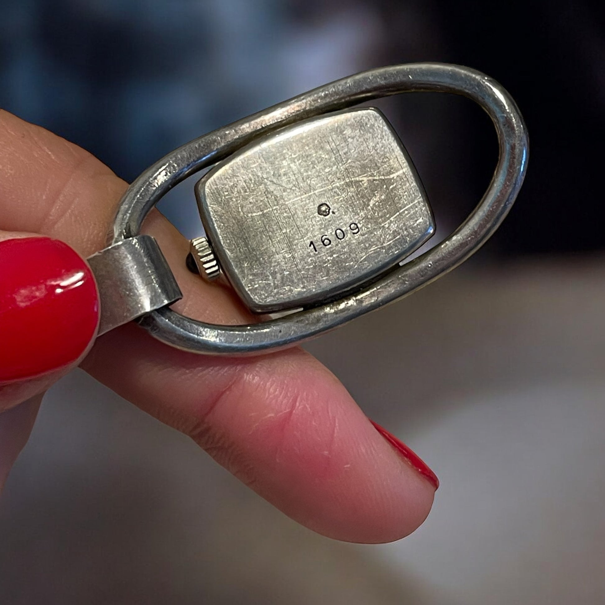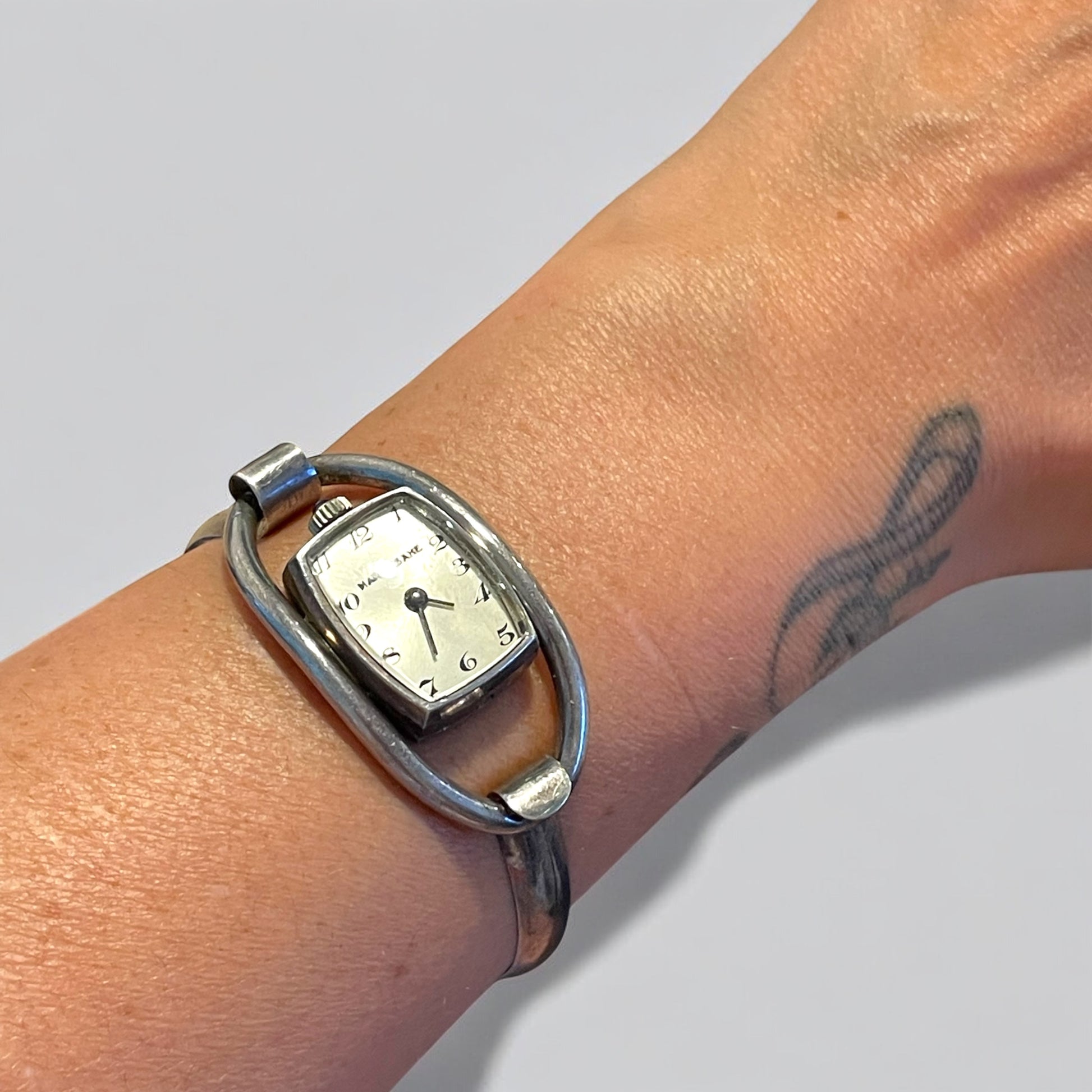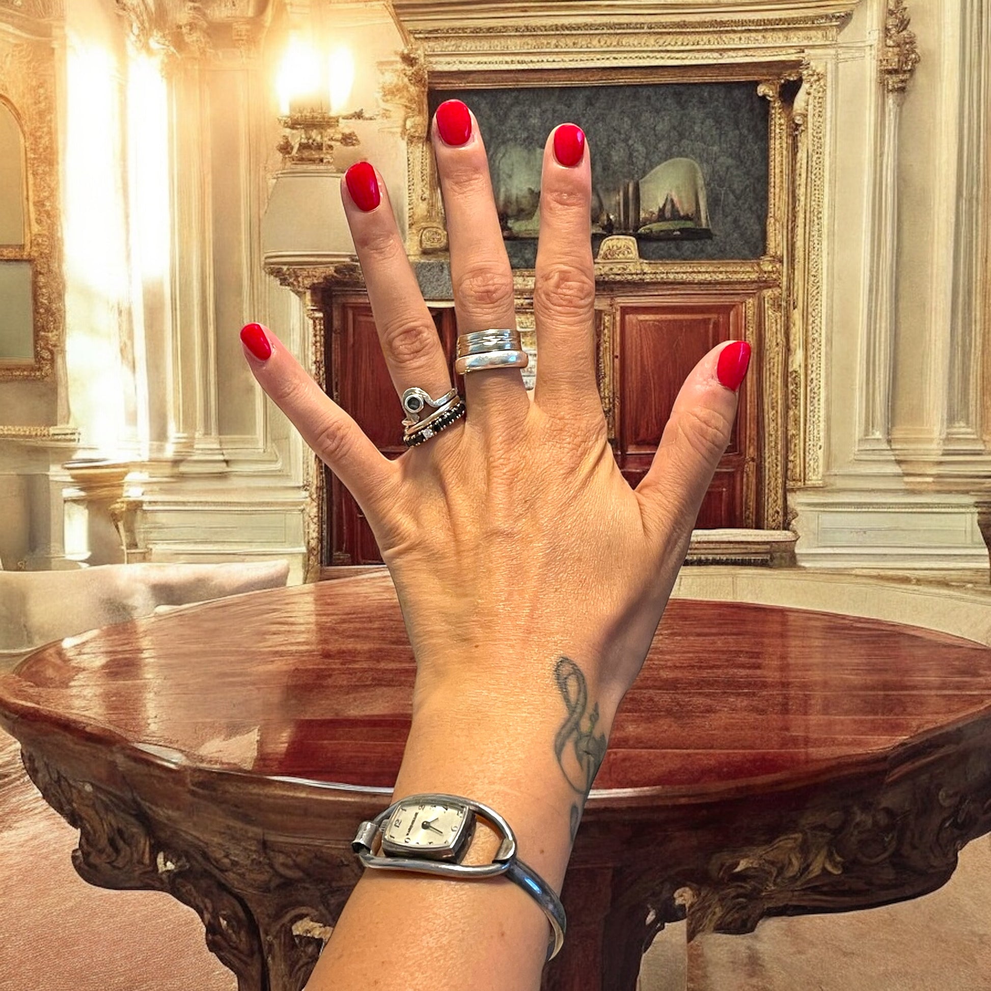 Altro che Swatch, Breil & company. Indossare un orologio da donna, alla fine degli anni Quaranta, non era un gesto comune. Era un’affermazione. Un messaggio silenzioso che diceva: “So badare al mio tempo. So scegliere da me i miei gioielli. So chi sono e non ho bisogno che mi definisca TU”. Sophie l’aveva acquistato con orgoglio, in una piccola gioielleria parigina, scegliendo proprio questo modello rigido, splendente, interamente in argento massiccio, con una cassa estraibile di forma allungata e una corona decorata da una pietra blu cabochon. Un design ispirato a Cartier. Aveva voluto un orologio vero, non un semplice accessorio. Un meccanico a carica manuale, perfettamente funzionante ancora oggi, come a testimoniare che le cose fatte bene, resistono. Che la bellezza vera non ha bisogno di pile. La forma sobria e compatta, il bracciale rigido modellato con cura, l’argento vivo sotto la luce — tutto raccontava una donna che non aveva paura di gestire il proprio tempo, che portava al polso un oggetto nato per gli uomini e lo rendeva proprio. E così questo orologio, ancora oggi, non è solo un segnatempo. È una dichiarazione di valore, un atto di autodeterminazione - peraltro, elegantissimo.