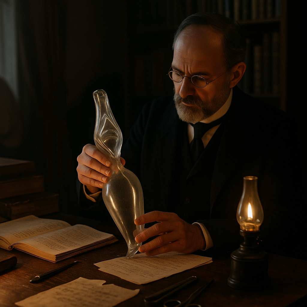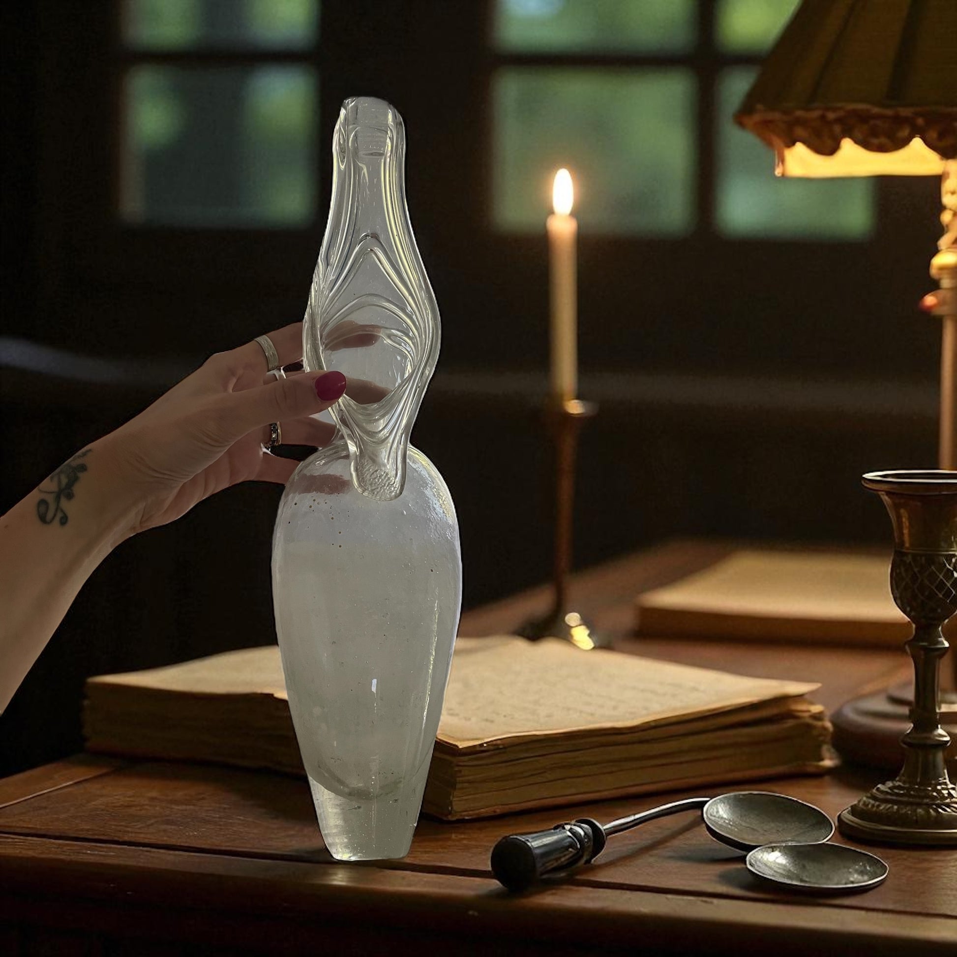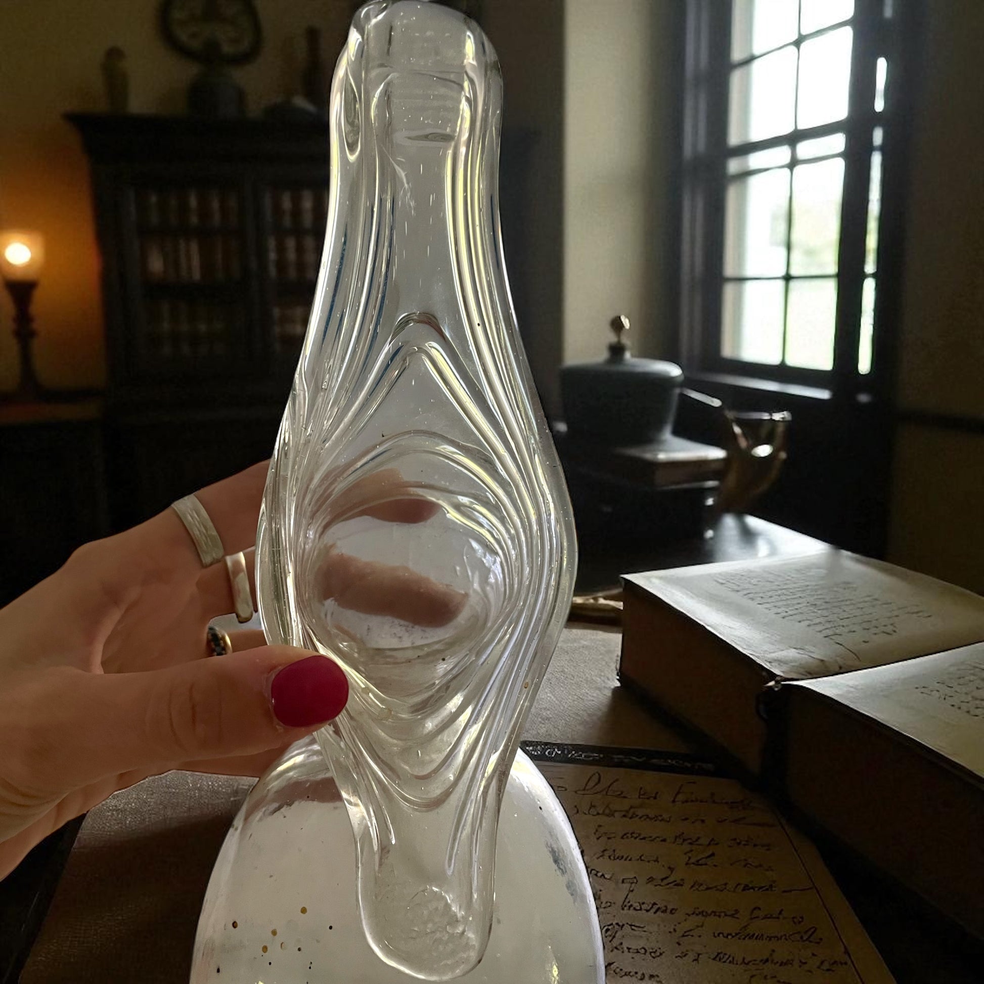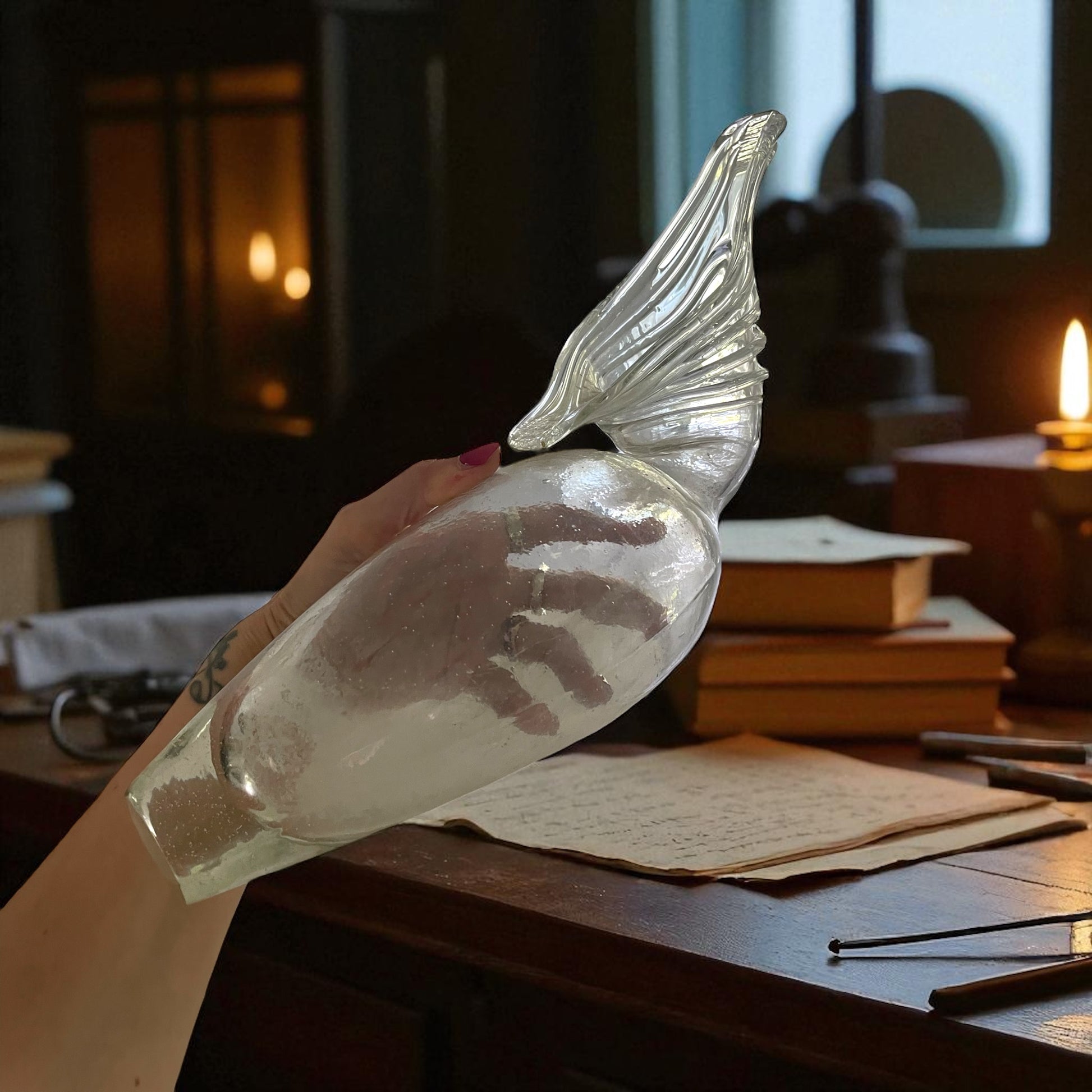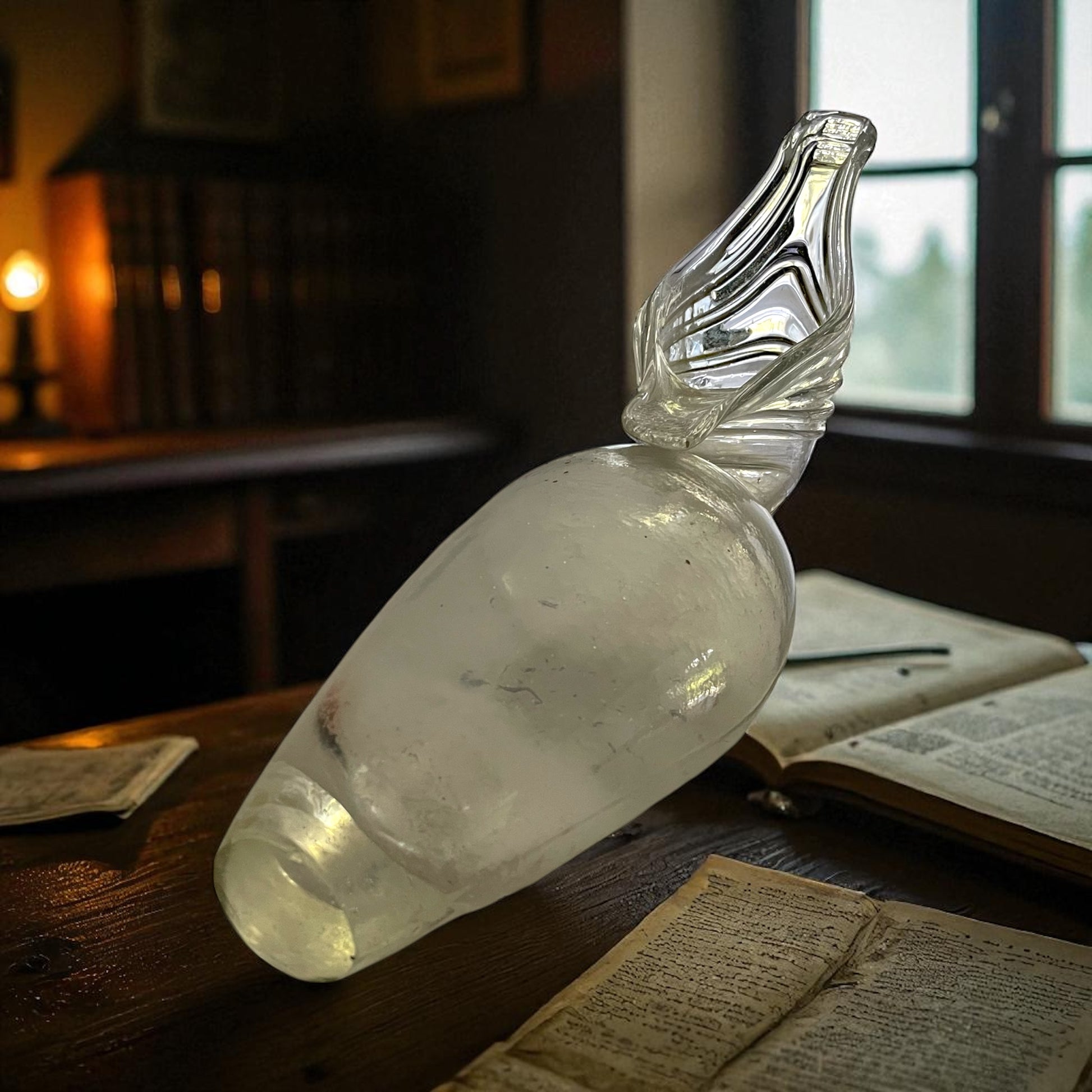 Non è un semplice oggetto, ma un frammento della storia della medicina… quasi dimenticato. Questo è un pappagallo da donna in vetro soffiato, risalente alla fine dell’Ottocento – inizi del Novecento. Strumento di uso intimo e domestico e non solo ospedaliero, serviva per raccogliere i bisogni delle donne allettate o costrette a lunghi periodi di riposo, quando non era possibile spostarsi. Il termine “pappagallo” è più noto per la versione maschile, ma in realtà esisteva anche questa variante femminile, molto più rara, caratterizzata da un’imboccatura svasata e modellata con cura per adattarsi alla conformazione del corpo della donna. In vetro trasparente, spesso con piccole bolle e irregolarità dovute alla soffiatura artigianale, rappresenta oggi una testimonianza preziosa dell’evoluzione dell’igiene e della medicina. Un oggetto fragile, insolito e poco conosciuto, capace di raccontare una parte dimenticata della storia sanitaria e sociale tra Ottocento e Novecento. Perfetto per una collezione museale medicale o Wunderkammer.