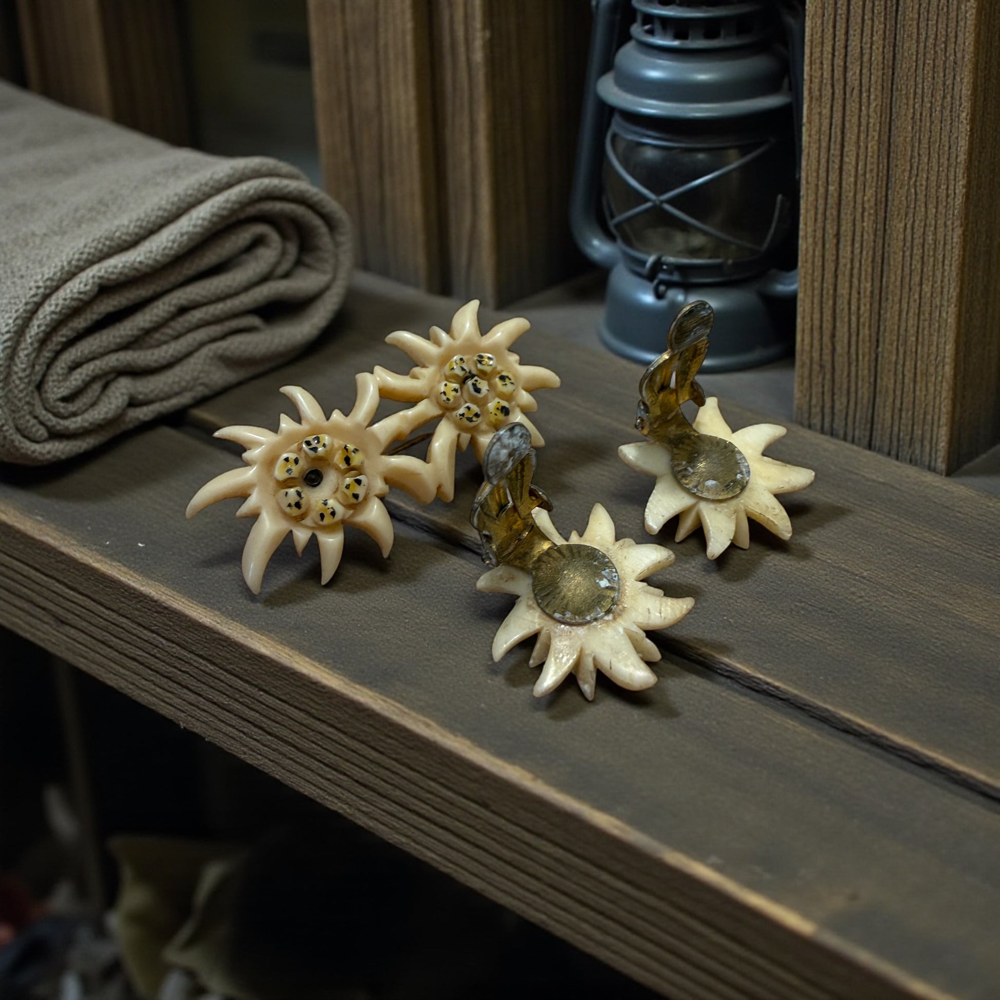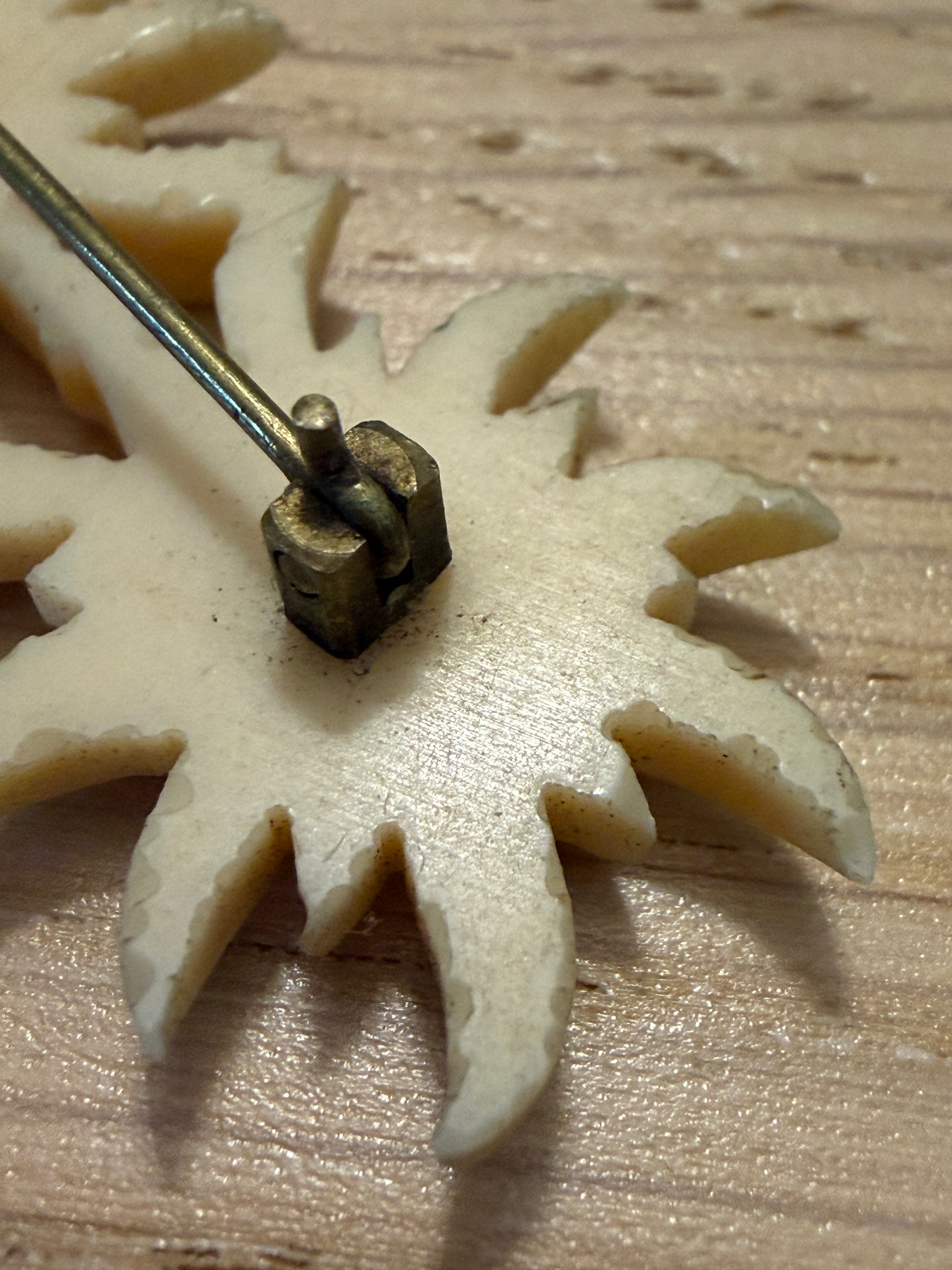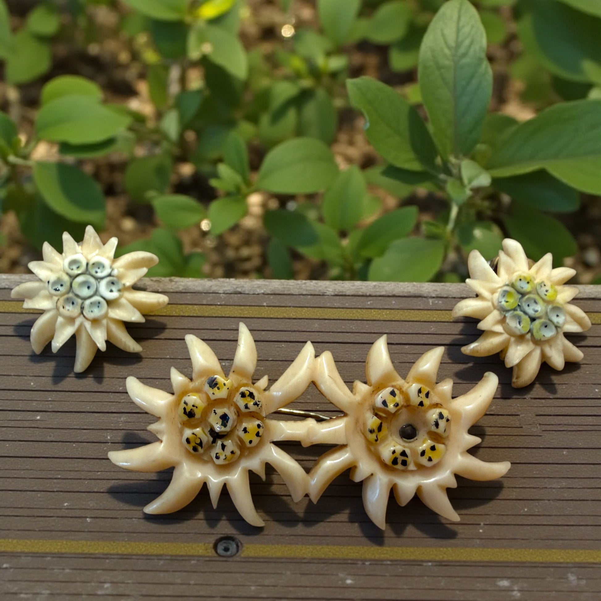 Parure spilla e orecchini clip in galalith stella alpina, 50s