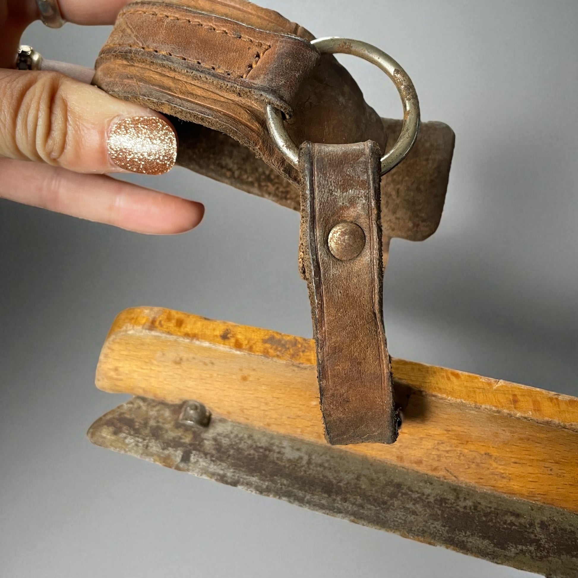 Coppia di pattini da ghiaccio d’epoca, primi decenni del ’900, provenienza olandese. Struttura in legno con lama in ferro e cinghie in cuoio originali. Condizioni molto buone per l’età, con segni del tempo coerenti con l’uso.