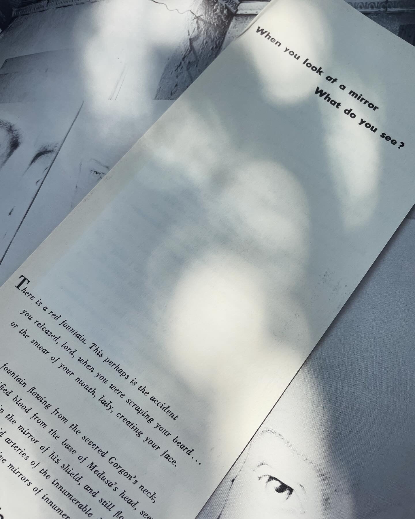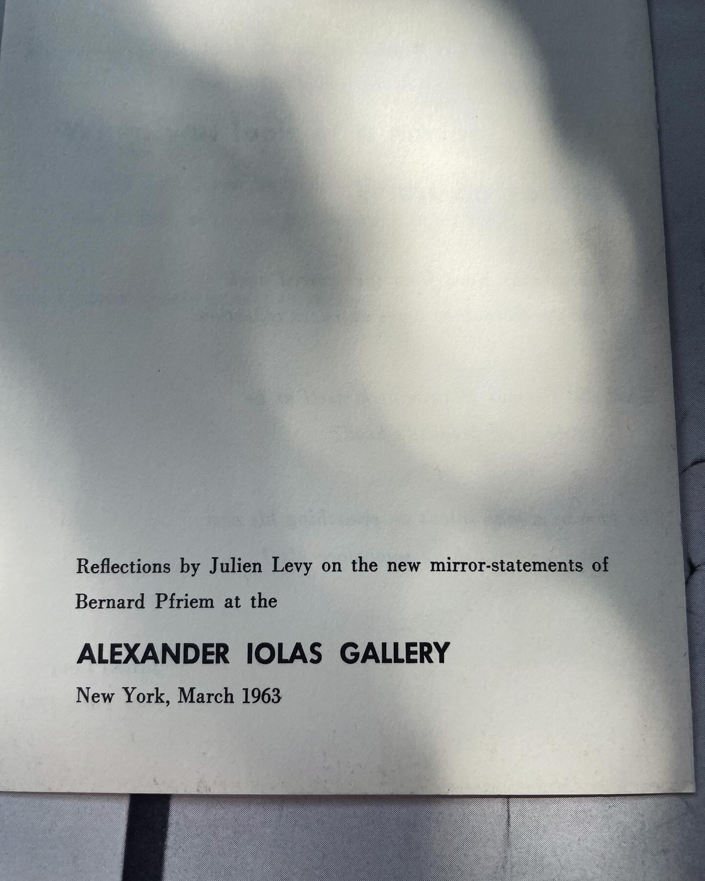 Very rare surrealist publication on the artist Bernard Pfriem with reflections by Julien Levy, the theme of the mirror and the reflection are effectively represented in the pamphlet that, when opened, reveals two mirrors - the left one intact and the right one intentionally cracked. Inside, in addition to the photographs of Hans Namuth, the leaflet "when you look at a mirror what do you see?" - year 1963 Iolas Gallery NY