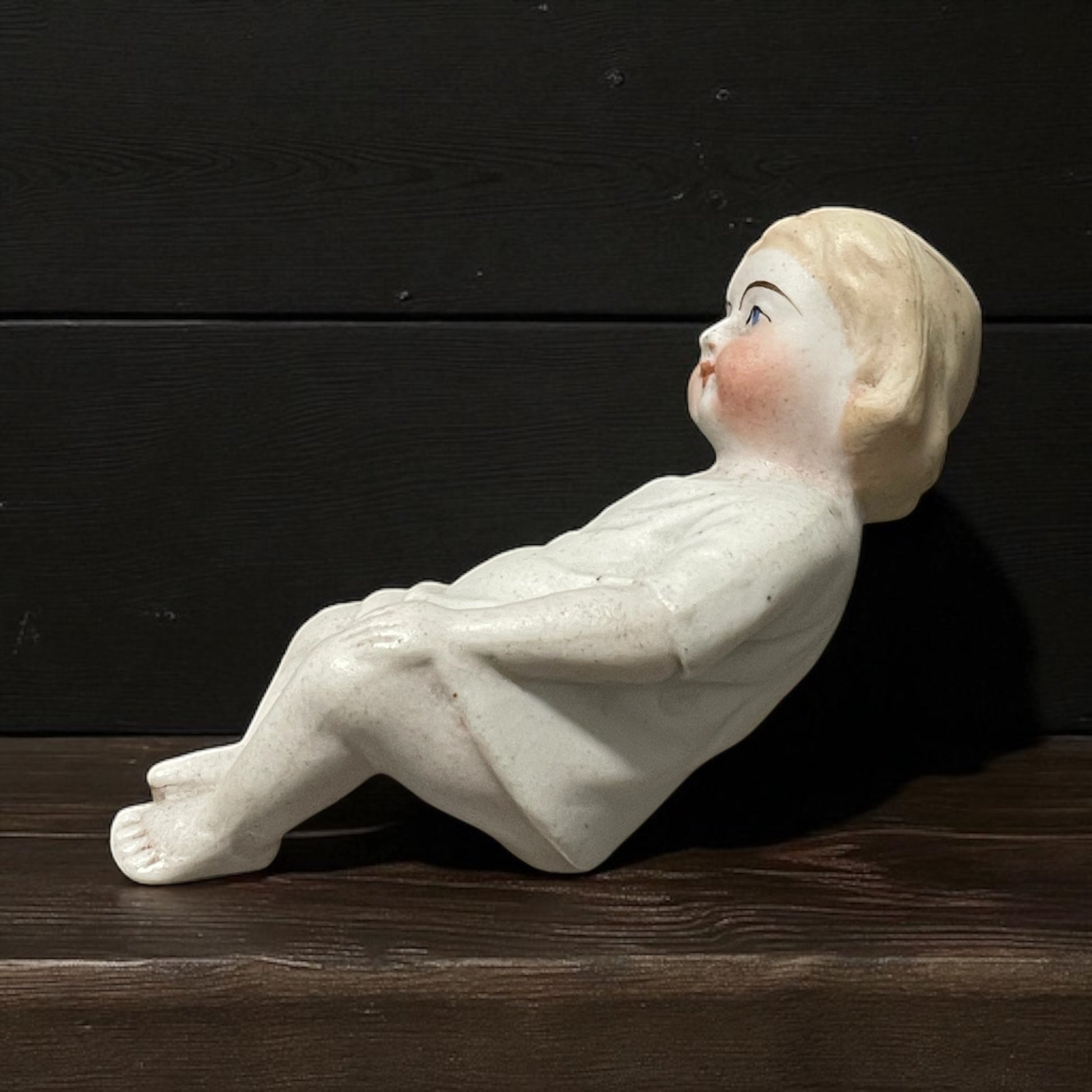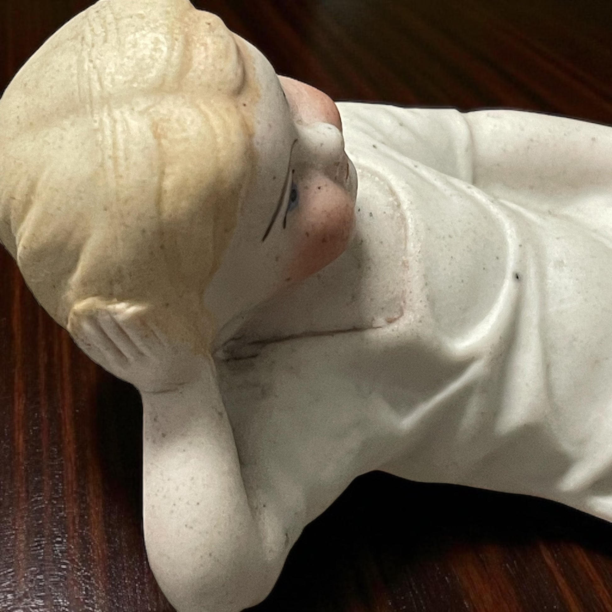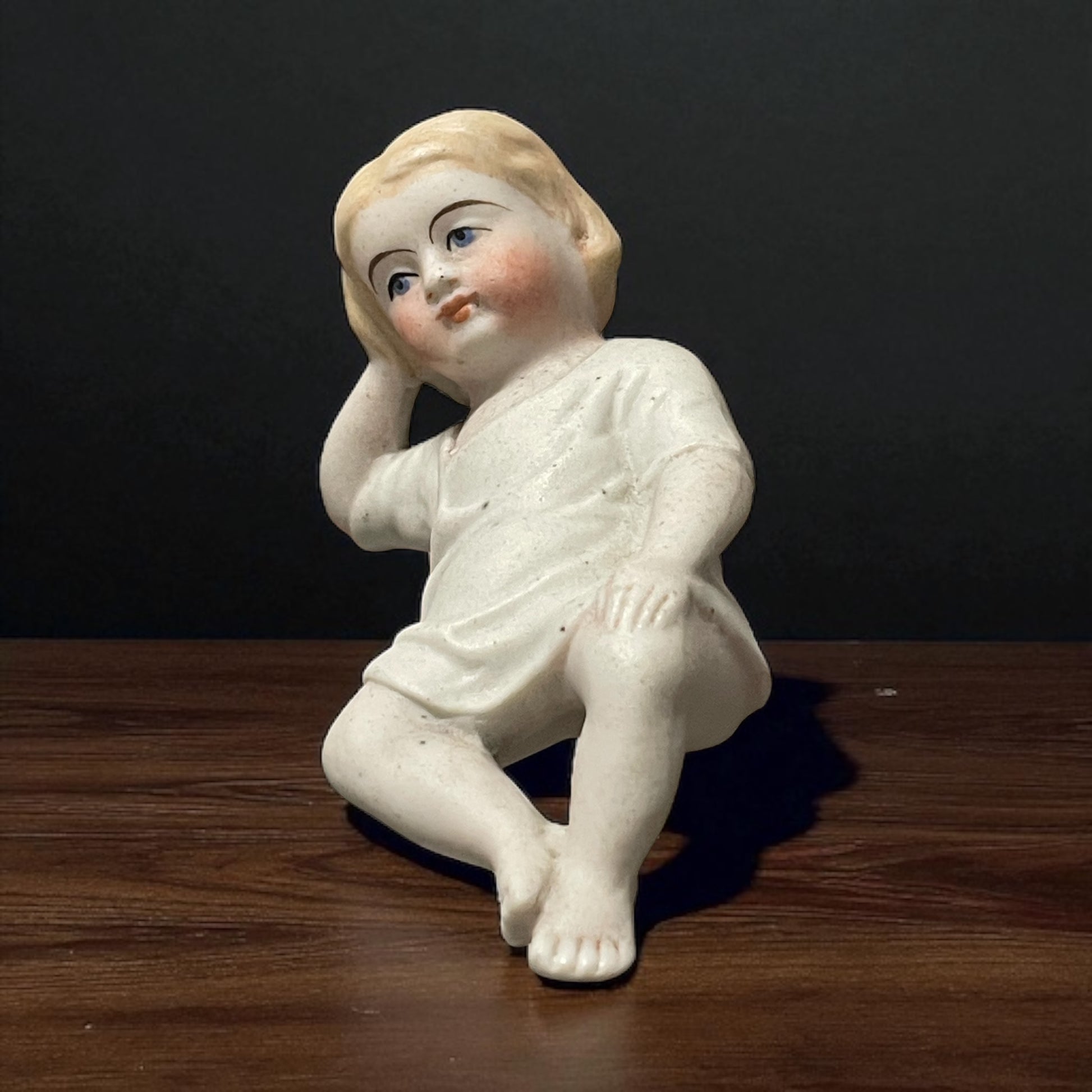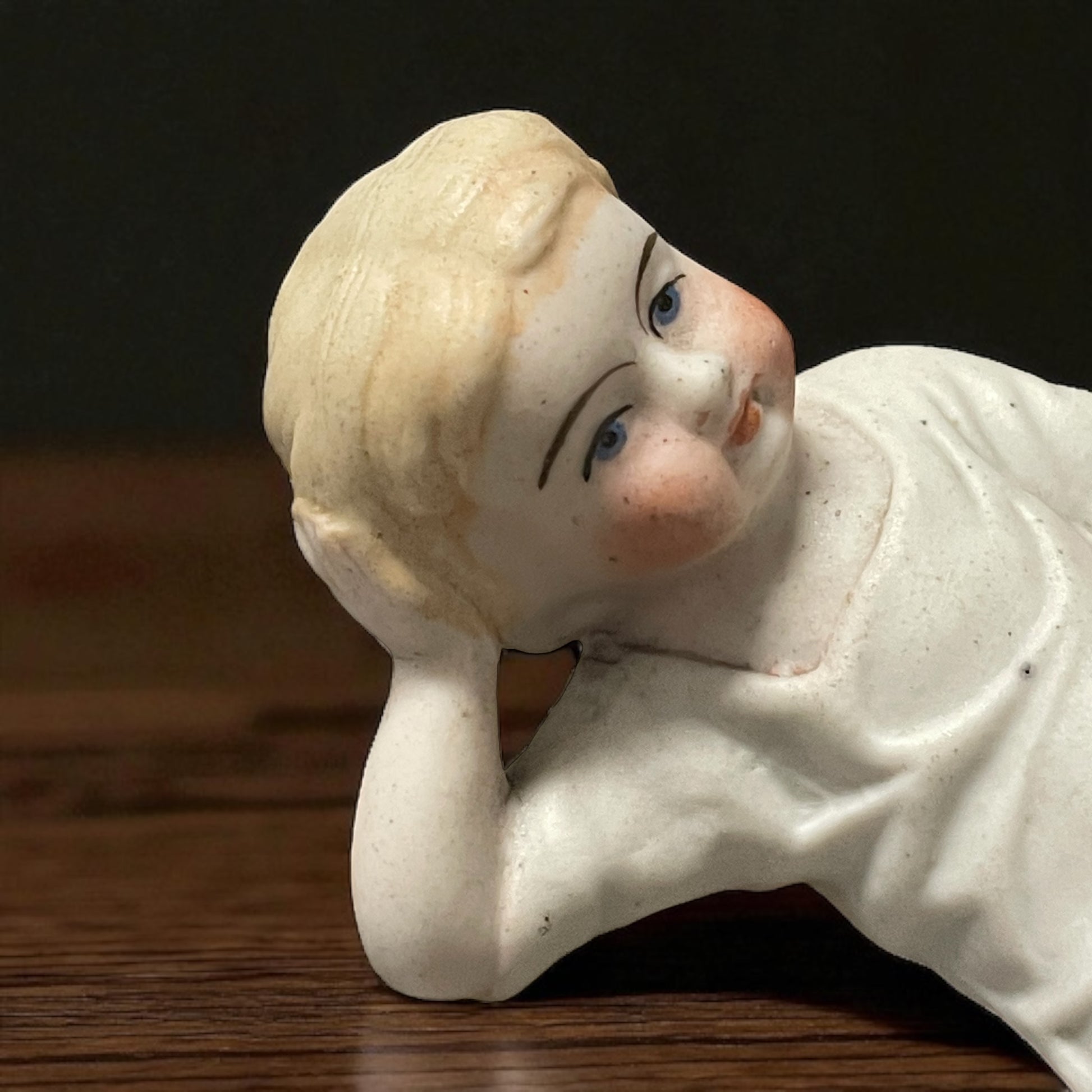 C’è qualcosa di ipnotico nel modo in cui questa bambina in porcellana bisquit si abbandona al suo sogno silenzioso. Con il gomito puntato e la testolina reclinata sul palmo, sembra ascoltare una musica che solo lei sente — una melodia fatta di ricordi, o forse di attese. Il volto, dipinto con mano delicata, è un piccolo capolavoro di serenità: guance lievemente arrossate, occhi d’un azzurro nitido e sguardo assorto. I capelli, raccolti in morbide onde, incorniciano un’espressione pacata, quasi filosofica. L’abitino semplice e le gambette nude raccontano l’intimità domestica dell’infanzia di un tempo che fu, quando si sapeva restare fermi e sognare. Proprio come le sue simili, veniva chiamata “piano baby” — un termine nato per descrivere le graziose figurine che adornavano i pianoforti verticali delle case borghesi di fine Ottocento. Bambini in porcellana, seduti o sdraiati, che sembravano ascoltare le note, o perdervisi dentro. Servivano a decorare, a fermare i teli ricamati posati sui mobili, ma anche a raccontare un’epoca in cui l’arte e la dolcezza si cercavano anche nelle piccole cose. Senza la minima frattura, è sopravvissuta intatta a più di un secolo di vita, come se il tempo l’avesse solo sfiorata. Che sia su una mensola, sul comodino o sopra un vecchio libro, porterà con sé una dolcezza d’altri tempi. E forse, ogni tanto, ti chiederai anche tu: a cosa starà pensando?