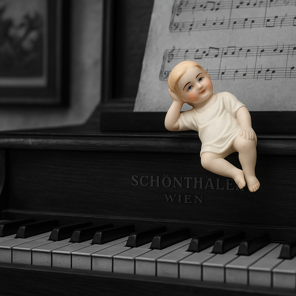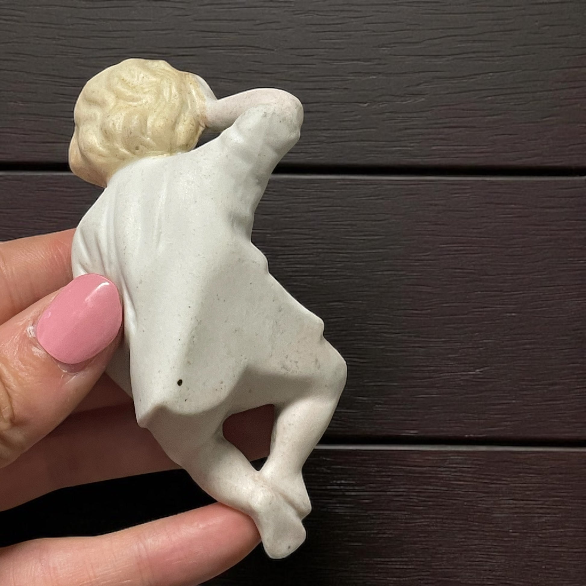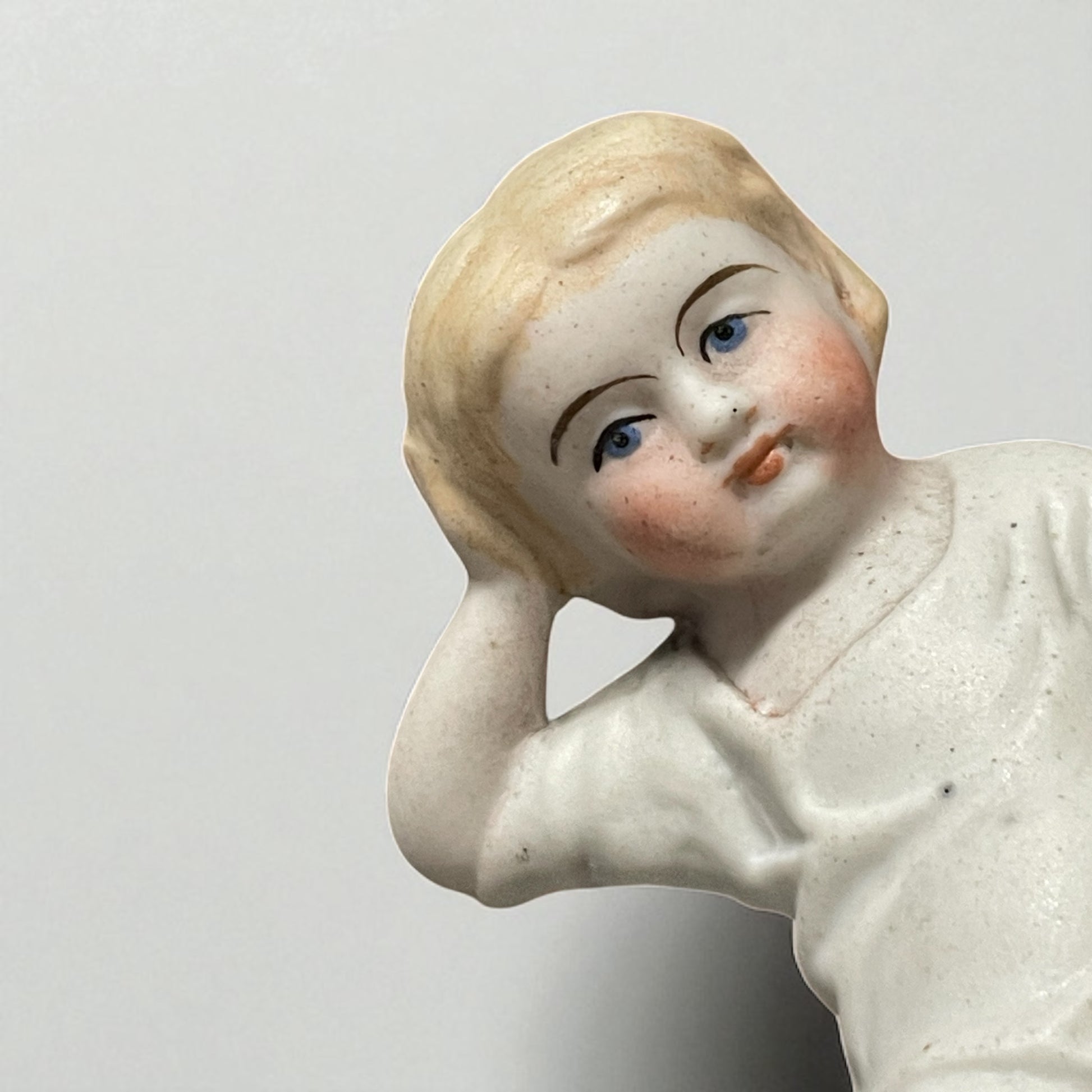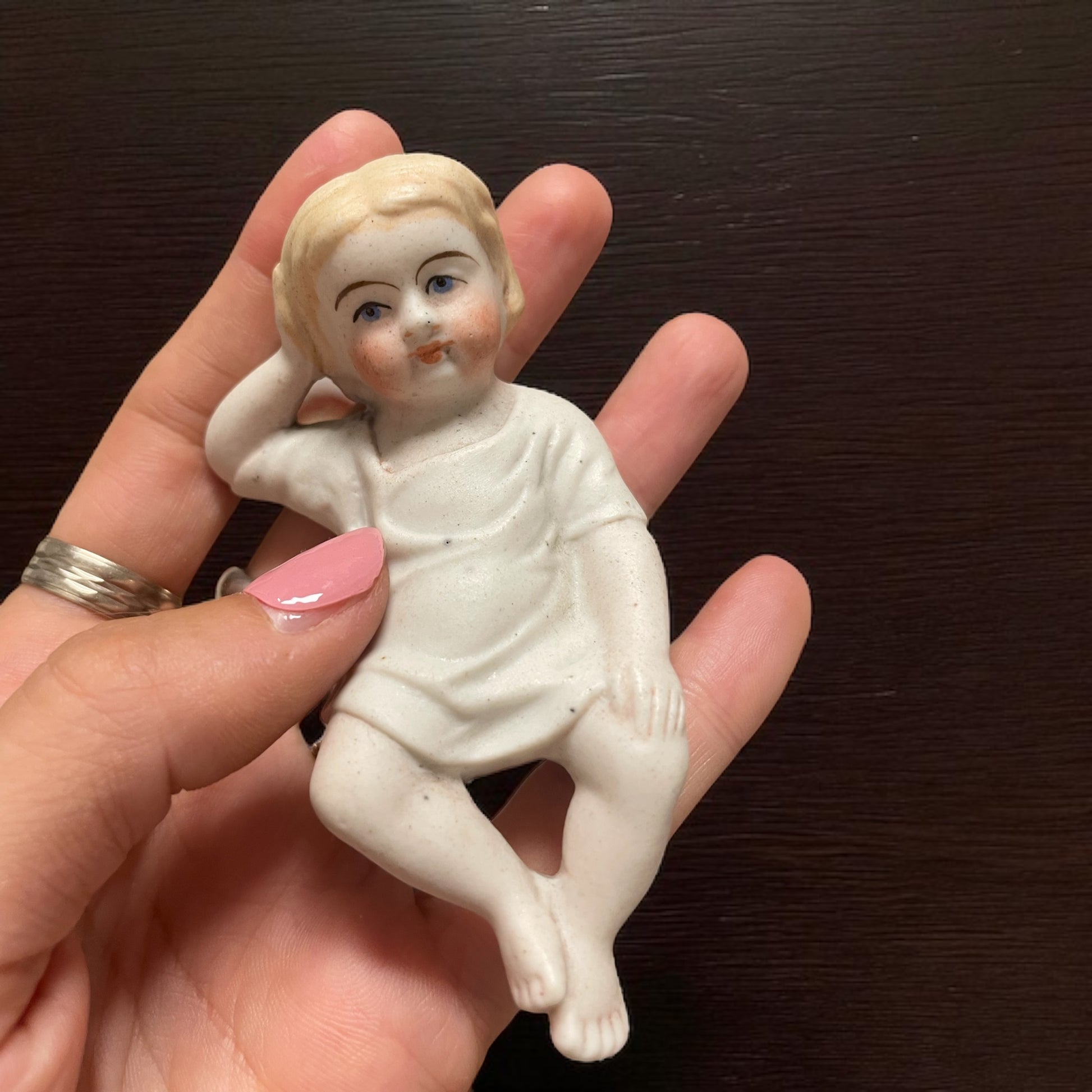 C’è qualcosa di ipnotico nel modo in cui questa bambina in porcellana bisquit si abbandona al suo sogno silenzioso. Con il gomito puntato e la testolina reclinata sul palmo, sembra ascoltare una musica che solo lei sente — una melodia fatta di ricordi, o forse di attese. Il volto, dipinto con mano delicata, è un piccolo capolavoro di serenità: guance lievemente arrossate, occhi d’un azzurro nitido e sguardo assorto. I capelli, raccolti in morbide onde, incorniciano un’espressione pacata, quasi filosofica. L’abitino semplice e le gambette nude raccontano l’intimità domestica dell’infanzia di un tempo che fu, quando si sapeva restare fermi e sognare. Proprio come le sue simili, veniva chiamata “piano baby” — un termine nato per descrivere le graziose figurine che adornavano i pianoforti verticali delle case borghesi di fine Ottocento. Bambini in porcellana, seduti o sdraiati, che sembravano ascoltare le note, o perdervisi dentro. Servivano a decorare, a fermare i teli ricamati posati sui mobili, ma anche a raccontare un’epoca in cui l’arte e la dolcezza si cercavano anche nelle piccole cose. Senza la minima frattura, è sopravvissuta intatta a più di un secolo di vita, come se il tempo l’avesse solo sfiorata. Che sia su una mensola, sul comodino o sopra un vecchio libro, porterà con sé una dolcezza d’altri tempi. E forse, ogni tanto, ti chiederai anche tu: a cosa starà pensando?