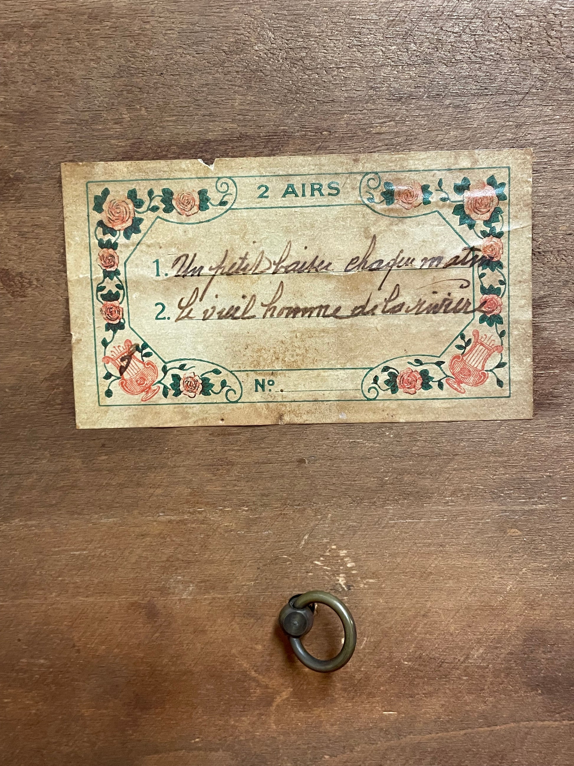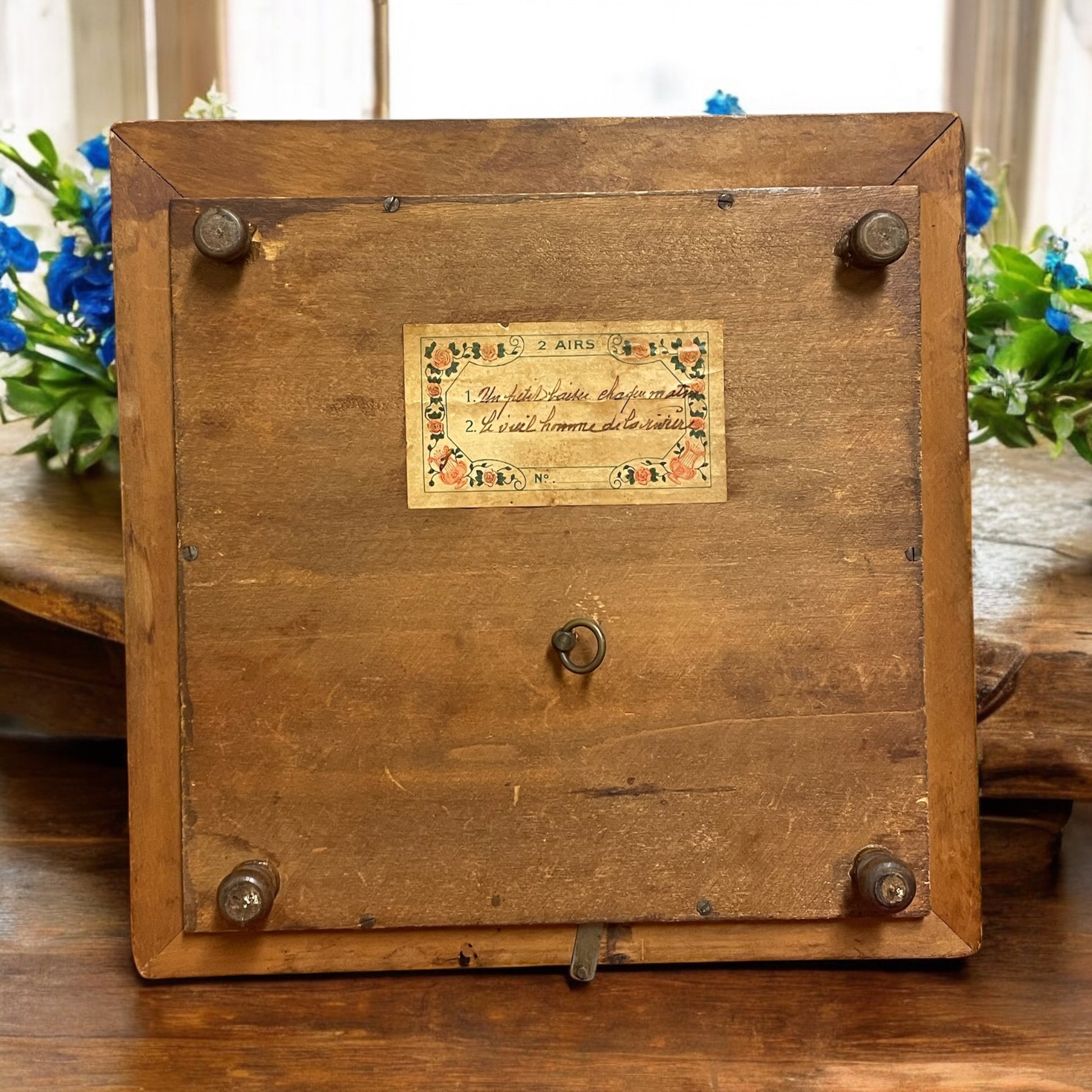 Ritrovato come un frammento intatto di un tempo sospeso, questo piatto a carillon sembra essere emerso da un salotto sigillato negli anni Venti, dove il profumo di cipria e cera per mobili si mescolava al suono delle melodie di un’epoca che non conosceva la fretta. La cornice in legno intagliato, impreziosita da motivi geometrici che riflettono l’audacia dell’Art Déco, custodisce con grazia un decoro di smalti pastello che racconta di una bellezza pensata per durare. Sul retro, un’etichetta consunta, ornata da rose e caratteri eleganti, svela i segreti delle sue due melodie, “Un petit baiser chaque matin” e “Le vieil homme de la rivière”, arie che un tempo riempivano l’aria di leggerezza e malinconia. Chiudi gli occhi e immagina: un salotto borghese degli anni ’20, tendaggi pesanti che filtrano la luce del pomeriggio, una poltrona accanto al grammofono e mani delicate che caricano il carillon per ascoltare le sue note. Forse quelle stesse mani che lo hanno poi riposto con cura, sigillando con esso un’epoca intera, dimenticata ma non perduta. Questo oggetto è una reliquia d’intimità, un frammento di memoria che ha attraversato il tempo per raccontarci la storia di chi lo ha amato. Un pezzo unico che, come un custode silenzioso, attende il momento di risvegliare ancora la musica del passato. Oggi suona solo un’aria delle due, molto bene, ed è in ottime condizioni. Ogni lato misura cm 28.