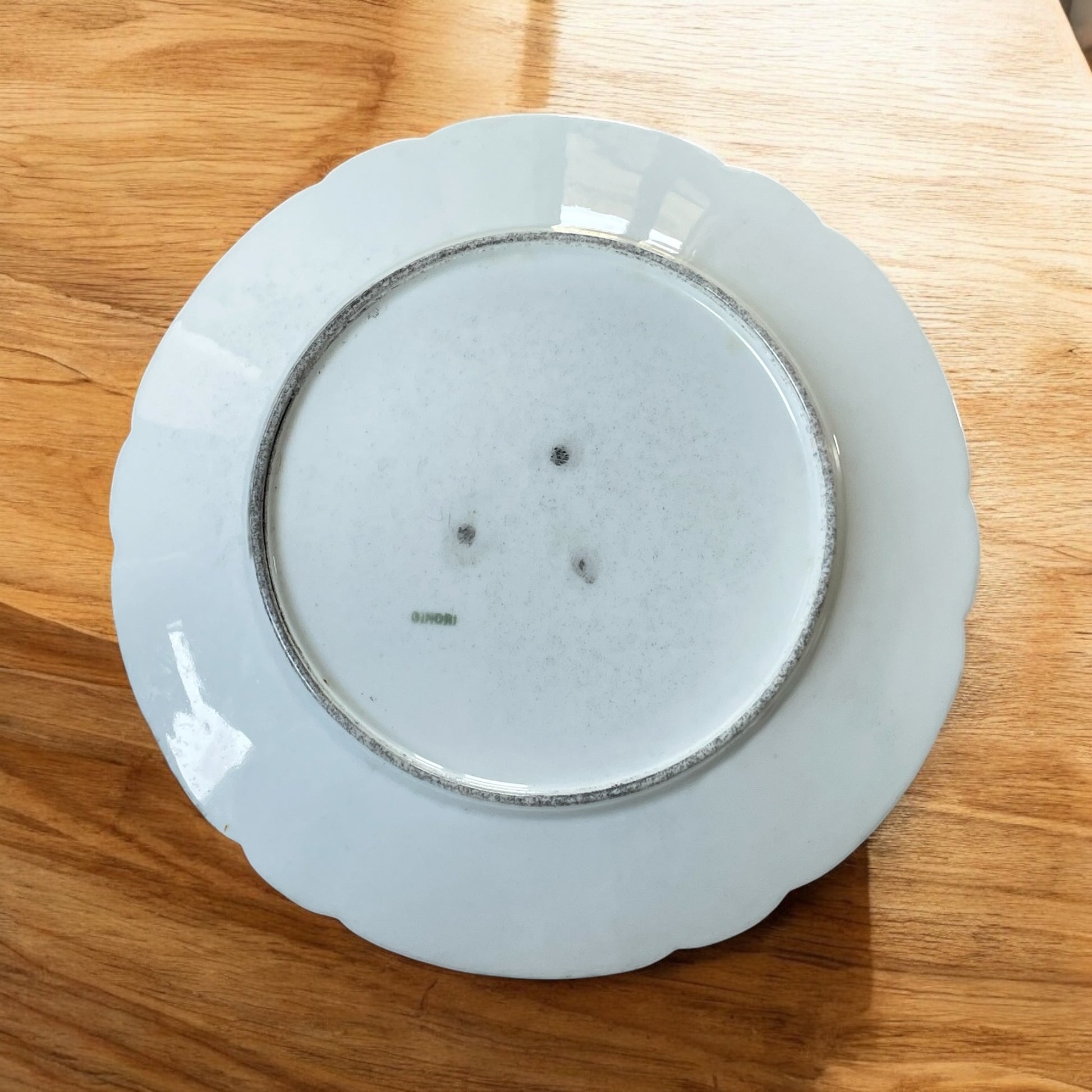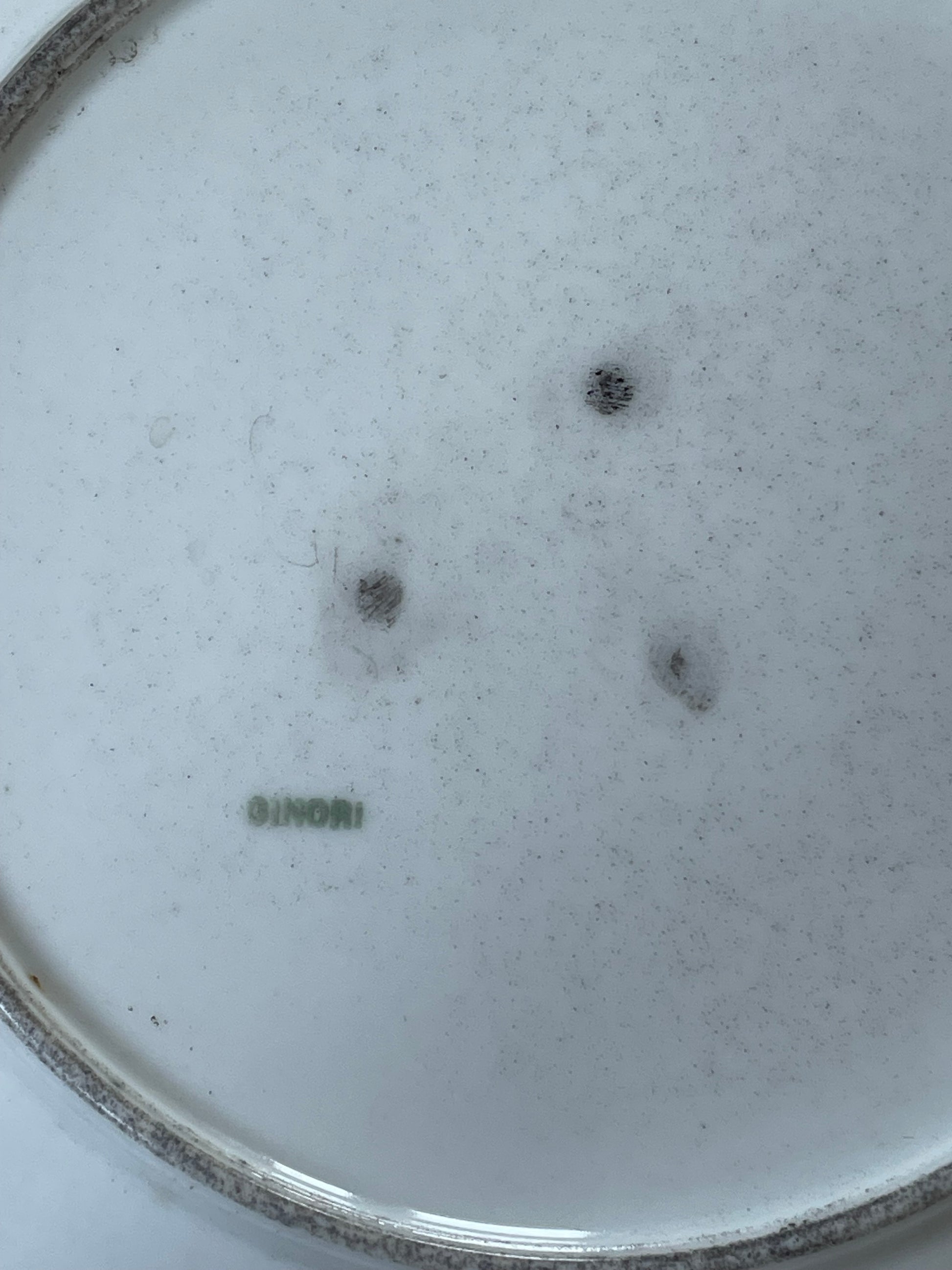 Un piatto elegante e prezioso, realizzato dalla celebre manifattura Ginori prima del 1896, come attestato dalla firma semplice “GINORI” in verde presente sul retro, caratteristica delle produzioni anteriori alla fusione con Richard. Il decoro, interamente dipinto a mano, è un omaggio alla grazia della natura: uccellini dai colori vividi si posano tra rami fioriti, con una delicatezza che rievoca il gusto ottocentesco per il naturalismo e la poesia del quotidiano. I dettagli minuziosi delle piume e dei fiori raccontano la mano esperta di un decoratore attento, capace di trasformare ogni pezzo in un piccolo capolavoro. Il piatto presenta un raffinato bordo mistilineo leggermente modanato, arricchito da un filetto dorato ancora visibile, sebbene lievemente consumato dal tempo, come è naturale in oggetti di questa epoca. Condizioni ottime: il piatto è integro, senza crepe né sbeccature. Le decorazioni sono perfettamente conservate, fresche nei colori e nella definizione. Solo la doratura del bordo mostra una leggera usura, coerente con l’età del pezzo. Un oggetto di grande fascino e valore collezionistico, perfetto per arricchire una tavola d’epoca o per essere esposto come testimonianza autentica della migliore tradizione ceramica italiana. Diametro cm 24.