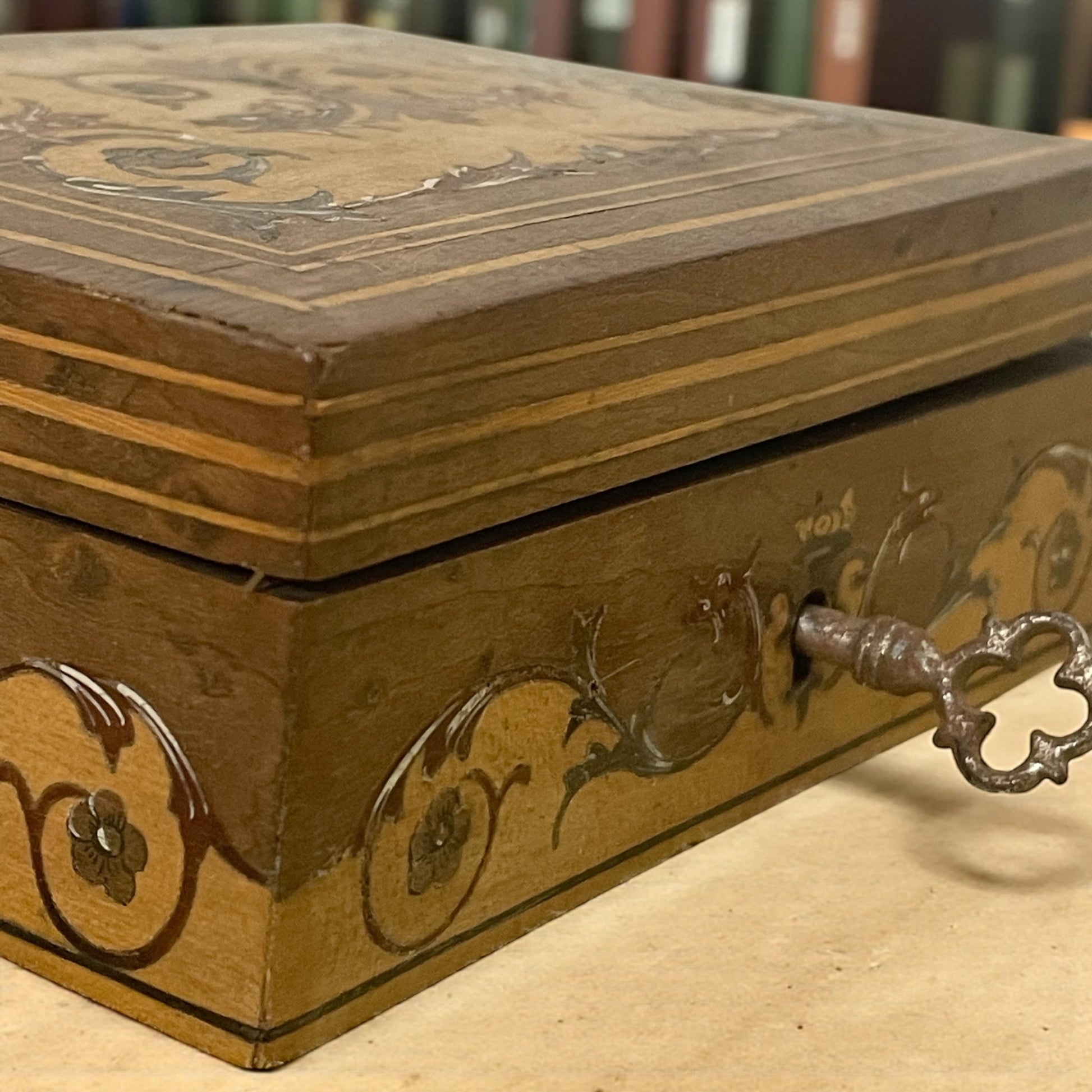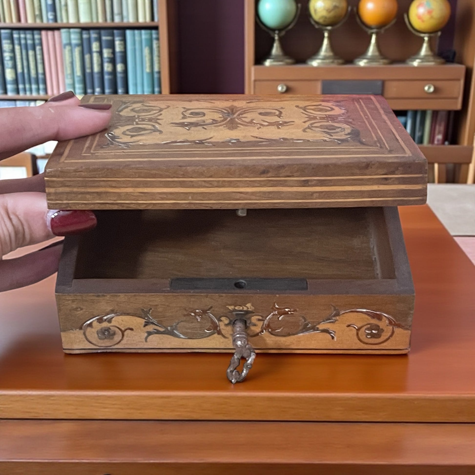 Un piccolo scrigno che racchiude l’eleganza dell’artigianato italiano di fine Ottocento. Realizzata in legno con intarsi floreali in altre fragranze e volute neorinascimentali, questa scatolina porta con sé la maestria delle botteghe di Firenze e Torino, come testimonia l’etichetta originale “P. Botto” ancora visibile sul fondo. Misura 12 x 10 cm, chiave originale presente ma serratura non funzionante (lieve disallineamento alla chiusura che lascia leggeremente sollevato il coperchio a dx). Un tempo fu pensata per custodire gioielli preziosi o ricordi, conserva qualche segno del tempo ma continua a raccontare storie di segreti accuratamente protetti.
