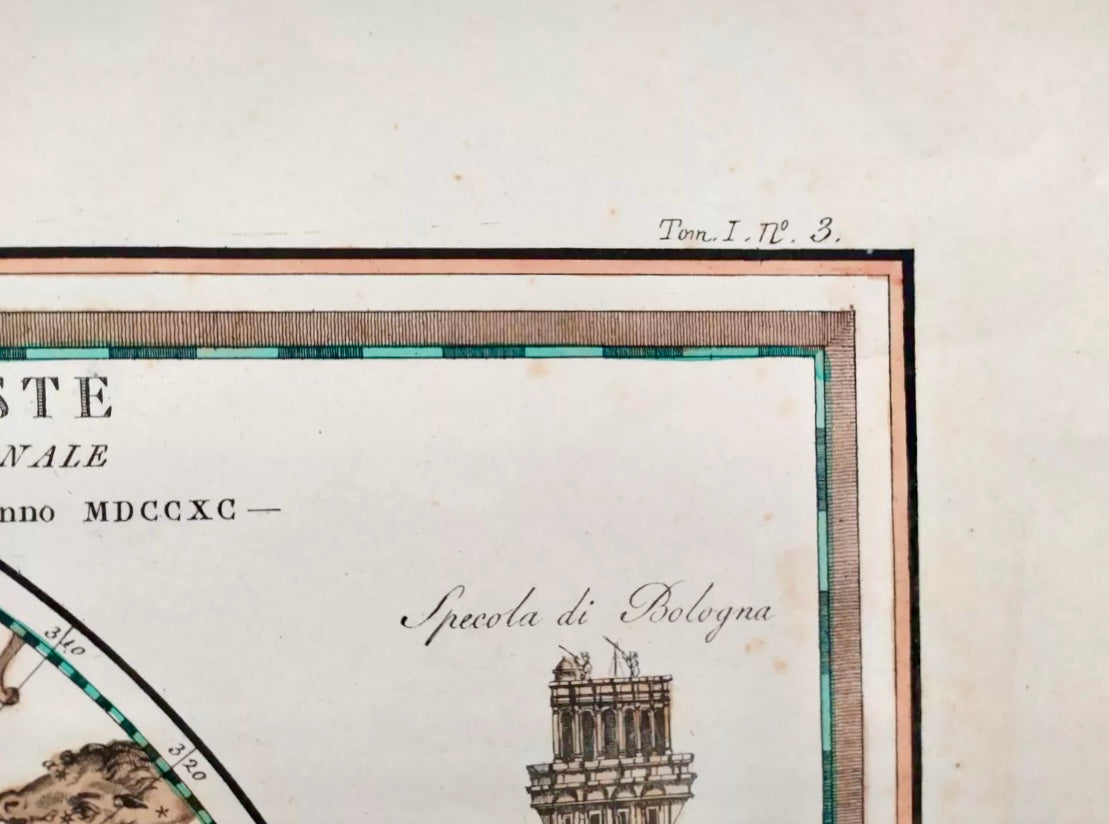 Planisfero Celeste Settentrionale – Giovanni Maria Cassini (Calcografia Camerale, Roma). Raffinata stampa calcografica acquerellata a mano, tratta dalle celebri lastre incise da Giovanni Maria Cassini (1745–1824), cartografo e incisore attivo a Roma tra XVIII e XIX secolo. L’opera, intitolata Planisfero Celeste Settentrionale, reca la data 1790 - anno di incisione delle matrici, e venne pubblicata dalla prestigiosa Calcografia Camerale di Roma. Le tavole furono ristampate per tutto l’Ottocento, sempre a partire dalle lastre originali, e colorate a mano secondo la tradizione dell’epoca. La mappa rappresenta il cielo boreale con le principali costellazioni zodiacali e figure mitologiche, arricchite da una resa artistica di grande impatto visivo. Ai lati compaiono le vedute di celebri osservatori astronomici italiani, tra cui la Specola del Collegio Romano, la Specola di Bologna e quella di Padova, testimonianza del fervore scientifico del tempo.