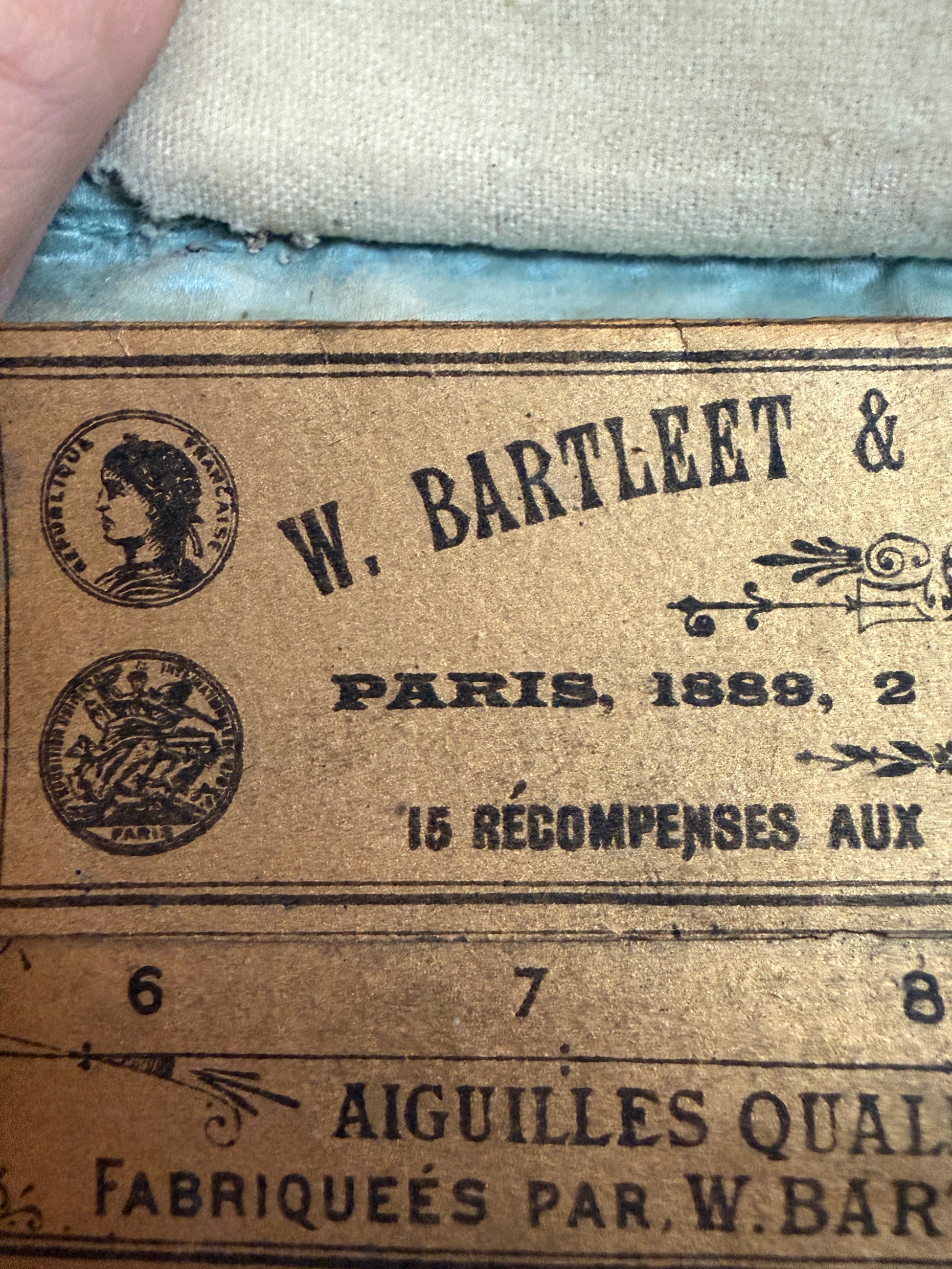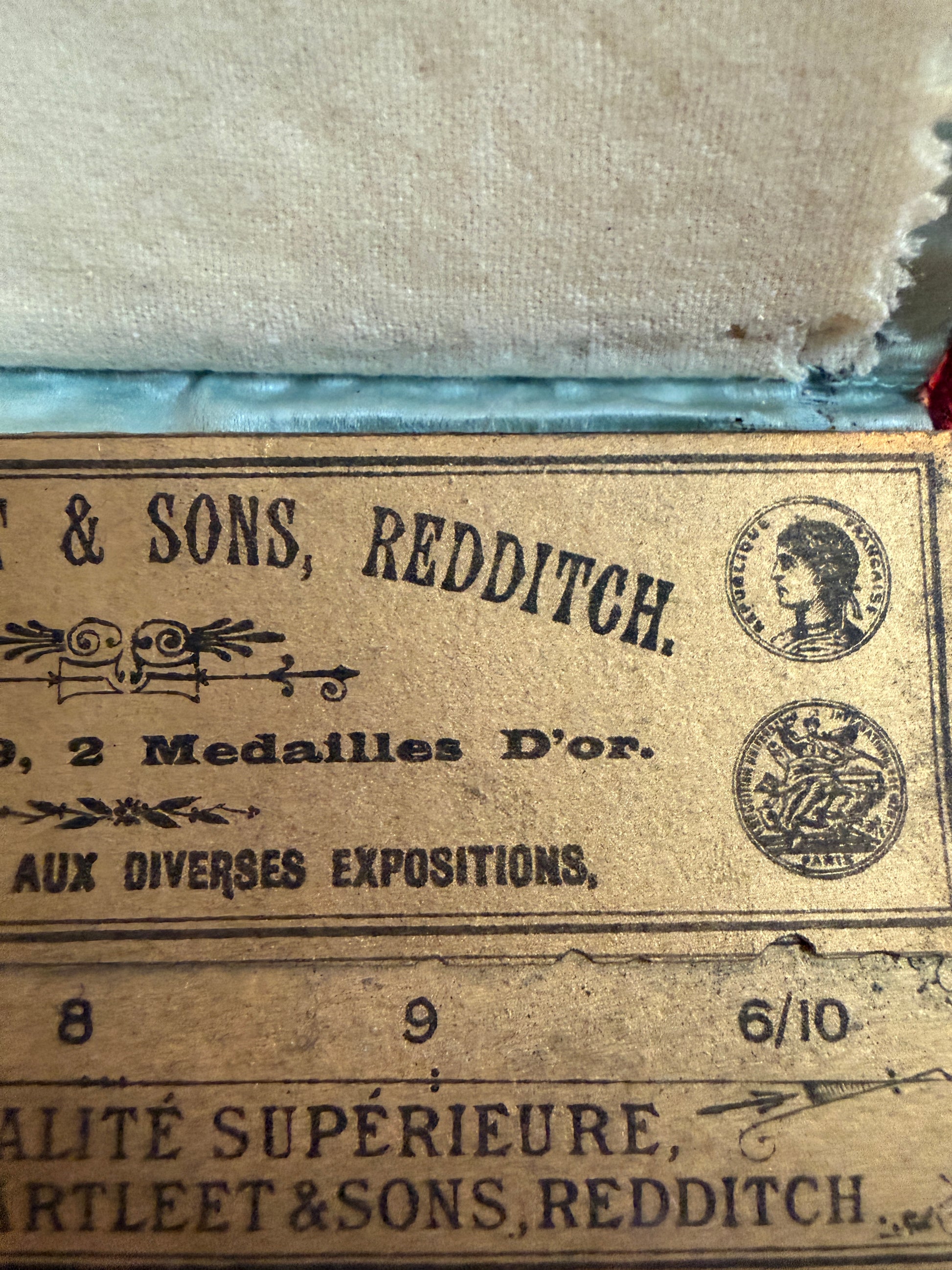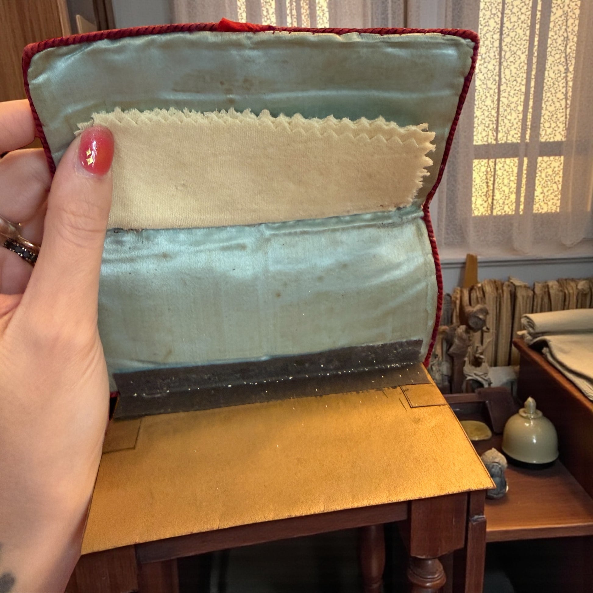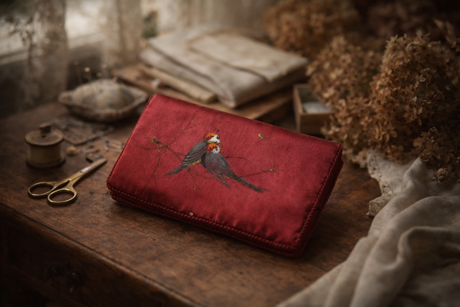 A volte il vero lusso non era l’oro, ma il tempo. Il tempo di scegliere aghi perfetti, di custodirli in seta, di aprire un piccolo libro rosso prima di cucire. Questo astuccio per aghi nasce tra la fine dell’Ottocento e i primi anni del Novecento e accompagna la produzione di W. Bartlett & Sons di Redditch, la città inglese che per decenni fu il cuore mondiale dell’industria degli aghi. Una manifattura così importante da essere premiata all’Esposizione Universale di Parigi del 1889, come orgogliosamente dichiarato sulla carta originale ancora presente all’interno. Ma ciò che rende questo oggetto speciale non è solo l’industria che rappresenta. È il modo in cui quella precisione industriale viene avvolta in un gesto intimo e domestico. L’astuccio è interamente rivestito in seta naturale dipinta a mano, con una coppia di uccelli posati su un ramo, su fondo rosso profondo. Non una stampa, ma una pittura viva, con piccole variazioni di colore e pennellata, come accade solo quando la mano guida il segno. All’interno, la seta moiré azzurra crea un delicato gioco d’acqua e luce, mentre i panni in cotone morbidissimo proteggono gli aghi dal tempo e dall’ossidazione. Si apre come un libro, e non è un caso: perché questo non è un semplice contenitore, ma un oggetto da aprire con lentezza, da usare in silenzio, da richiudere con cura.