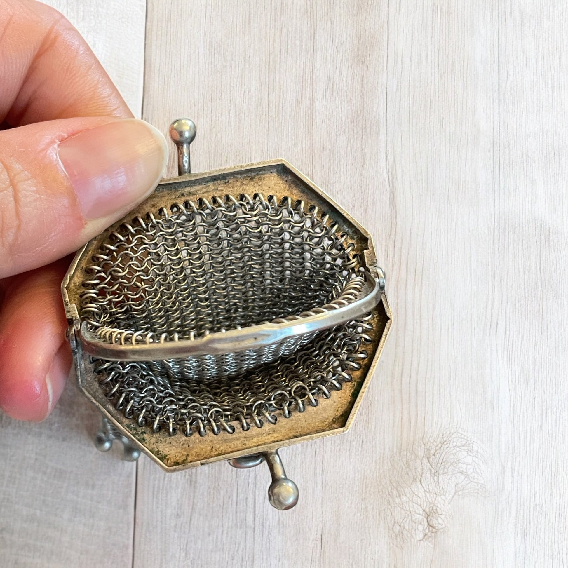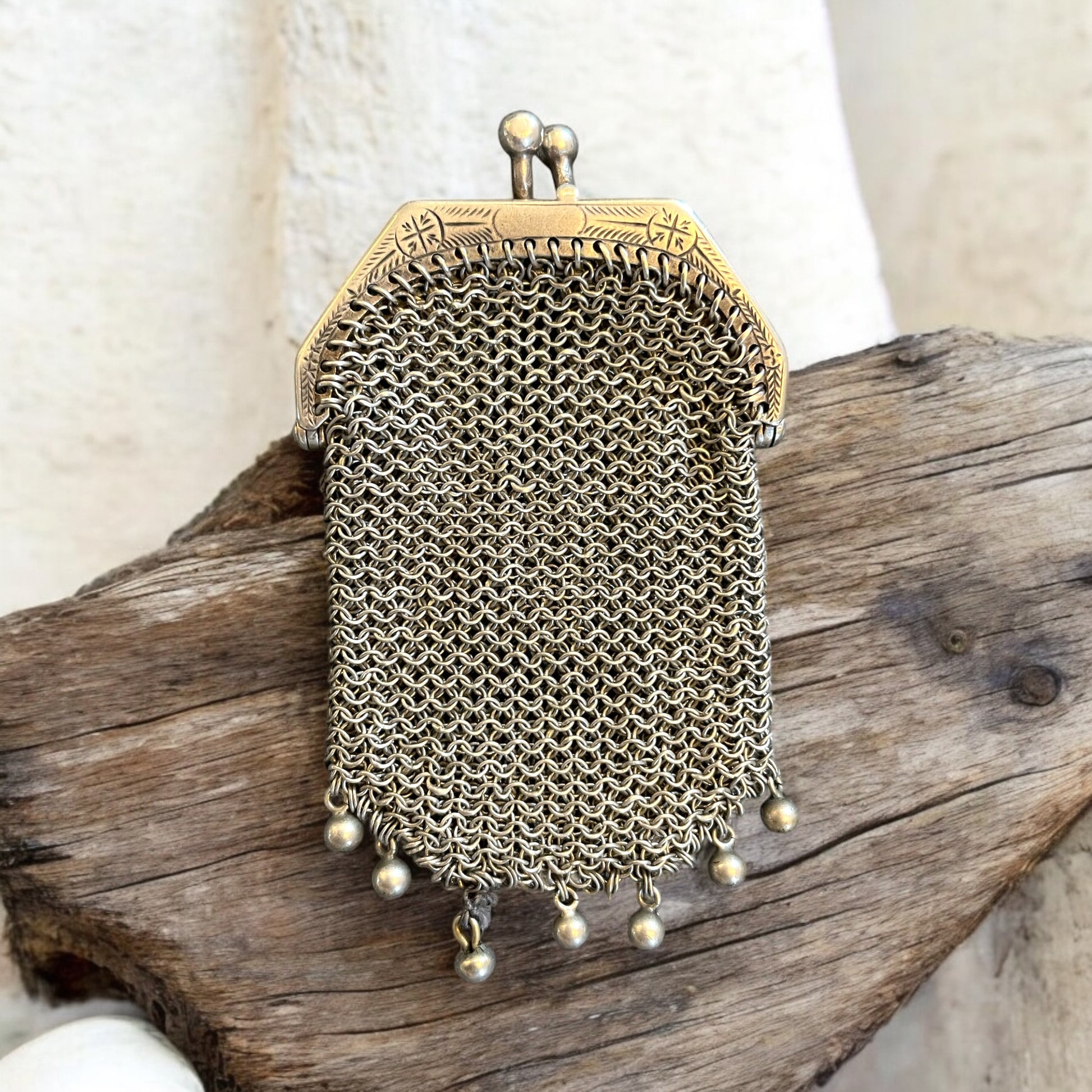 Sembrava tessuta con fili d’argento e pazienza… C’è qualcosa di straordinariamente sensoriale in questo portamonete antico: non appena le dita sfiorano la sua superficie, la mente inganna i sensi. Non sembra metallo, ma stoffa. Un tessuto fluido, cangiante, fatto di minuscoli anelli intrecciati con una precisione che oggi si fa fatica anche solo a immaginare. Si chiama maglia a catena o chainmail, e in questa versione così fitta e flessuosa evoca quasi la carezza della seta. Realizzato interamente in argento, punzonato sulla chiusura e testato per la maglia, questo piccolo capolavoro di artigianato risale con ogni probabilità agli ultimi decenni dell’Ottocento. La montatura cesellata presenta motivi incisi con cura, e custodisce una doppia apertura interna, pensata per dividere le monete o i piccoli oggetti di uso quotidiano. Un anello nella parte superiore lascia intuire che fosse destinato a essere appeso a una chatelaine, quel vezzo tanto raffinato che adornava le cinture delle dame vittoriane. Appeso al fianco, oscillava leggermente a ogni passo, con le sue piccole sfere pendenti che sembrano quasi campanellini silenziosi. Le condizioni sono quasi perfette: manca una piccola sferetta finale ma non si nota. Un vero gioiello molto ricercato.