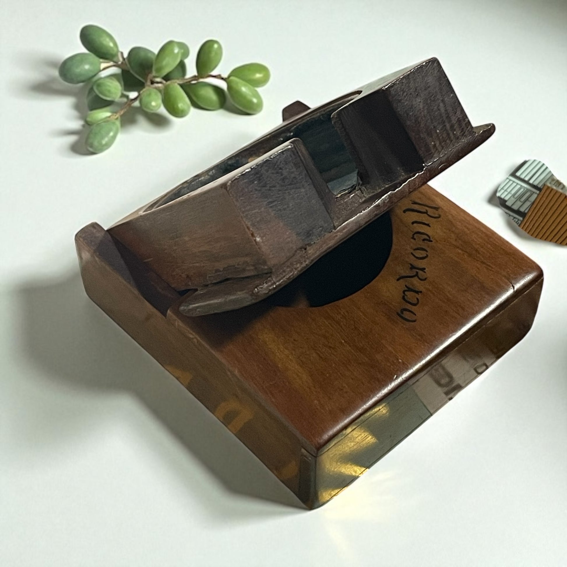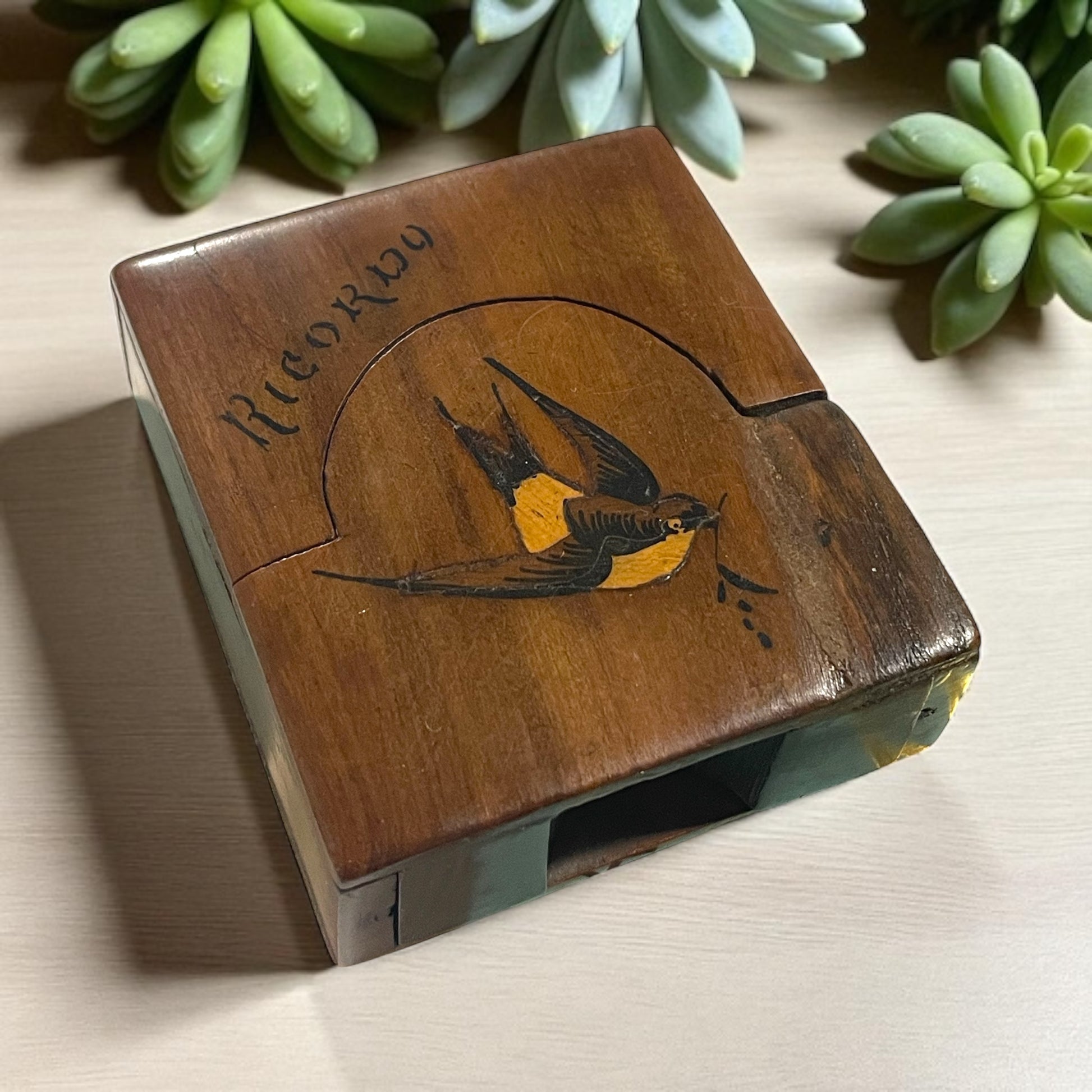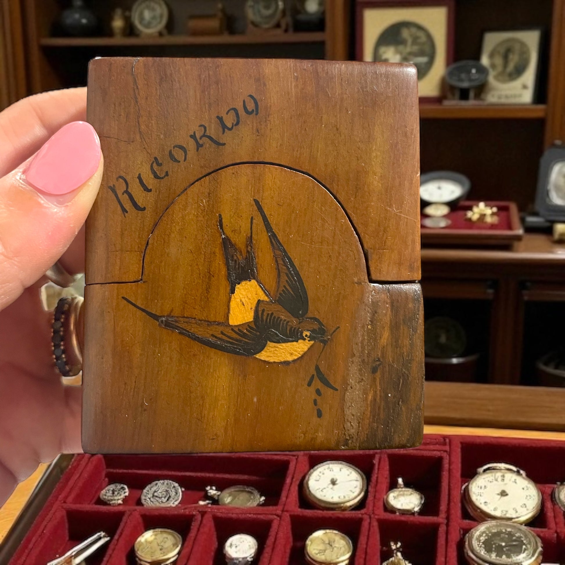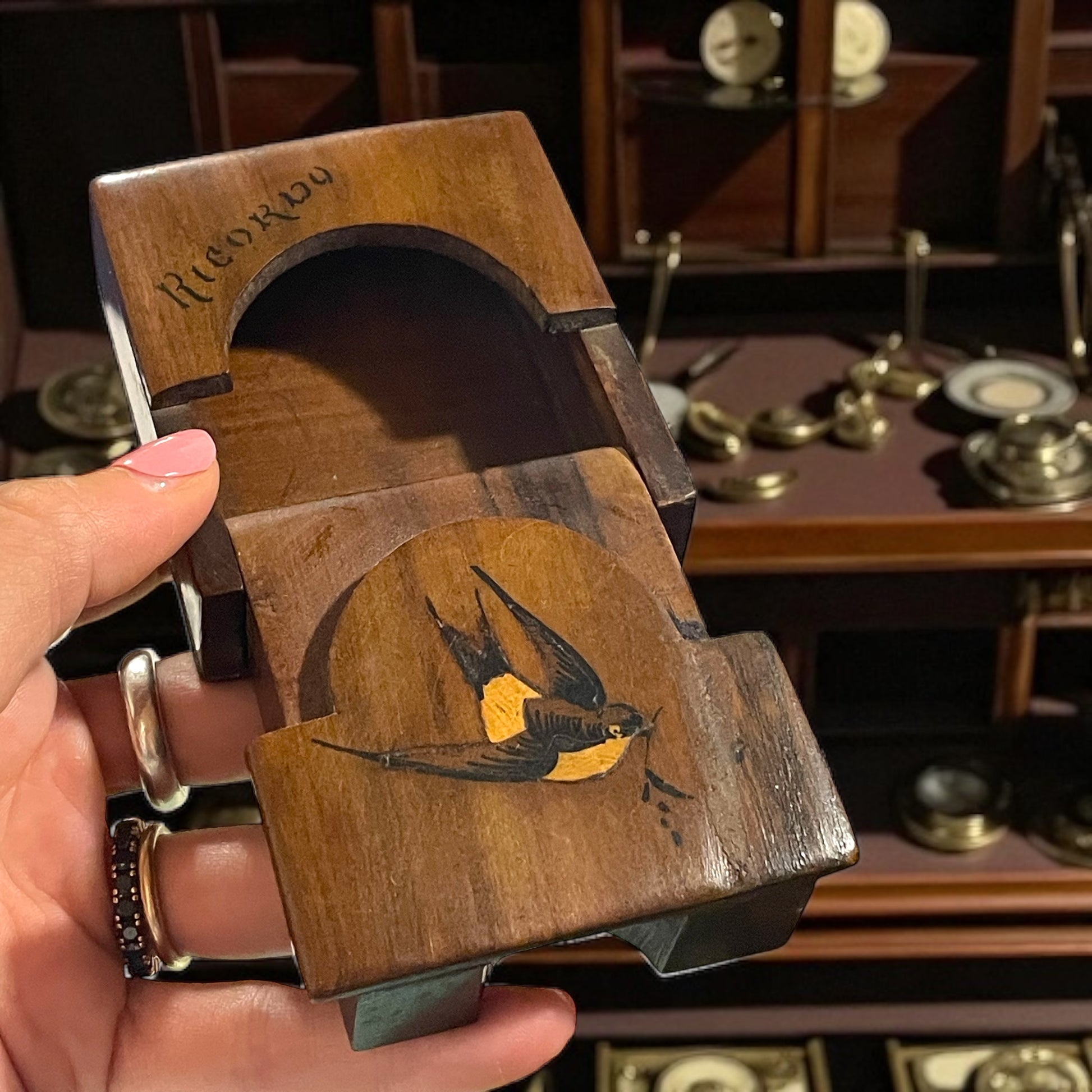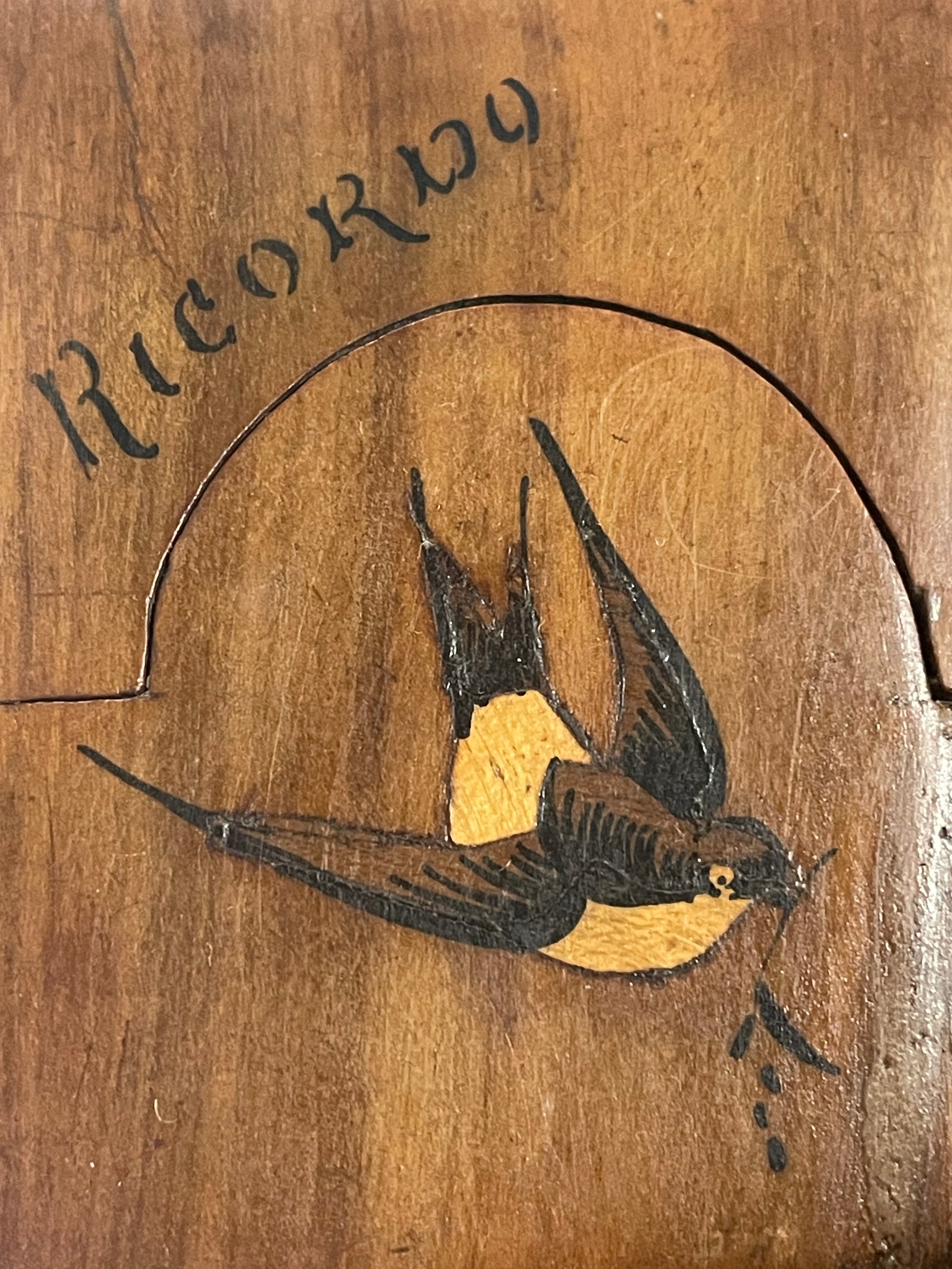 Ogni sera, prima di chiudere la bottega, posava l’orologio nel suo scrigno segreto. Non un orologio qualunque, e nemmeno un cofanetto qualunque. L’orologio gli era stato donato dal padre, quando aveva appena iniziato l’apprendistato. E quello scrigno… beh, quello era opera sua. Lo aveva costruito con pazienza, scegliendo un legno caldo e profumato… l’ulivo. Aveva intarsiato una rondine nella parte frontale — simbolo di ritorno, di casa, di legami che non si spezzano mai — e inciso la parola Ricordo, come un sigillo. Il meccanismo d’apertura era il suo orgoglio: niente cerniere, niente viti. Solo intarsi, incastri, e un po’ di magia. Scorreva in avanti, poi si piegava all’indietro, rivelando una morbida cavità foderata di seta azzurra, oggi appena sbiadita dal tempo. Forse il suo orologio è andato perduto. Ma questa custodia è ancora qui, testimone silenziosa di mani che sapevano creare, custodire e — amare.