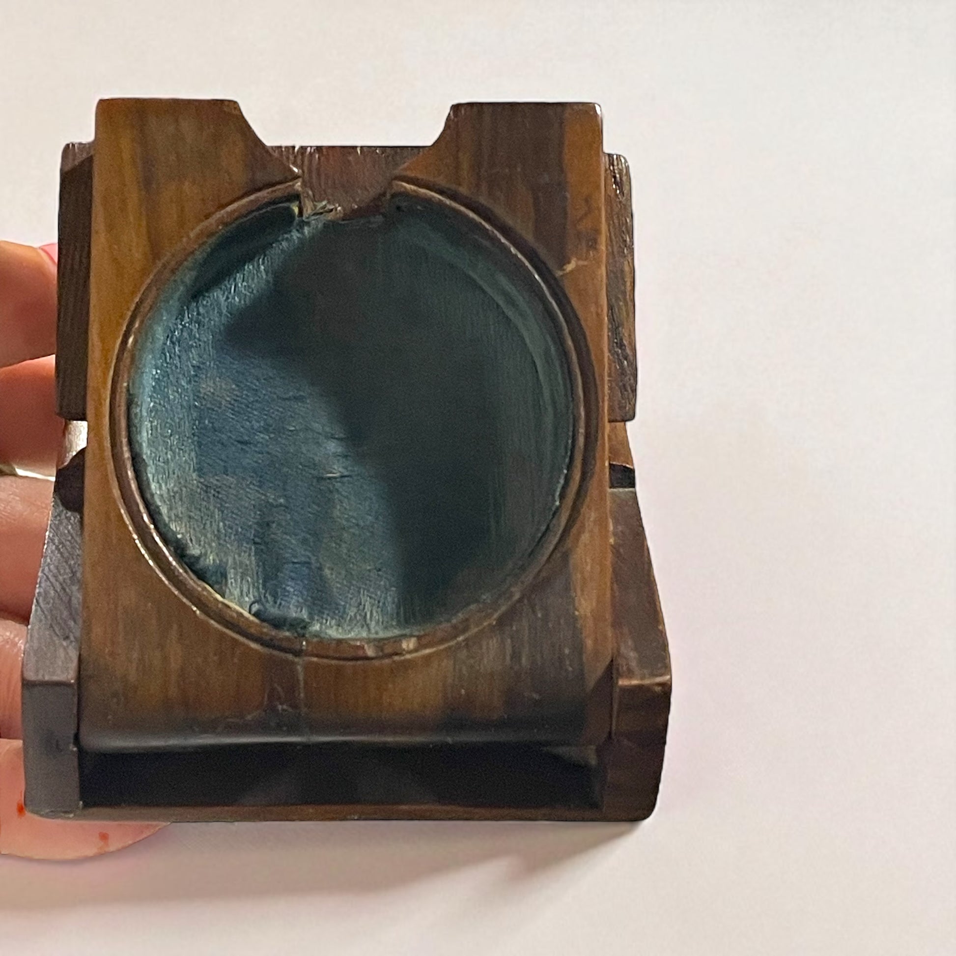 Porta-orologio da tasca di inizio Novecento in legno (probabile ulivo) con intarsio a rondine. Decorazioni: scritta “Ricordo” incisa a mano. Meccanismo: apertura scorrevole e ribaltabile, senza viti. Interno: alloggiamento foderato in seta azzurra, ancora parzialmente presente. Origine: artigianato italiano. Stato: molto buono, con segni del tempo coerenti all’epoca.
