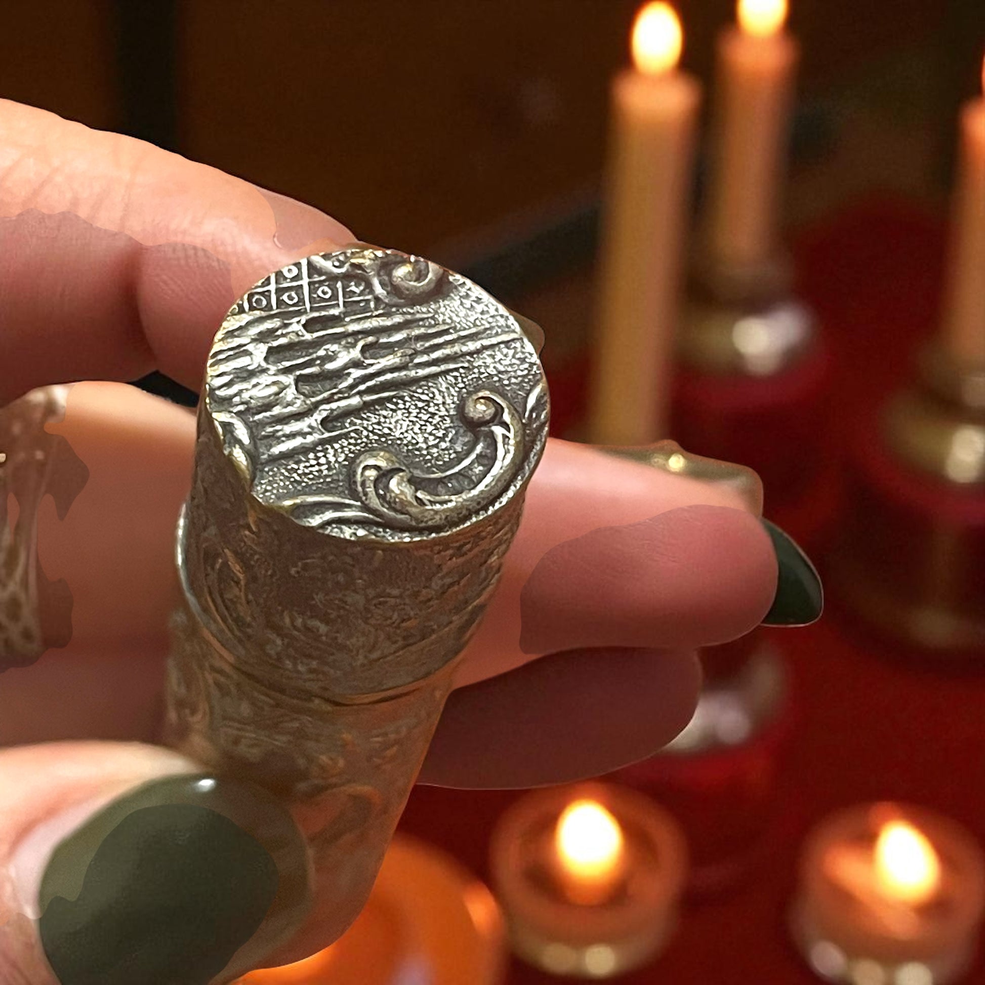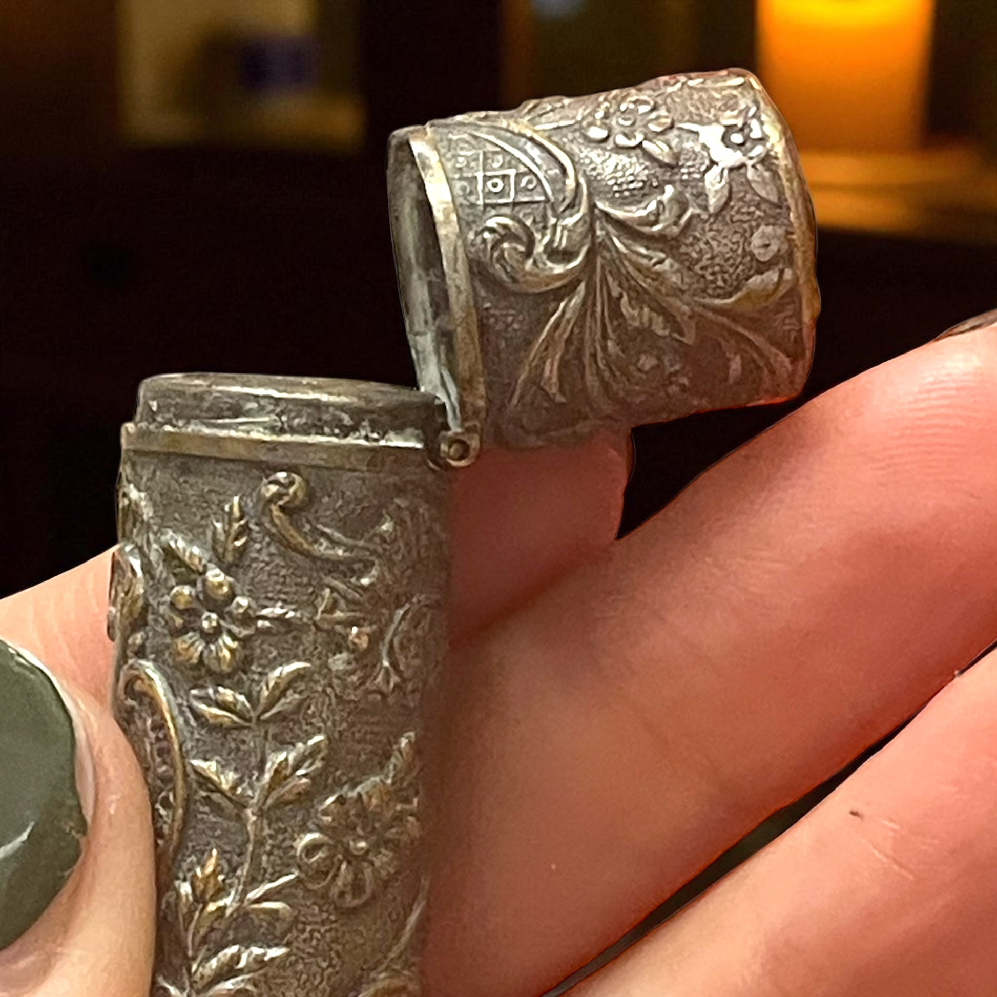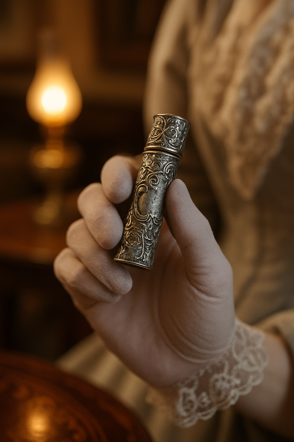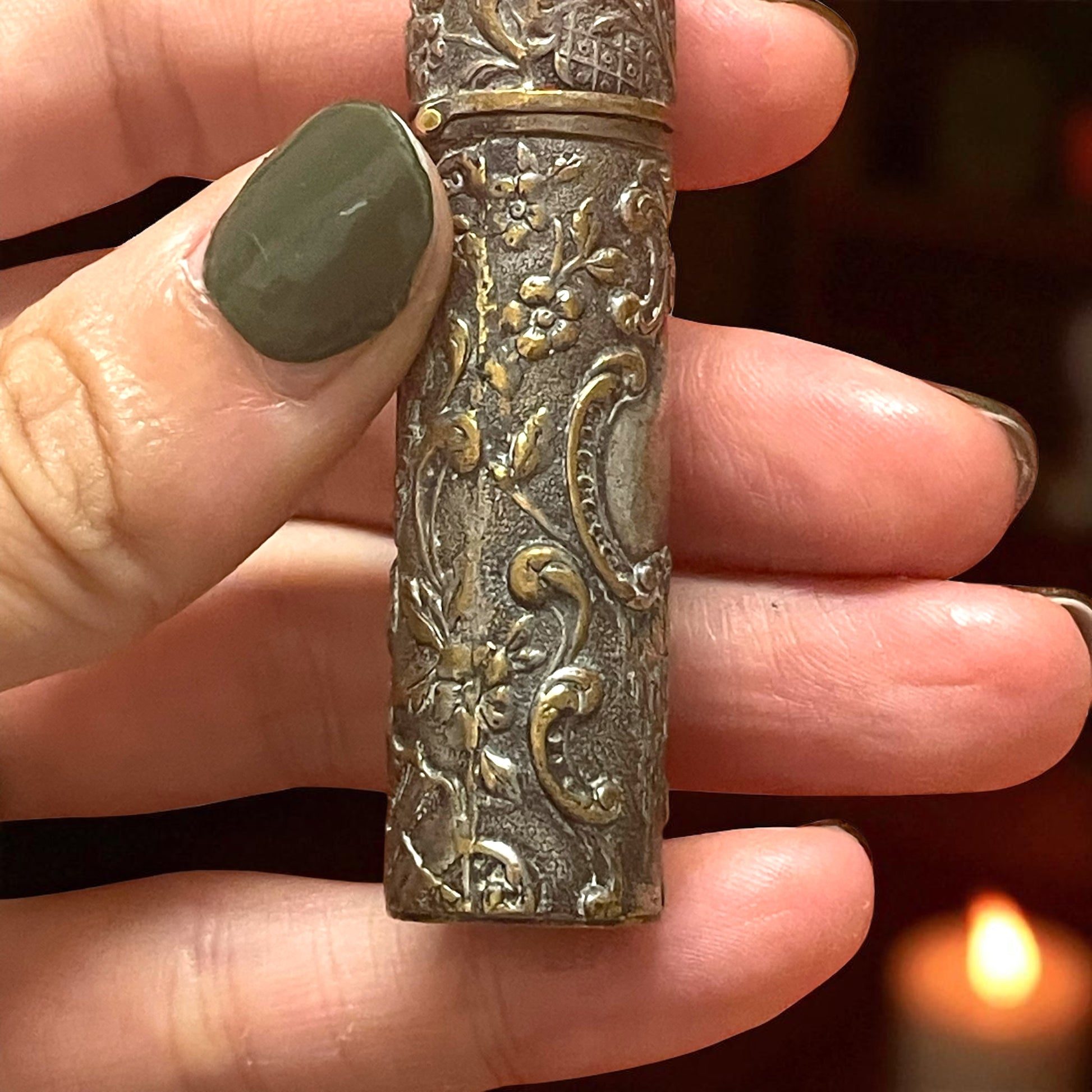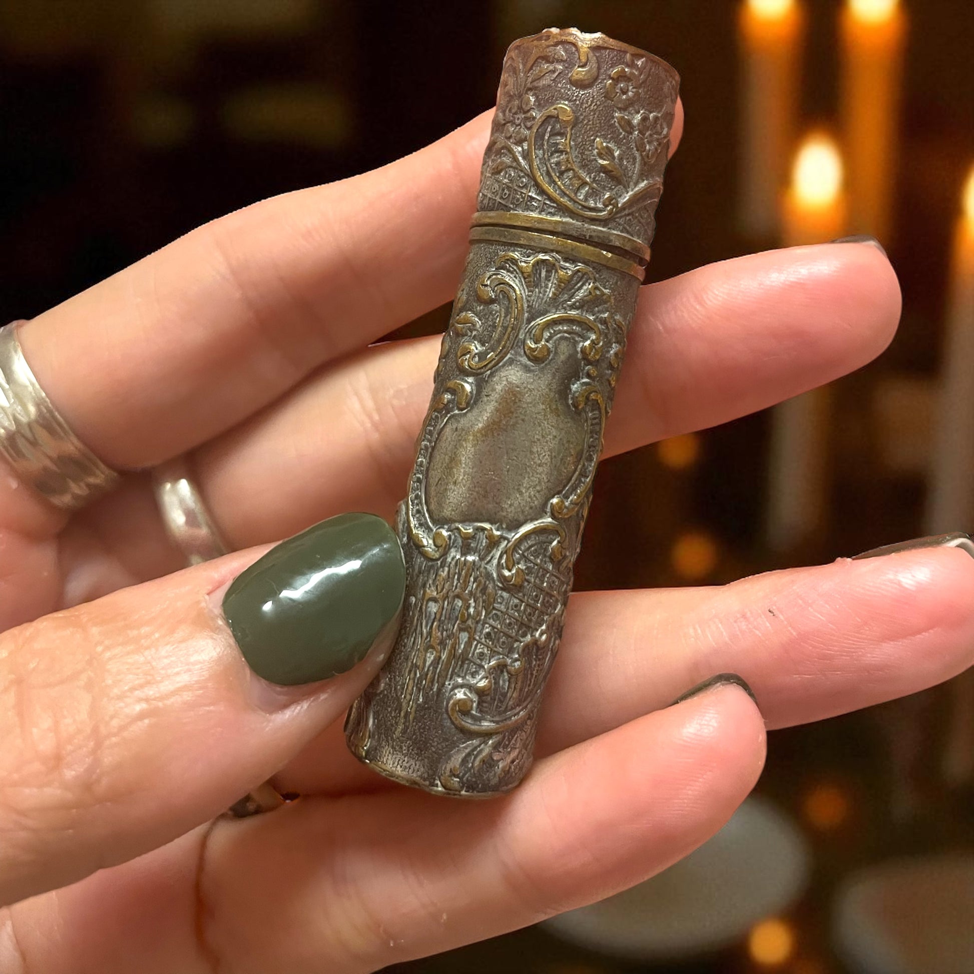 Tra le dita senti il peso di questo astuccio antico, riccamente cesellato a motivi floreali che danzano sulla superficie. Il coperchio scatta con delicatezza e rivela un minuscolo tubicino di vetro: custode silenzioso di essenze preziose, di profumi che un tempo accompagnavano le dame nei loro spostamenti. Immagina la scena: un salotto di fine Ottocento, un ventaglio che si chiude, e Lei - che, con grazia, apre il suo piccolo porta-profumo per un tocco discreto di fragranza. Il vetro proteggeva l’aroma originale, mentre il metallo decorato lo trasformava in gioiello da borsetta. Oggi, tra le tue mani, questo oggetto non è solo contenitore, ma frammento di eleganza intima, capace di evocare un tempo in cui anche i dettagli più piccoli erano rituali di bellezza. Chissà quale fragranza custodiva davvero? Una rosa intensa? Un’essenza d’ambra? Io propendo per un segreto profumo creato solo per lei.