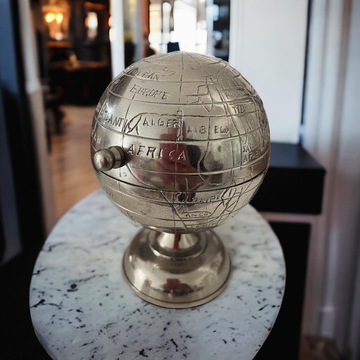 Must-have piece of modernism from the 70s, original from the period, ashtray in the shape of a globe that opens in shiny iron. Famous piece of the time, there were also the Bookends of the same "series".