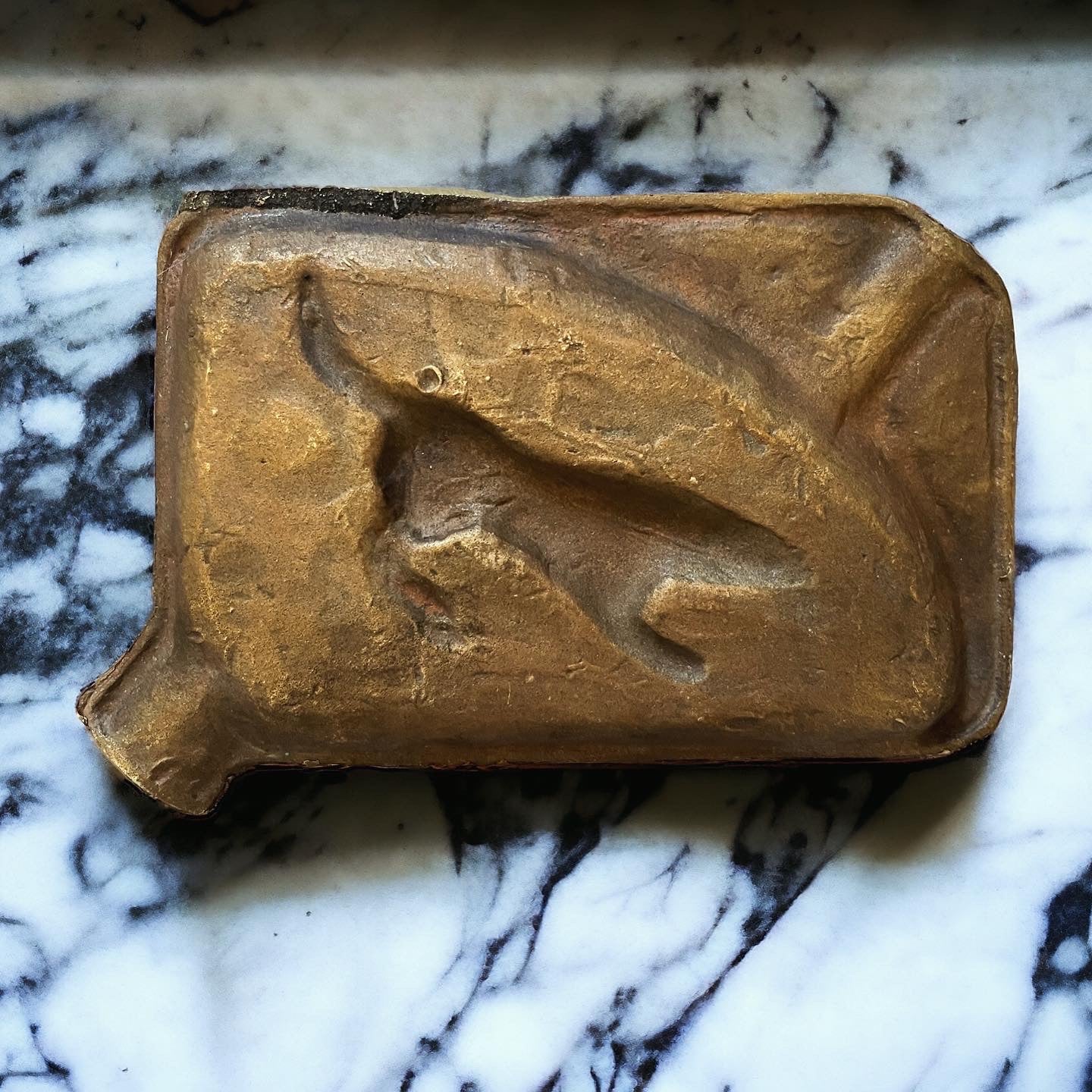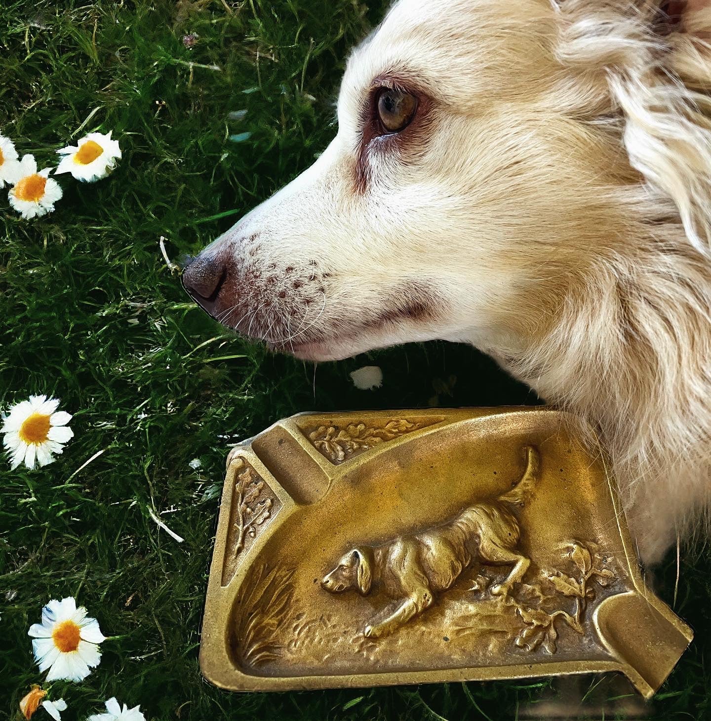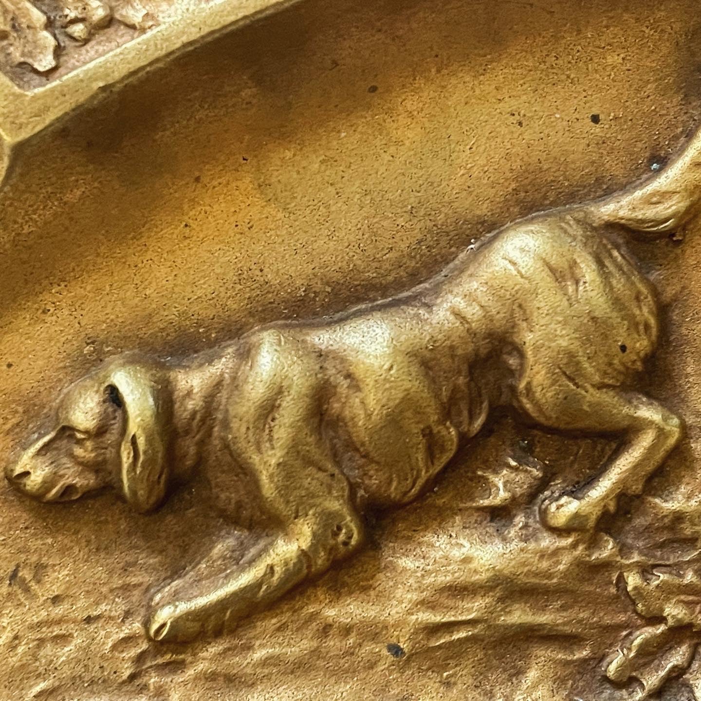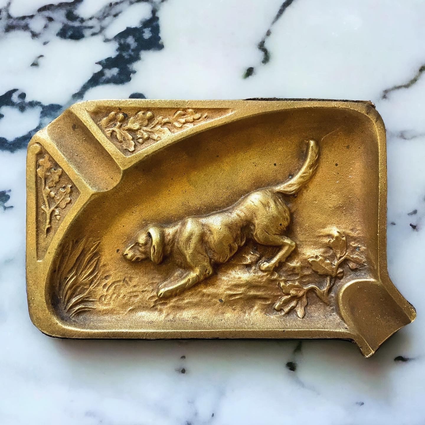 🐶 DOG NOT INCLUDED 🐶 beautiful antique bronze, bronze ashtray depicting a hunting dog in action among the foliage. Two cigarette holders, in the upper left corner floral decorations of holly. Beautiful patina of time, refined gift, a versatile jewel. Measures cm 14.5 x 9.5.